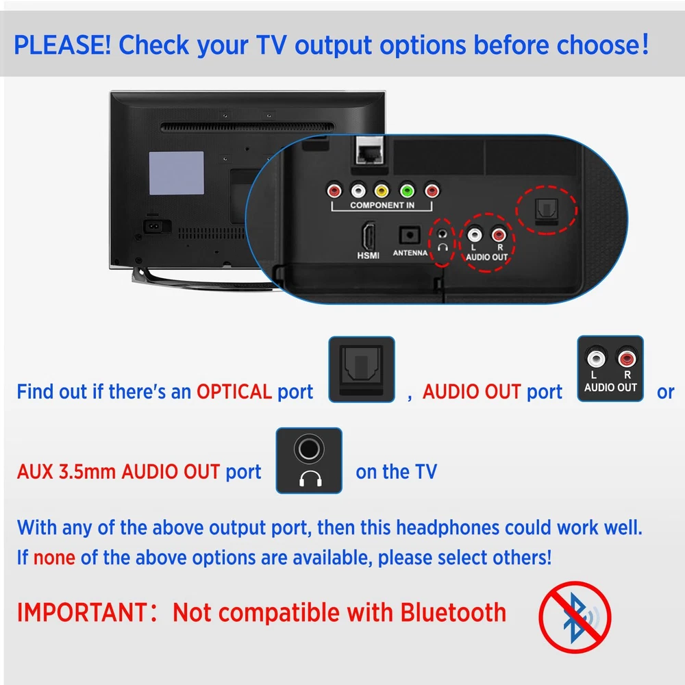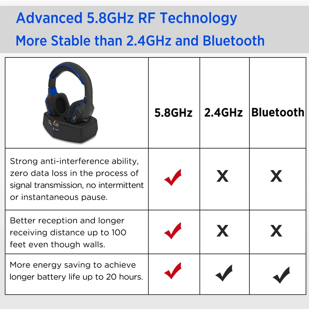 [๐๐ผ๐ป๐ด-๐ฟ๐ฎ๐ป๐ด๐ฒ ๐๐ผ๐ป๐ป๐ฒ๐ฐ๐๐ถ๐ผ๐ป, ๐๐ถ๐๐๐ฒ๐ป ๐ณ๐ฟ๐ผ๐บ ๐๐ณ๐ฎ๐ฟ] TV headphones wireless with 5.8GHz transmitter, more stable than 2.4GHz or Bluetooth. Ensure stable and reliable connectivity of up to 100ft (30m) even through walls. You could explore every corner of your home while enjoying your favorite programs. (Not with Bluetooth) [๐๐ถ๐ด๐ต-๐พ๐๐ฎ๐น๐ถ๐๐ ๐ฆ๐ผ๐๐ป๐ฑ, ๐ก๐ผ ๐๐ถ๐ฝ-๐ฆ๐๐ป๐ฐ ๐๐ฒ๐น๐ฎ๐] wireless headphones for TV provide high-quality audio that will help you feel fully immersed in the experience every detail of the soundtrack in total privacy and comfort. The superior sound not only to engage yourself in the content without any external distractions but also without disturbing others. [๐๐ฎ๐๐ ๐๐ผ ๐จ๐๐ฒ, ๐ฃ๐น๐๐ด ๐ฎ๐ป๐ฑ ๐ฃ๐น๐ฎ๐] Ready to use wireless tv headphones right out of the box, no pairing required. The set of TV headphone and RF transmitter dock are paired well in factory setting, you only need to confirm the signal connecting before using, very convenient to use for seniors/elderly. [๐๐ผ๐ป๐๐ฒ๐ป๐ถ๐ฒ๐ป๐ ๐๐ต๐ฎ๐ฟ๐ด๐ถ๐ป๐ด ๐ฎ๐ป๐ฑ ๐๐ผ๐ป๐ด ๐๐ฎ๐๐๐ฒ๐ฟ๐ ๐๐ถ๐ณ๐ฒ] With a built-in rechargeable battery, simply place the headphones on the charging dock to easily recharge. Enjoy up to 20 hours of uninterrupted use after a full charge. Please fully charge the headphones before first use. [๐๐ฑ๐ท๐๐๐๐ฎ๐ฏ๐น๐ฒ ๐๐ฒ๐ฎ๐ฑ๐ฏ๐ฎ๐ป๐ฑ, ๐ฆ๐๐ฝ๐ฟ๐ฒ๐บ๐ฒ ๐๐ผ๐บ๐ณ๐ผ๐ฟ๐] headphones are designed with high-quality, soft cotton material for both ear pads and headband. The length can be adjusted according to your needs. Enjoy a comfortable wearing experience during movie marathons or binge-watching sessions.