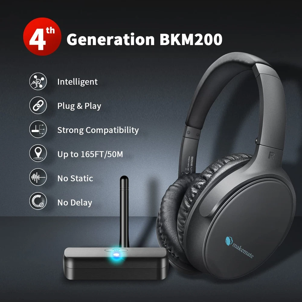 Recommended Uses: Devices with optical, coaxial, RCA or AUX audio OUTPUT, include: TV, Set Top Box, TV Box, , PC, , , MP3, iPod, VCD, Hi-Fi Stereo System, VCR, CD player etc. When using the transmitter the TV internal speakers might not work or become muted. This is TV dependent. BKM200 Headphone Specification: Weight & size: about 5.29oz /150g, 7.09in/180mm Headphone model: Wireless Bluetooth Support profile: Apt-X, HSP, HFP, A2DP, AVRCP Work time: about 15H Charging time: about 3H Standby time: about 300H Battery specifications: Rechargeable Li-ion Battery 3.7V; 300mAh Secure paring: 33ft / 10M Audio standard: 40mm, 32Ω, 110dB speaker Main function: Hi-fi Full Bluetooth decode, stereo voice, led indicator light, foldable design Transmitter Specification: Chip: Qualcomm CSR8670 Chipset Audio codec: A2DP, aptX, aptX-LL, SBC,AAC(APTX, APTX LL, AAC will need license cost) Support ports: Optical, Coaxial, RCA and 3.5mm AUX Operation range: Class I, 100-165ft/30-50M Input voltage/ current: DC 5V/ 500mA Size: 3.6x2.3x0.8in/91x57x21mm (Not including the antenna) Support dual link: can connect with pairs of wireless headsets at the same time Clearing pairing history: Double click power button What's in the box? Bluetooth Headphone Bluetooth Transmitter USB Android cable USB Type-C cable 3.5mm-3.5mm audio cable RCA audio cable Coaxial cable Optical Digital cable Charger 【UP TO 165ft/50m】Especially with the help of ANTENNA and Qualcomm new Bluetooth technology allows strong walls penetrability, up to 165ft / 50M wireless range, little static sound and few interferences of cutting out, ensuring constant perfect audio and image synchronization without delay. 【EASY SET UP】Simply plug the transmitter into a power source and TV’s audio output port, power on the headphone, they’ll auto-connect each other successfully within 3 seconds, and you should be good to go. with 99% of TVs on the market, supports OPTICAL / COAXIAL / 3.5mm AUX / RCA audio output. NOT with streaming video. 【MELODIOUS VOICE, FULL OF RICH LAYERS】Bluetooth 5.2 matching 40mm driver maximize clarity breadth, and balance, you the punch bass, clear human voice and crisp treble performance without distortion, let you enjoy high fidelity immersive stereo sound. 【CHARGING CONVENIENCE】Another level of charging convenience, charge the headphone anytime anywhere via the included Type-C cable and USB adapter. No need to put it back on the charging base away from the sofa. 【LONG-WEAR COMFORT & FEW SOUND LEAKAGES】Ergonomic design, stretchable earband and premium protein earmuffs offer you a comfortable wearing experience for long time use. The high-quality durable earmuff material will not damage after using for more than years. 90℃ rotating earmuffs fit different heads snugly, providing better sound protect, few sound leakages.