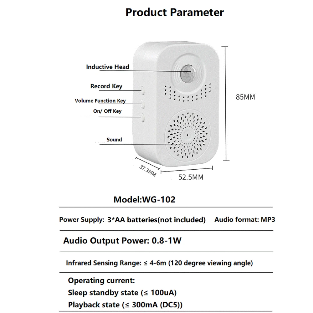 Product Description Welcome Infrared Chime Doorbell Wireless Adjustable Volume Door bell with Recording function Specifications: Color: White Size: 85*52.5*37.3mm Power: 3*AA batteries (not included) Material: ABS plastic Volume: 3 volumes adjustable Operating current: Sleep standby state (≤100uA) and Playback state (≤300mA) Features: Sensor: Sensor , no wiring is required. Convenient: Detect movement you will know anyone entering your setting area. Household Supplies: sensor convenience. Applications: Door suitable for home, business shops, stores, hotels, factories, doorway entrance place requiring either guest saluting function. Automatic.Automatic induction broadcasting,induction distance 4~6 meters. How to record: Long press the recording button to record,you can record what you want to say. Package Includes: 1x Doll Bell(Not included 3* AA Batteries) 1x Sticker If you have any doubts or uncertainty about this item, contact us with no hesitation, we are always here and will solve your problems. Thanks and wish you a nice day! About Us We dedicated to provide excellent products and services for all customers on ebay. hope we all can have a nice experiences on eBay. Payment We accept all verified payment through PAYPAL payment. Shipping Usually, Item will be shipped within 1-2 working day after full payment is received. Normally, you will receive the item in 5-7 days. Please contact us if you don’t receive the items after 10 working days after the payment If you have any questions about shipping, please feel free to contact us. Returns Always believe we can solve problems by communication if it comes to any problems about products or any others. If it comes to a return, the products must be intact and as original when you received, and should be within 30 days after you received it. Contact Us Work time: 9:00 AM to 18:00 PM Beijing Time You can contact us at anytime you want, we will reply all messages at the first time. powered by