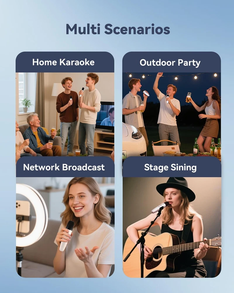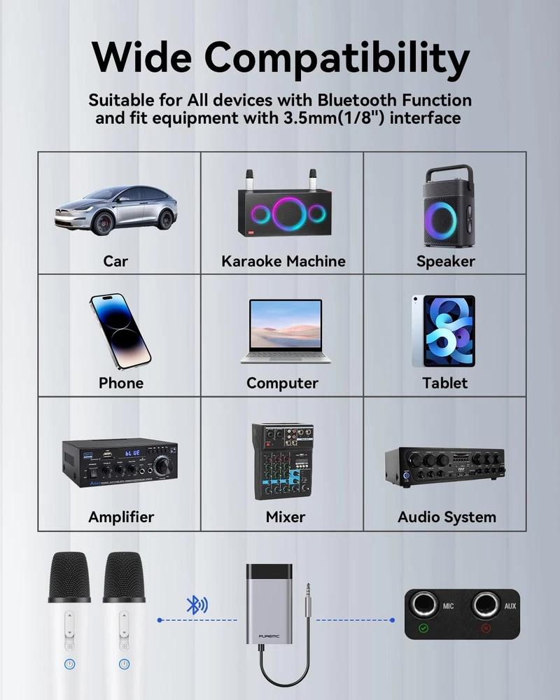 mic for car microphone 3.5mm microphone portable microphone rechargeable mics aux microphones bluetooth cordless microphone karaoke wireless karaoke mic bluetooth wireless mics car stereo microphone wireless microphone karaoke cell karaoke plug in microphone karaoke with score bluetooth car karaoke microphone karaoke microphone wireless microphone bluetooth microphone wireless microphones wireless mic ♪ CRYSTAL CLEAR SOUND QUALITY- This car mic with aux built in a high sensitivity professional moving-coil microphone core, enhance signal stability, no delay, this aux microphone feature professional anti howling anti-jamming technology, clear voice from distortion. You can enjoy reliable wireless Bluetooth connectivity without the hassle of cords and cables. ♪ 8 SOUND EFFECT - This TV karaoke microphone with 8 sound effects, standard, effect, female effect, children effect, monster effect, concert effect, living room effect, K.T.V. effect. Just enjoy your party time. ♪ RECHARGEABLE MICROPHONE & RECEIVER - wireless microphone for car which microphone and receiver both have a built in rechargeable battery. This rechargeable microphones lasting for 15 hours of non-stop playtime and microphone receiver bluetooth 5.2 allows up to 4 hours working time. ♪ WITH MULTI DEVICES & APP - This wireless mic with receiver can connect with car and speaker via AUX cable, also with Bluetooth-enabled devices like , TV, Laptop, Pad, etc..(but the receiver needs to connect to a speaker.) ♪ PLUG TO USE & NO NEED PAIR - This mic on car has a dual bluetooth microphone wireless for singing and a small Bluetooth receiver connecting to the AUX IN interface, transmission range can be up to 10 meters, portable and convenient.