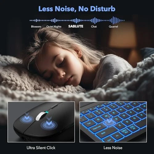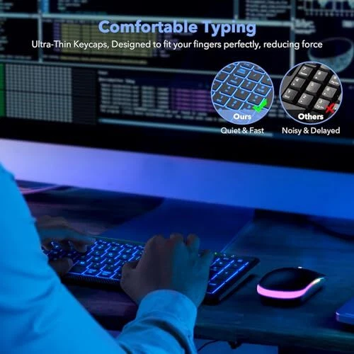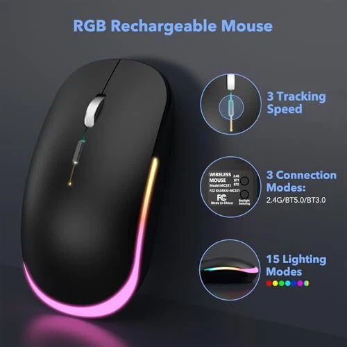 7 BACKLIGHTS TO CHOOSE:The wireless keyboard has 7 switchable backlight colors + an RGB illuminated wireless that automatically switches colors to create a cool and eye-catching working atmosphere, so you can type easily even in the dark. Note: The keyboard backlight has three brightness levels to choose from and they can all be turned off when you don't need the light. MULTI-DEVICE, 99% COMPATIBILITY:The keyboard and provide three types of wireless 2.4G+BT1+BT2 connectivity which is with 99% of devices and operating systems (Mac, Windows, iOS, Android,Ipad, etc.), in addition it can connect up to three devices at the same time and can be switched between these three devices at will. Note: Switching is done via the buttons above the number keys. RECHARGEABLE AND LONG-LASTING:Say goodbye to the hassle of frequent battery replacements, the wireless keyboard and are equipped with 1500mAh and 650mAh batteries respectively, and the keyboard can standby for 365 days on a single charge (the can standby for 270 days). Note: Backlight condition and working time will affect the standby time. POWER SAVING :Keyboard and enter automatic hibernation mode after 10 minutes/8 minutes of inactivity, respectively, and can be woken up by pressing any key or moving the ; both are equipped with an on/off switch; the power indicator light flashes when the power is low. SAVE 20% SPACE:The compact and slim appearance of the wireless Bluetooth keyboard saves up to 20% of desktop space compared to traditional keyboards, so you can easily fit it into your backpack, which makes it an excellent choice for both business and travel! LESS NOISE, MORE FOCUS:Thanks to the soft film keys of the keyboard and the silent click design of the , the wireless keyboard and kit reduces noise by more than 95%, allowing you to focus more, you can click to your heart's content in any quiet environment (e.g.: library or late at night)! Don't worry about disturbing others. COMFORTABLE TYPING:The wireless bluetooth keyboard's slightly concave keycaps are designed to fit your fingers perfectly, reducing force and relieving your finger aches and pains due to long hours of typing, while the sensitive response of the keycaps and the perfect travel keys (0.1MM) provide you with a unique typing experience.