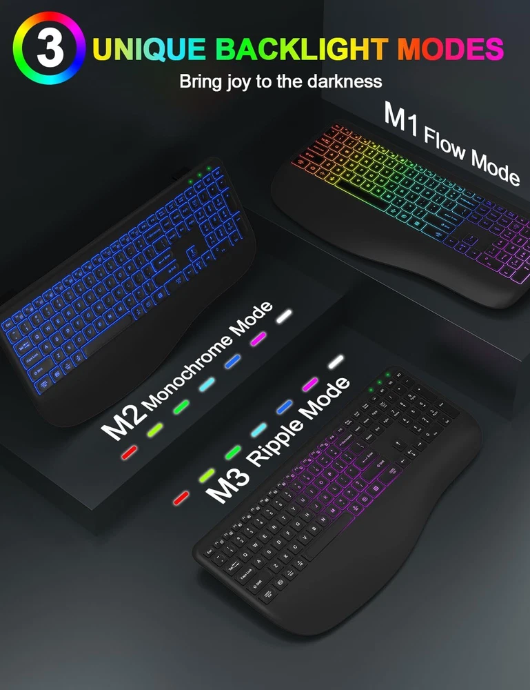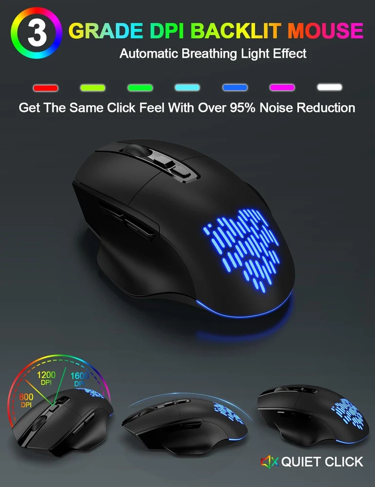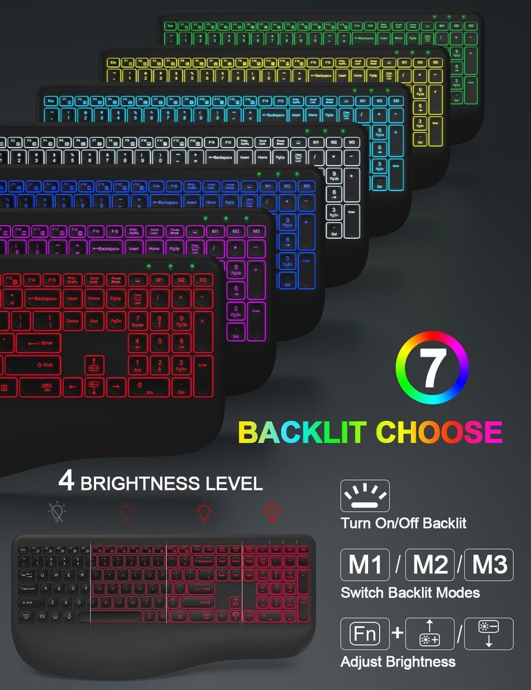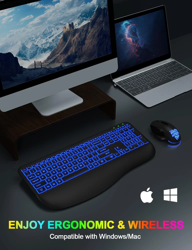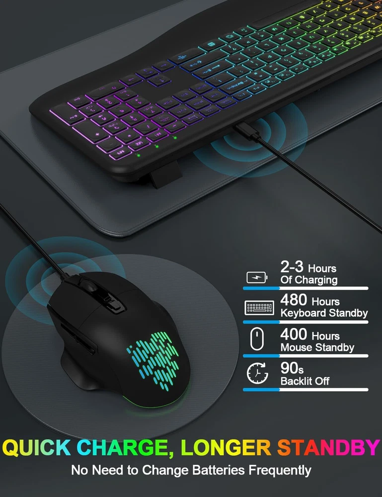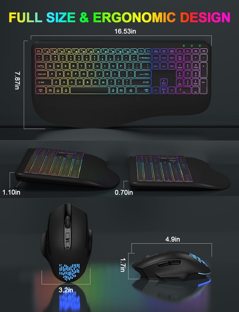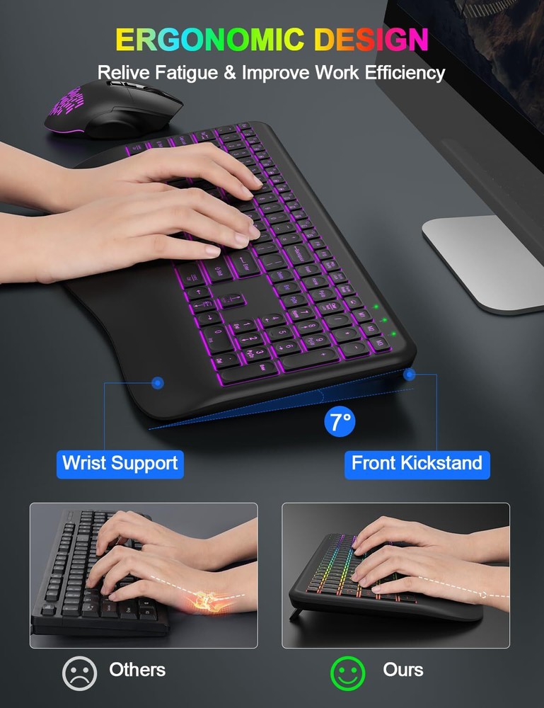 ▶【Gorgeous Backlit Combo】:The wireless keyboard comes with 7 colors and 9 gorgeous backlit effects to choose and a RGB mouse that automatically changes color. They can provide you with more ambiance and visual aesthetics typing experience. The clear light-up letters make it easier to find your keys in the dark. This wireless keyboard mouse can perfectly balance work and games will be your best choice. You can also adjust the light brightness at any time or turn off the light to save power. ▶【Comfortable & Ergonomic Design with Wrist Rest】:This wireless keyboard with wrist rest and ergonomic foldable stand design provides support for your wrists and reduces twisting, helps your wrist to be in a comfortable position and better body posture. Ergonomic Design for Great Comfort & High Efficiency. The backlit wireless mouse adds a finger rest that perfectly matches the position of the finger, reducing stress on the wrist and hand muscles. ▶【Reliable and Stable Connection】:Enjoy the plug and play simplicity without installing the hardware. The 2.4GHz wireless mouse and keyboard combo shares the SAME ONE USB RECEIVER and supports many systems. It comes with a Type-C adapter make which can work with up to 99% of type-C devices. With the improved 2.4GHz wireless technology, our wireless keyboard mouse combo gives up to 33ft fast, stable and reliable connectivity. ▶【Rechargeable and Smart Energy Saving】:The backlit wireless keyboard and mouse combo built-in rechargeable 1600/500mAh lithium battery, when the backlight is off and fully charged, they provide up to 2-3 months of usage on one charge, say goodbye to the hassle of frequent battery replacements. In addition, the wireless keyboard mouse combo built-in intelligent power saving, idle for 60s, the keyboard enters sleep mode, idle for 90s, the mouse enters sleep mode. ▶【Less Noise, More Focus】:Thanks to the scissor key mechanism of the keyboard and the silent click design of the mouse, the wireless keyboard and mouse combo reduces noise by more than 95%, allowing you to focus more. Don't worry about disturbing your family when typing or clicking anymore. So you can enjoy a quiet comfortable typing. ▶【Universal Compatibility】:This backlit wireless keyboard and mouse is compatible with most Windows/Android/Mac OS/IOS and other operating system. Works well with desktops, chromebook, PC, Laptop, computer and more.(Reminder: Multimedia keys may not be fully compatible with Mac OS systems). ▶【12 Months Service】: Our backlit wireless keyboard mouse combo provide 12 months service, even after the Amazon return period, if you have any questions, you can write to our via Amazon email, we will reply you within 24 hours and help you until solve all questions.
