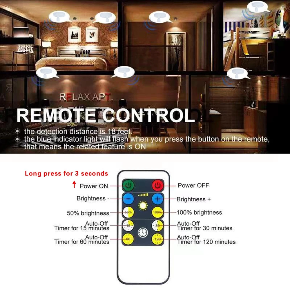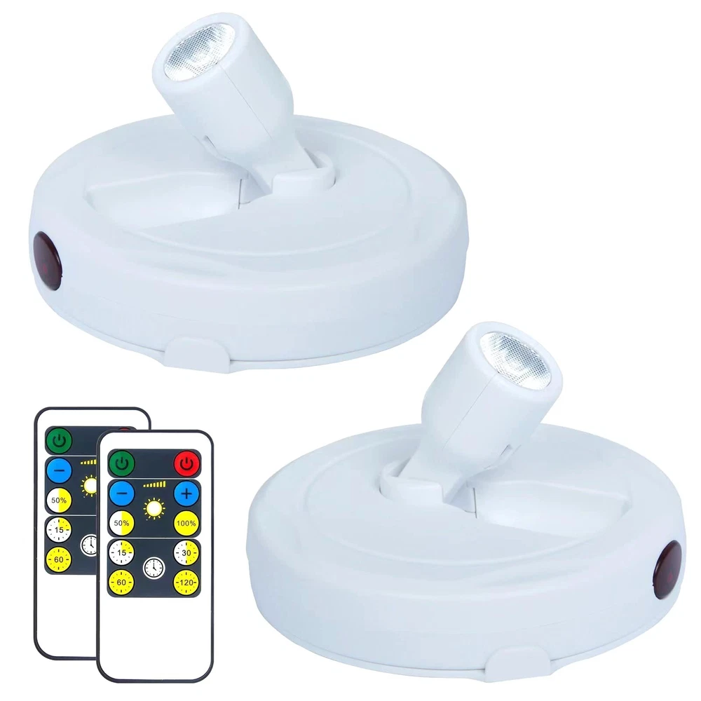80 Lumens, Long lasting super bright LEDs, 3000K warm white light, 0.6W, DC 4.5V, lifespan is 80000 Hours. The remote control powered 1*CR2025 button cell battery. Please firstly pull out the battery insulation sheet of remote. Packing List - 2 x Spot lights - 2 x Remote - 2 x Hook and Loop Tape - 4 x Screws - 1 x User Manual 2 Pack Remote Control Battery Spotlights: You can press the light switch button to turn the light ON/OFF or use the remote, operate portable spotlight within 18 ft. When you use the remote control to turn on the light, press and hold the power "ON" for 3 seconds Multi Directional Lighting Head: LED spot lights head can swivel up and down 90°, left to right 350°, almost any direction you need it (each product dimensions: 4.1"L x 4.1"W x 2.6"H) Timer & Dimmer Presets Uplight Indoor: Remote Control ON, OFF, Timer (15/30/60/120 minutes) & Dimmer (increase brightness, decrease brightness) Wireless Battery Operated Picture Lights: The artwork lighting is powered by 3 AA batteries (not included), battery run time is 40 hours for full brightness. Long lasting super bright LEDs, 80 Lumens, 3000K warm white light Simple to Install: Easy to install puck lights with provided hook and loop tape or screws. Can use indoor anywhere like hallway, kitchen, cabinet, closet, basement, hutch, pantry, wardrobe, bookcase, shelf, jewelry display, decorative shelf or highlight Christmas decorations, art display, painting, picture, wall photograph, artwork, statue, model, dartboard, portraits, plants