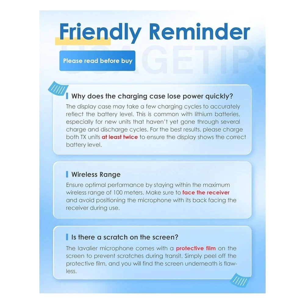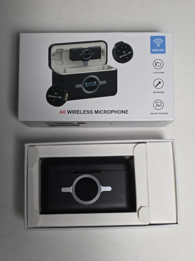 Condition: Open box Lincisoonic 4.8 out of 5 stars (623) Wireless Lavalier Microphone for iPhone/Android, Lapel Mics with USB-C Plug-Play, Mini Mic with 2.4GHz Noise Cancellation, Charging Case Included, 300ft Range for Stream, Vlog, TikTok and YouTube Professional Hi-Fi Sound Capture: Experience 48kHz/24bit studio-grade audio recording, capturing every detail with precision. The 70dB signal-to-noise ratio (SNR) ensures clear audio even in noisy environments. With a 112dB sound pressure level (SPL), it records loud sounds without distortion. Advanced HD Noise Cancellation 2.0 minimizes background noise, making it perfect for streaming, interviews, and high-noise recordings Multi-Mode Functionality: The microphone offers multiple sound modes, including noise reduction, original sound, reverb, and mute. Easily switch modes with the MFB button, and enjoy low latency for precise lip sync, simplifying post-production. The LED indicator on the receiver clearly displays the current mode, while the charging case screen shows the remaining battery level, helping you manage your work effectively Quick Auto-Pairing, No App Required: Remove the microphone from the charging case. Insert the transmitter into your phone's port and it will automatically pair with the RX receiver without the need for Bluetooth or app setup. If your phone runs low on battery during filming, you can connect an external power source through the RX receiver's input port to charge your phone and ensure uninterrupted recording Extended Battery Life and Long-Range Transmission: Built with dual microphones (0.3oz each) and up to 14 hours of continuous recording on a single charge, and the charging case providing an additional 42 hours of use, the microphone is built for long recording sessions. It supports unobstructed transmission up to 300ft Range, providing stable, clear audio even during extended recording sessions Ultra Portable and Hands Free: Designed for ultimate convenience, this lightweight microphone clips effortlessly onto your clothing or attaches securely with the magnetic option, providing hands-free, high-quality audio recording anytime, anywhere. Whether you're vlogging, streaming, or conducting interviews, its seamless setup makes it a go-to solution for creators and professionals who need flexibility on the move 【Compatibility Notice】 For optimal performance, avoid using adapters or bulky phone cases, as they may hinder the mic receiver’s connection. Please confirm your device’s compatibility with the selected microphone model before purchasing. 【 Battery Calibration】 The charging case display may take a few cycles to show the correct battery level. This is normal for lithium batteries, especially for new units. Charge both TX units at least twice to ensure accurate readings.