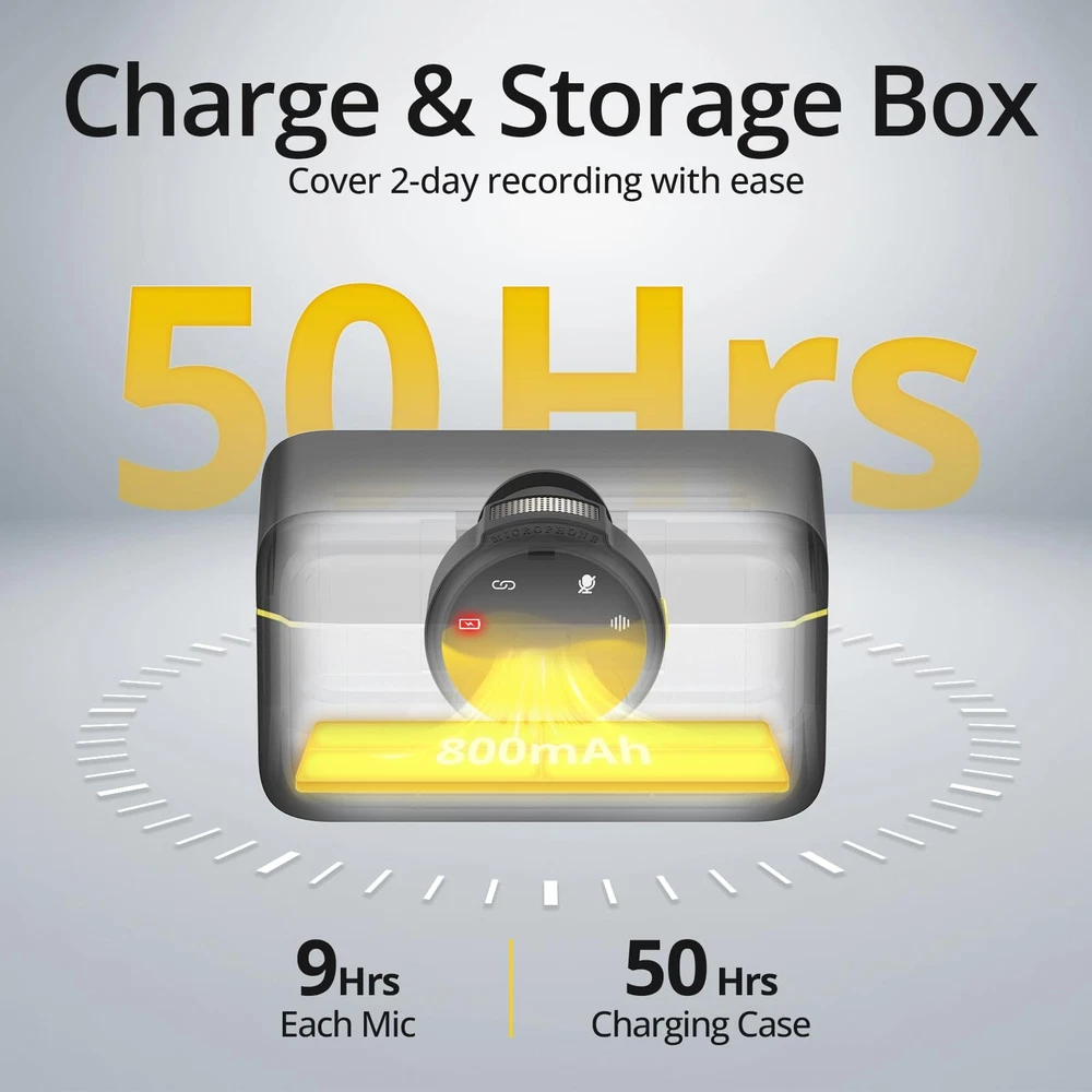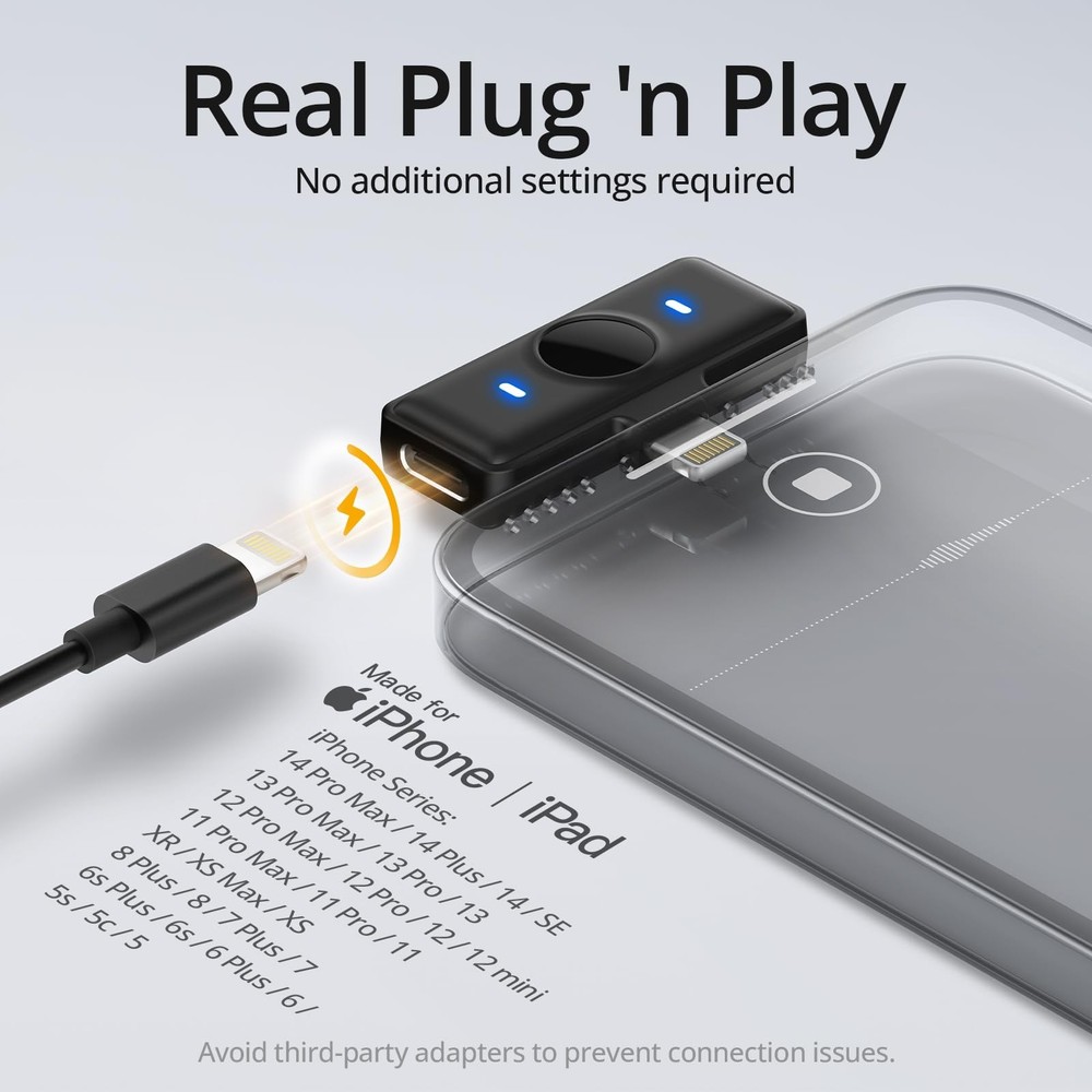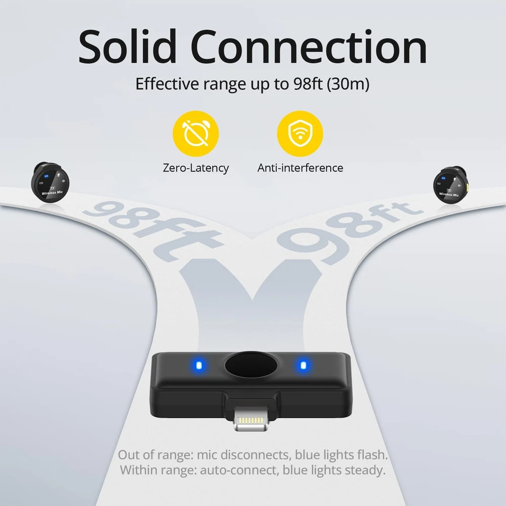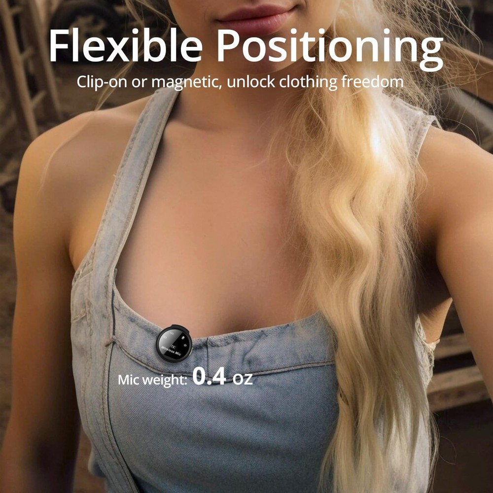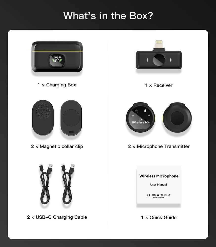 "Experience unparalleled sound quality and ultimate convenience with 's ultra-light wireless lavalier microphone for iPhone. Weighing a mere 9g, this clip-on or magnetic microphone is designed for all-day comfortable wear, blending seamlessly with any outfit. Capture crystal-clear audio with an advanced 48KHz Sound Shield chip, while -click denoise technology reduces background noise. The plug-and-play design connects directly to your iPhone's charging port—no app or Bluetooth required. Our charging case provides up to 50 hours of power, and each mic holds a 9-hour charge, making it ideal for long recording sessions. With a stable connection range of up to 165ft and built-in anti-interference technology, you'll enjoy uninterrupted vlogging wherever you go. Perfect for creators on the move, this wireless lavalier microphone set includes everything you need: 2 mic transmitters, a portable charging case, clip magnets, and a charging cable. Plus, enjoy peace of mind with 's . Capture every moment effortlessly with 's wireless microphone for iPhone." 【Real Plug & Play】Connect directly to your iPhone via the Lightning port—no app or Bluetooth needed. The reinforced MFi Certified lightning plug ensures a stable connection. Note: Not with USB-port iPhone models or Android devices. 【Ultra-light & Flexible】Enjoy the ultimate comfort with this 0.5 oz wireless microphone for iPhone. The detachable magnetic clip design frees you from clothing constraints, allowing you to adjust the audio capture angle effortlessly. 【-Level Recording】Capture every moment with exceptional sound clarity. This wireless lavalier microphone for iPhone features a 48KHz Sound Shield chip, delivering clearer and richer audio. 【-Click Denoise】Achieve effective noise reduction with just click on this iPhone microphone. This feature ensures your voice remains crystal clear while background noise is precisely cut. 【Magnetic Charging 】Stay organized with a portable magnetic charging . Each mic lasts up to 9 hours, with a total of 50 hours from the charging case. Enjoy all-day use of your wireless lavalier microphone. 【Stable Connection】Enjoy uninterrupted recording up to 165 ft with this wireless lavalier microphone for iPhone. Zero latency and anti-interference technology ensure clear, consistent sound capture even from a distance. 【Caution!!】Please select the correct microphone model for your device before purchasing. Avoid adapters or thick cases, as these may cause connection issues. 【Packing List】Mic Receiver (lightning) x1, Mic Transmitters x2, Charging Case x1, Clip Magnets x2, and Charging Cable x1.
