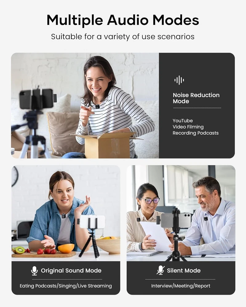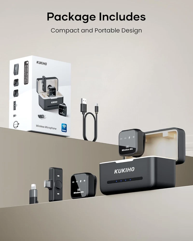 Wireless Lavalier Microphone for iPhone Mic 2 (2 TX + 1 RX + Charging Case) Product Details Microphone Form Factor: Lavalier Item dimensions L x W x H: 4.72 x 3.35 x 2.17 inches Power Source: Battery Powered Number of Batteries: 1 Lithium Polymer batteries required. (included) Material: Metal, Plastic Signal-to-Noise Ratio: 60 dB Hardware Platform: Iphone Number of Channels: 1 Frequency Range: 2.4 Ghz Manufacturer: KUKIHO Item Weight: 1.76 ounces Product Dimensions: 4.72 x 3.35 x 2.17 inches Item model number: DX12 Mic Batteries: 1 Lithium Polymer batteries required. (included) Material Type: Metal, Plastic Size: Mic 2 (2 TX + 1 RX + Charging Case) Battery type: Lithium Polymer Recommended Uses For Product: Interviews, Podcasting, Video Recording, Vlogging Brand: KUKIHO Model Name: Kukiho-FT Connectivity Technology: 2.4Ghz Wireless Connector Type: USB Type-C Special Feature: Battery Indicator Light, Clip, Mute Function, Noise Reduction Compatible Devices: Smartphone Included Components: Charging cable, Charging case, Microphone transmitter, Receiver, iOS port converter Polar Pattern: Omnidirectional Item Weight: 0.11 Pounds Plug and Play: This professional wireless lapel microphone is easy to operate, requiring no Bluetooth or app. Simply plug the receiver into your phone and turn on the microphone for automatic pairing. Equipped with advanced DSP noise reduction chips, it effectively reduces background noise, ensuring clear and clean audio for your videos. Wide Compatibility: The upgraded wireless microphones are compatible for iPhone, iPad, Android phones, as well as Windows and Mac computers (includes adapters for iOS and TYPE-C ports). Suitable for video recording, podcasts, vlogs, TikTok, YouTube, Instagram, Facebook, and more. Portable Wireless Microphone for iPhone: Designed for portability, this small and lightweight lapel microphone wireless can be handheld, clipped to clothing, or magnetically attached for convenient use in any environment. The iPhone microphone offers stable transmission within a range of 164 ft in open areas. Ideal for content creators, TikTokers, and YouTubers, it provides stable, low-latency recording for both indoor and outdoor use, ensuring the best experience for long-distance recording. Up to 80 Hours of Battery Life: The wireless mic comes with a 1200mAh rechargeable case for easy storage. It only takes 2 hours to fully charge the podcast microphone, with a working time of up to 10 hours. With the charging case, the entire set can be charged 4 times, extending the battery life up to 80 hours. Perfect for long outdoor recordings, podcasts, and live streams. Additionally, the microphone can charge your phone while in use. 360° Omnidirectional Sound Pickup: The mini recording lapel mic features 360-degree omnidirectional sound pickup and high sensitivity, clearly capturing every audio detail regardless of the surrounding environment. The package includes two mini microphones, allowing two people to participate in video recording together. Suitable for YouTube, videos, live streaming, podcasts, blogs, vlogs, Zoom, interviews, online meetings, online education, TikTok, and singing recordings.