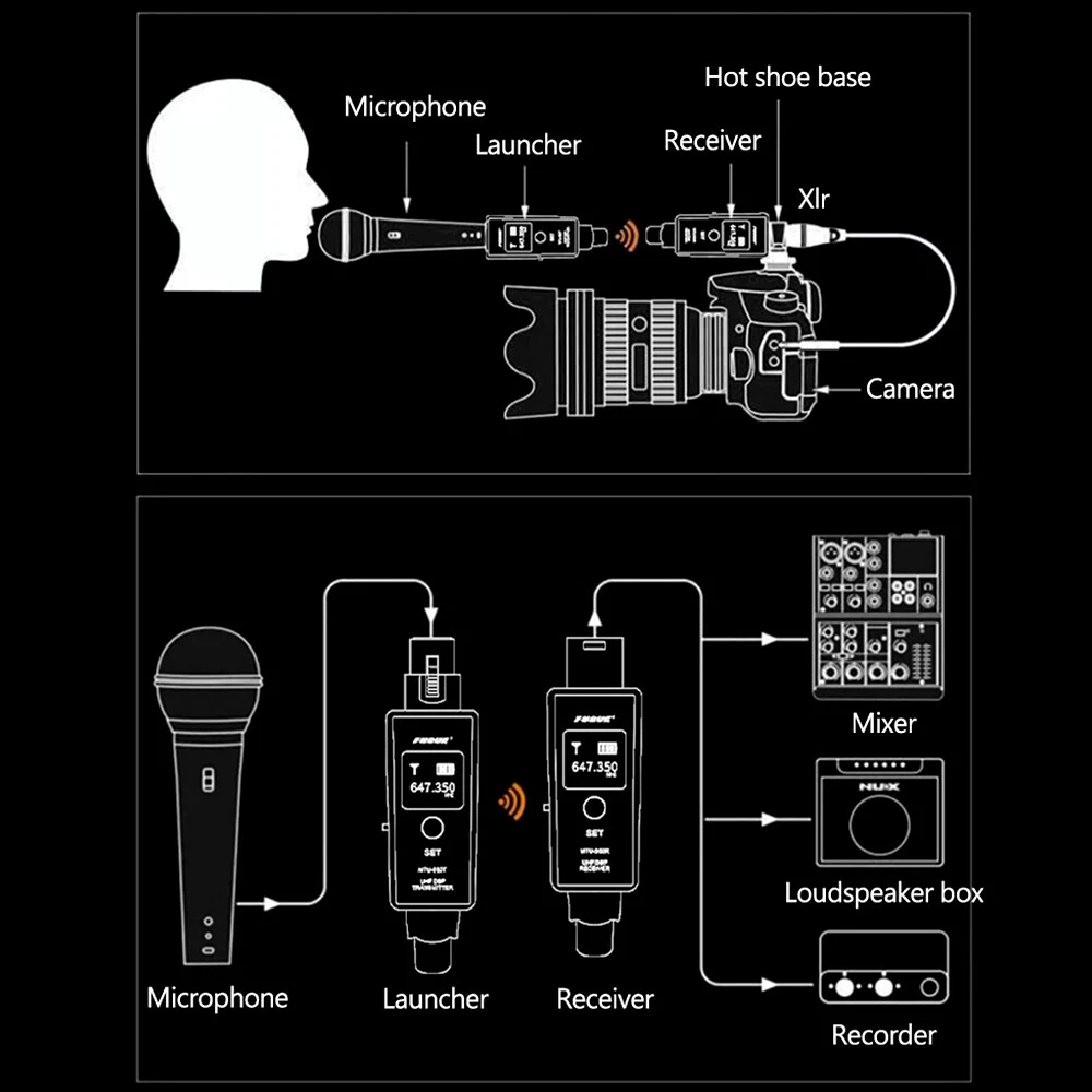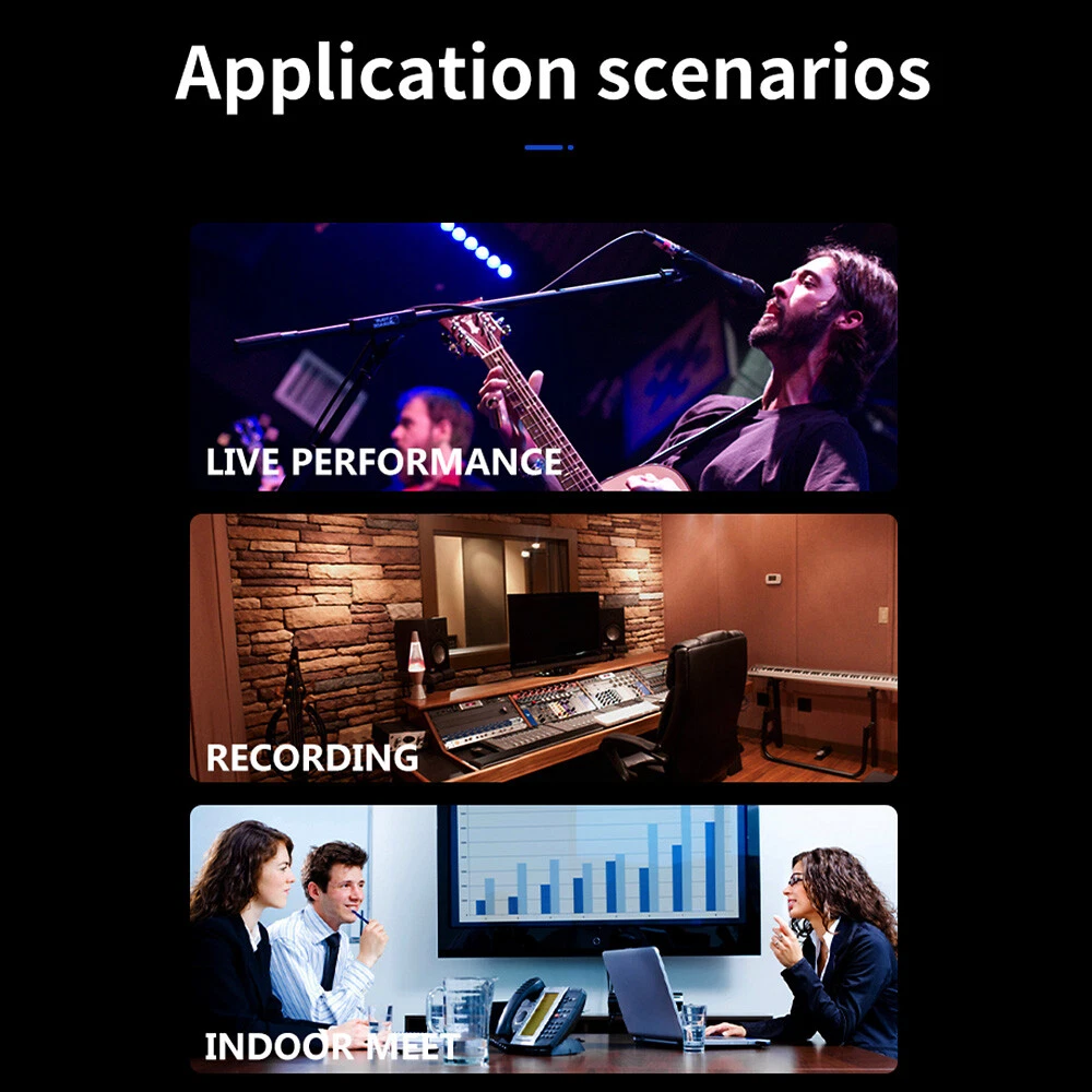 Features: The frequency, battery indicator, and signal strength bar are clearly and intuitively displayed on the LED screen. Built in dual antenna that resist to WiFi and electromagnetic wave, etc., features of anti-jamming and has longer transmission distance(30m). 24-bit/48kpbs high resolution, with Mic/Line two modes to switch from. Strong, stable and fast receiving signal. Small wireless transmitter system, lithium battery inbuilt, plug and play, easy to operate. Support with dynamic microphone and condenser microphone with built-in power supply. Equipped with XLR female to 6.35mm male microphone adapter, compatible with audio mixer, recorder, speaker, PA system, amplifier, etc. Provide stable and reliable wireless transmission. Specifications: Material: ABS Number of Channels: 6 Transmission Distance: About 30 meters Duration: Stable 6 hours Power Supply: Built in USB charging Delay: About 5ms Sound Dynamic: 110dB Sampling Rate: No 24bit / 48 kpbs audio Frequency Response Range: 20Hz-20kHz Antenna Impedance: 50Ω SNR: 110dB Battery: 3.7V 400mAh Li-ion battery Support Microphone Types: Dynamic microphone and condenser microphone with built-in power supply Item Size: 70 * 30 * 30mm / 2.76 * 1.18 * 1.18in Item Weight: 200g / 7.05oz Package Weight: 300g / 10.58oz Package Size: 16.5 * 13.5 * 5.5cm / 6.50 * 5.31 * 2.17in Packing List: 1 * Transmitter 1 * Receiver 2 * Transfer Plug 2 * Cable 1 * Manual (English) Wish you an enjoyable shopping!