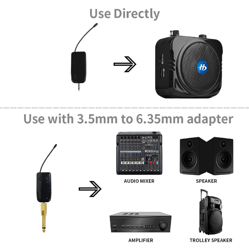 【2.4G Wireless Transmitter】Adopt advanced 2.4G wireless transmission technology .The wireless headset microphone system is easy to pair, just turn on the transmitter and receiver power switches, the blue light will flash for approximately 2s, indicator light stops flashing after a successful match, and then you can use the wireless headset microphone for voice amplification, no further action. 【For Two People】 This wireless microphone can be used by two people at the same time. Freely match the headset you want, of course, you can also use only one microphone. The working method is to pair two transmitters with a receiver, so your device only needs to have a microphone jack to complete the work of two people. No set, plug and play.160 ft (50m) stable transmission distance at open area, delivering loud, clear and high fidelity sound quality to your audience. 【2 Audio Jack Supports & Wide Compatibility】The headset microphone supports 1/8"(3.5mm) and 1/4"(6.35mm) jack we provided, which can be used with portable pa system, karaoke machine, voice amplifier, mixer, large power speakers, multimedia, bus speaker etc. 【Clear Sound Quality】This microphone headset equipped with high sensitivity condenser microphone which can offer high quality sound transmission and clear voice.Note: This is a 2.4G wirless microphone NOT Bluetooth wireless microphone! NOT work with your PC,iPhone, iPad,Mac,Smart Phone etc! 【Widely Use】The wireless headset microphone is lightweight and comfortable, exquisite appearance, small size and easy to carry, farewell to the long cable. This wireless microphone headset allows you to move around more freely and show yourself. Ideal for teaching, fitness guidance, public speaking, trainers, stage performers, business dialogues, conferences, speech, promotions, game playing, web podcasts, YouTube, outdoor live, yoga instructors, ball game podcasts, etc.
