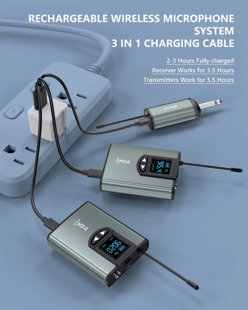 Excellent Audio Performance - Wireless lavalier mic system offers high-quality sound transmission and clear voice at operating via the mic system's noise-reducing technology. There are 3 different mics, a lavalier mic, a headset mic, and a short line mic, providing you with different choices. The mics' built-in condenser chip is more sensitive and clearer. The wireless mic has stable signal and wide transmission distance. In the absence of obstacles, the transmission distance can reach 300ft. Multi Applications - This dual wireless headset microphone system is ideal for living performances like preaching in church, weddings, teaching, presentations, school plays, training, public speeches, interviews, or video and audio recording. It can also serve as a nice tool for fitness /exercise instructors. Two guys can use the microphone at the same time during video shooting or recording. Which could prevent the interference of using 2 single wireless mic systems. Value Accessories in Wireless Mic Set - Dual wireless mic system kit is equipped with 3 Adapters (2 TRS adapters, 1 TRRS adapter); 3 Different Mics: 2 Headset Mics, 1 Short Line Mic, 2 Lavalier Lapel Mics; 2 Windproof Fur Shields, and a 3-in-1 USB Charging Cable. The rechargeable wireless transmitters and receiver can be used right out of the box. Select the lapel or headset or shortline mic, plug into the transmitter, turn on the mic system, and after the system automatic pairing, plug & play. Wide Compatibility - The YM-2 wireless receiver has a 1/4" plug that could work with a mixer, PA speaker, and amplifier. Once plugged in the 6.35 to 3.5 adapter, you can connect the receiver to any mobile device with a 1/8" jack, such as DSLR camera, digital camera, laptop, desktop, smartphones. And for smartphones/tablets without a 1/8” jack, you will need an extra adapter cable(not included in the package). Note: the mic system can't be used with Macbook and bluetooth speakers. Adjustable Frequency Channel&Volume - Dual wireless lavalier microphone system delivers 32 frequencies for each transmitter. 2 transmitters have different channels and won't interfere with each other's signals. Selectable frequency provides you more choice when there is frequency interference, press buttons on the bodypack transmitter, and choose an interference-free frequency. Also, there are 21 voice volumes, adjust the volume on the transmitter according to your needs, conveniently to use.