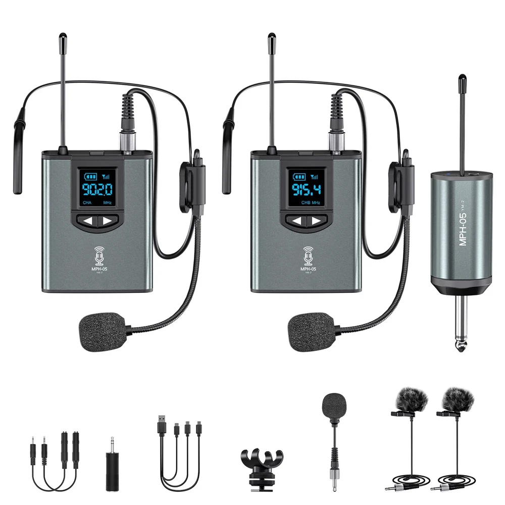 Wireless Microphone System with Dual Transmitters Receiver Lavalier and Headset Mic for Professional Studio or Live Performances