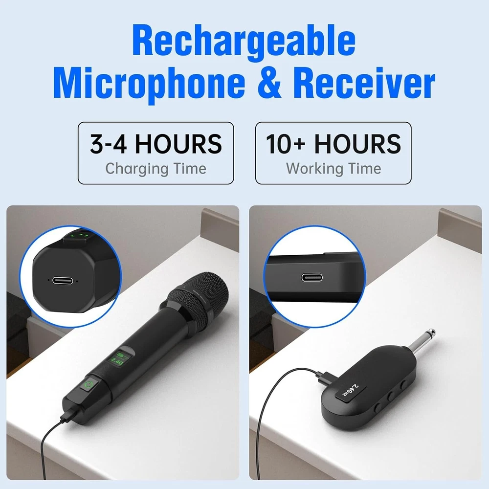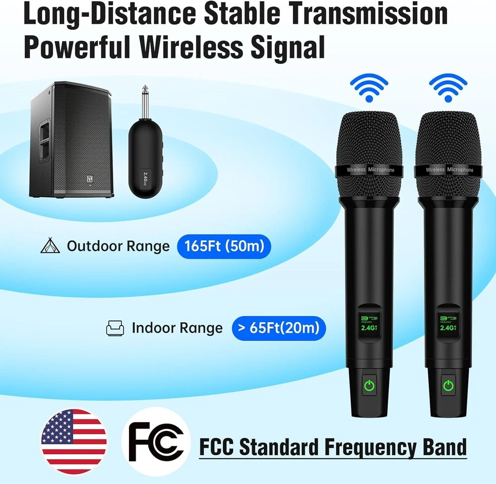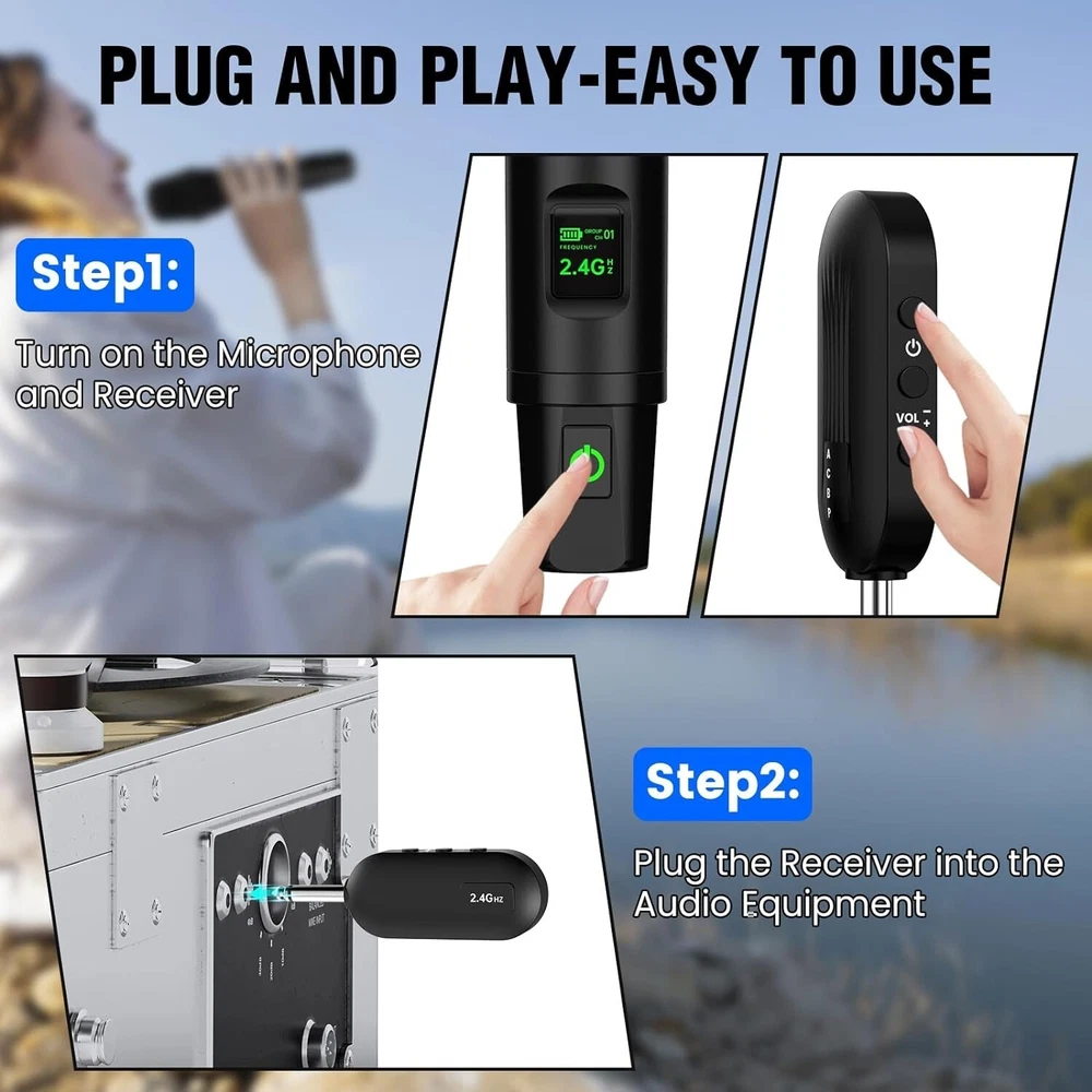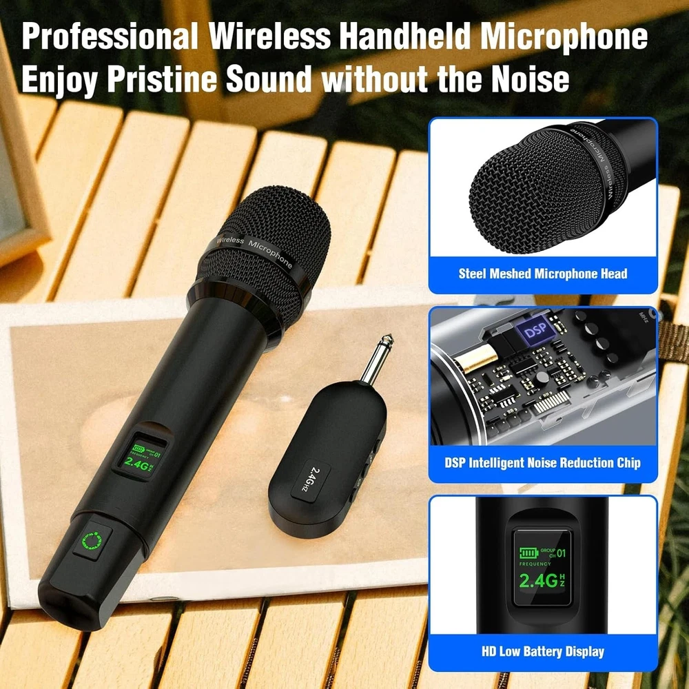 -Brand New - Never Used - Questions: Feel free to ask any Questions - BOX: Never Opened - DESCRIPTION: đŸŽ€ă€Karaoke Microphone Wireless】Wireless Handheld Microphone makes of exquisite technology 2.4GHz Signal Transmision which makes the connection Outdoor Range up to 165FT (50m)/Indoor Range >65FT, provides a stronger clearer signal and better sound quality, reducing the possibility of interference and dropouts.0 delay! It’s very suitable for family karaoke, churches, weddings, conferences, and small stage performances. đŸŽ€ă€High Sound Quality Microphone】 Our wireless mics are engineered to keep the true sound of your voice. Built-in professional High-Density Sponge and noise reduction technology, which picks up clear, pure and full sound, It also reduces annoying background noise and maximizes the sound quality of your voice. đŸŽ€ă€Plug and play】Auto connect, just only plug in, and you're ready to go—no complicated setup required. Whether you're a tech whiz or a first-timer, these mics are designed for ease of use. long press the power switch to turn on the Cordless Microphone. đŸŽ€ă€Wireless Rechargeable Microphones/Receiver】The Wireless Microphones and Receiver can work for 10+ hours and only takes 3-4 hours for a full charge. You can view the connection channel and remaining power via the LED screen on the microphone. This wireless microphone doesn't require you to replace the battery, you can simply charge it via the Type-C charging port at the very bottom of the microphones. đŸŽ€ă€Support Multiple Device】Enjoy pristine sound without the pesky feedbackEnsuring a smooth and heartfelt performance. Our professional wireless microphone Receiver with 3.5mm or 6.35mm. Compatible with Karaoke Machine, Audio Amplifier, Pa System, Mixer, Voice amplifier etc. TIPs: Does not support Bluetooth, such as phones, tablet. - OFFERS: Reasonable offers are considered, LOWBALLERS, Best price and Lowest askers will be ignored - all sales final/no refunds/ no exchanges/ no returns - Disclaimer: I do not own the brand's trademarks, logos, pictures, or products posted. I do not intend to infringe on copyright. I find such content available on the internet. Contents are considered fair use. - Wireless Microphones, Professional Wireless Microphones System Set with 6.35MM(1/4") and 3.5MM(1/8") Rechargeable Receiver for Karaoke Singing, Church, Speech, Wedding, PA System (Black)