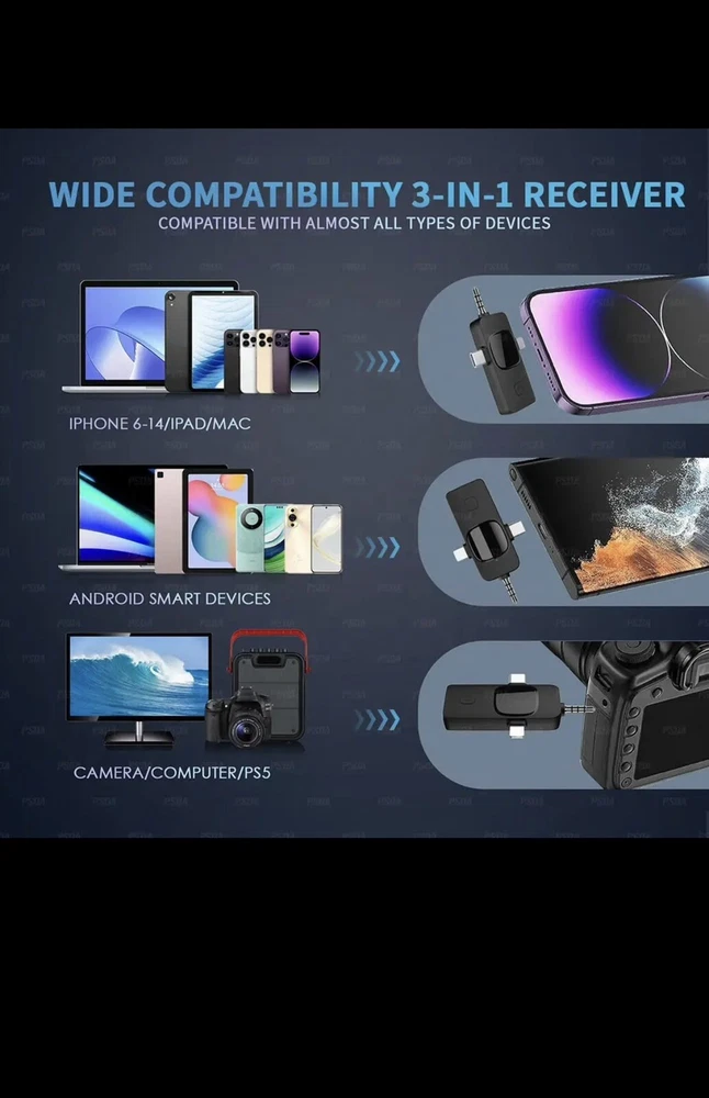 This wireless microphone is perfect for live performances, podcasts, and online meetings. It is a 3in1 model that is compatible with iPhone, USB, and 3.5mm jack. The microphone is designed to clip onto the lapel of your clothing, making it hands-free and easy to use. It features a plug-and-play function, making it easy to connect to your device without the need for complicated setup. The microphone also has an on/off switch, allowing you to control when you want to be heard. It is suitable for both Android and Apple devices, and it comes in a sleek black color.