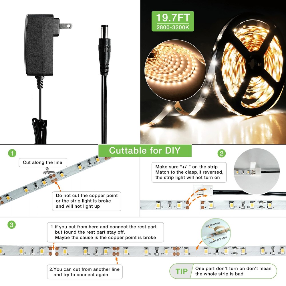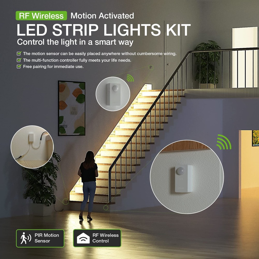 Wireless Motion Activated LED Strip Lights,19.7FT LED Strip Lights with Power Adapter,RF Wireless Motion Sensor Control Dimmer,Timing,Warm White (1×Controller+2×Motion Sensor) 【Wireless Motion Sensor】It only works with the controller and requires 2PCS AAA batteries. When it detects motion,it will give out a RF signal to the controller to turn on/off the load.Turn on the Light Sensor, and the sensor will only detect motion when the ambient brightness is lower than 35LUX to save energy 【Multi-function Controller】Auto/On/Off mode, Time-delay 15s-30s-60s-180s-300s-900s, Dimmable 20%-100%, the perfect design provides you with a variety of choices 【Cuttable/Expandable Strip Light】Wireless motion activated LED light strip with built-in 360 high-quality SMD2835 lamp beads/2520ml, 50000+ hours of long life. You can DIY cut it or extend it with the included 11.81-foot extension cord 【Reliable range and technology】The barrier-free detection range is 5-8 meters, and the wireless transmission range is 7-20 meters.The mature and reliable low-power wireless sensing technology brings more convenience to your life 【Safe to use, flexible application】Power Adapter runs on DC12V-24V, which is safe for children and the elderly. You can place the wireless sensor anywhere, it is very suitable for stairs, living room, kitchen, etc