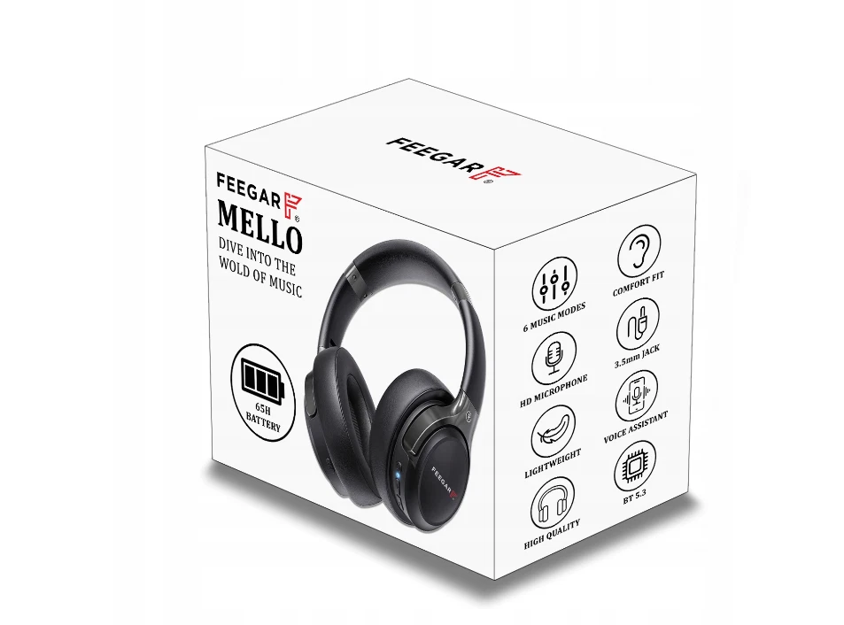 Wireless On-Ear Bluetooth Headphones 65H Battery Life Deep Bass Sound Quality Feegar MELLO black PRE-ORDER! Until the premiere, we're reducing the price to 199zł! A true leader among BT headphones on the Polish market in terms of operating time! We tried to achieve the best possible combination of precise sound and comfort of use, which guarantees long hours of listening to music in the highest quality. Thanks to the improvement of the battery and the use of a new chipset, the headphones can work on battery for up to 65 hours. The product is 100% NEW and UNUSED. The product from Polish Distribution is 100% original. Factory packed by the manufacturer. The set includes: Feegar Mello headphones 3.5mm Jack Cable USB Type C charging cable User manual in Polish/English/German/Czech Original packaging Description: Mello is the latest version of Feegar Bluetooth headphones. It is a Polish brand in the consumer electronics industry. Our wireless headphones with a microphone are distinguished by high-quality sound and a very comfortable design with soft ear pads. The latest Bluetooth 5.3 connection ensures stable and fast signal transmission , and if necessary, you can connect the device using a 3.5 mm audio cable . Polish project Feegar Mello was designed by a team of specialists from Feegar Polska. The Feegar team took care of the functionality of the device, the best parameters on the market and the aesthetics of the final design. These are modern headphones that will significantly improve the comfort of use. Key advantages: Long Battery Life - has a high-capacity 500mAh battery , which is enough for up to 65 hours of listening to music / 950 hours of standby Bluetooth 5.3 - the latest BT standard Automatic Pairing - the headphones automatically connect to the phone via BT Optional 6 music modes - 6 EQ modes: Pop, Rock, Vocal, Jazz, BassUP, Classic Multipoint - ability to connect 2 devices at once 3.5mm audio cable - can be easily switched to wired mode when power is turned off HD Microphone - thanks to the built-in microphone you can make phone calls Foldable Design - the headphones have a foldable design, making them easier to carry USB Type C Fast Charge - fast USB Type C charging, 5 minutes of charging will allow up to 3 hours of listening to music All Day Comfort - soft and comfortable ear pads ensure comfort during long-term use Universal to use - adjustable headband makes it easy to fit any head Parameters: Name: Feegar Mello Bluetooth version : V5.3 HD microphone Talk time: max 65 hours Music playback time: max 65 hours Standby time: up to 950 hours Wireless range: up to 30 m Charging time: 2.5 hours Fast charging port - USB Type C Supported profiles : A2DP / AVCTP / AVDTP / AVRCP / HFP / SPP / SMP / ATT / GAP / GATT / RFCOMM / SDP / L2CAP Speaker diameter: 40mm Input voltage/current : DC 5V/1A Frequency response: 20Hz ~ 30kHz Impedance: 32Ω±15% Sensitivity: 116.4 ± 3 dB Support for two devices at once Battery: 3.7V/ 500mAh Dimensions: 185 x 162.5 x 82 mm Weight: 180g