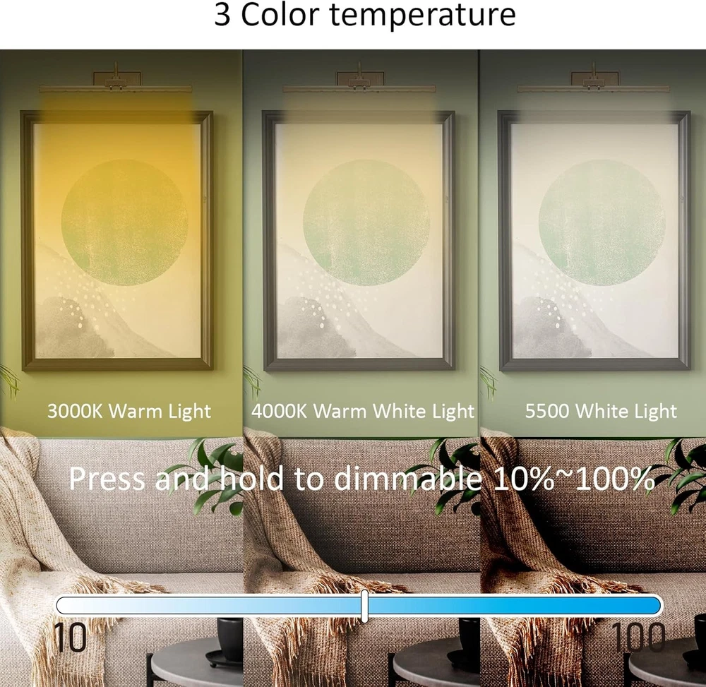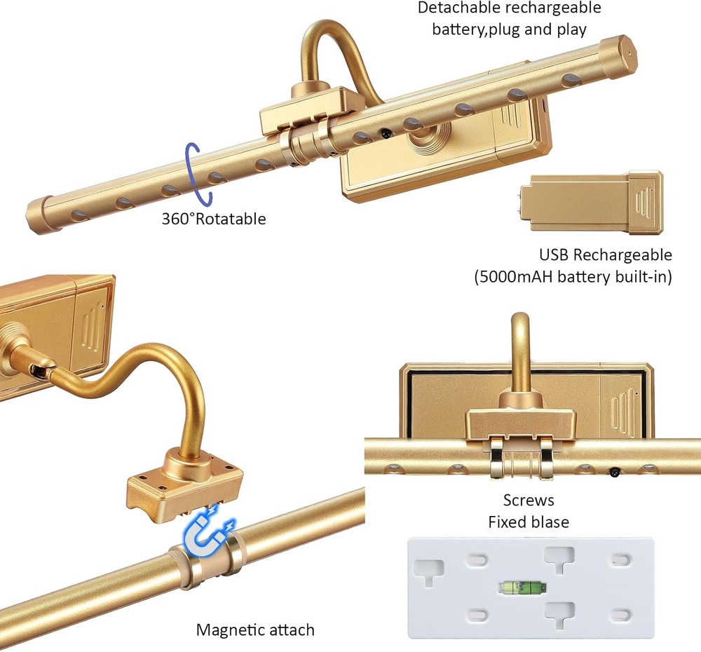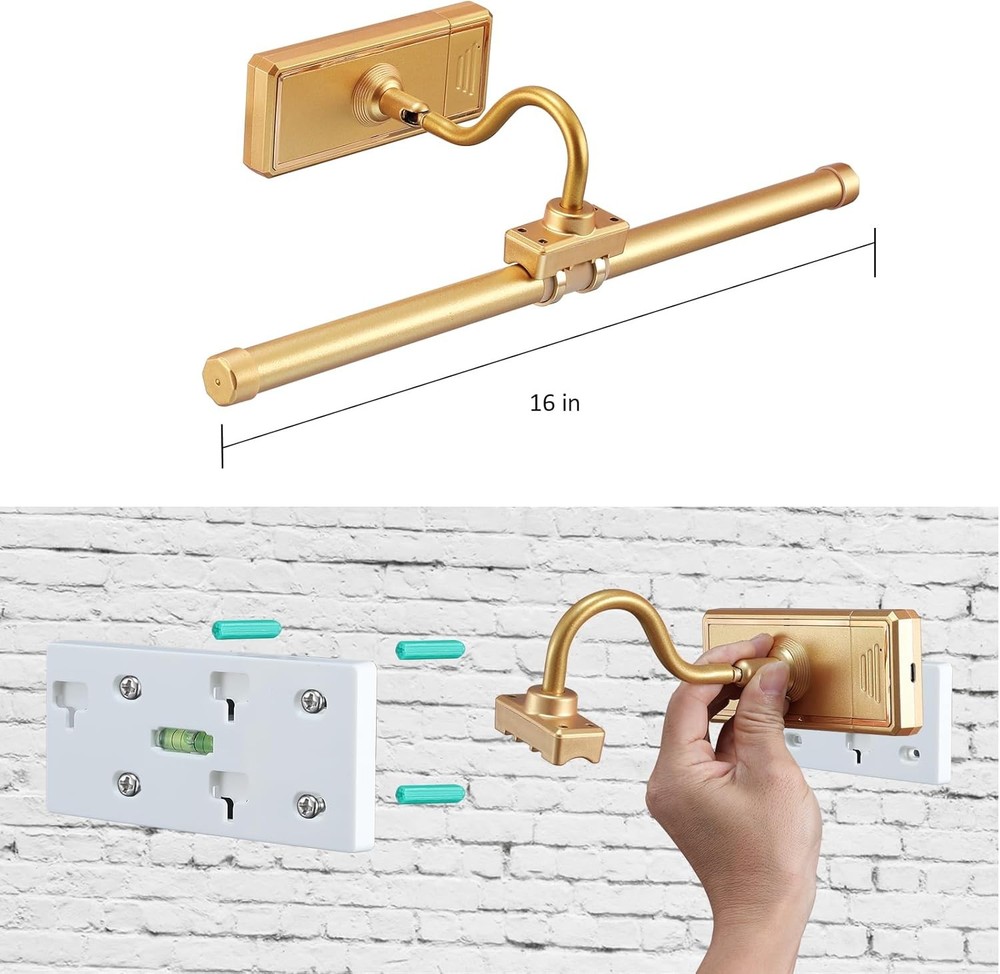About this item Rechargeable Picture Lights: Powered by a 3.7V 5000mAh built-in lithium battery with a type-C rechargeable USB cable, fully charged in 3-4 hours and has a run time of 15-20 hours. 2 Control Ways Painting Lights: Touch control with ON/OFF, short press for color changes, and long press for light dimming; Remote Control for brightness adjustment, 16 RGB color changing options, timer, lighting modes, and ON/OFF. The artwork light offers 3000K Warm light, 4000K Natural light, 5500K White light, and RGB Light. Magnetic & 360° Rotatable Light Head: The picture light features a 360° rotatable light head and a magnetic light tube that can be easily removed for recharging. Dimmable & Timer Painting Light: Press the "+" or "-" button on the remote or touch the side of the light tube to adjust the brightness per your needs. The timer function on the remote can automatically switch off after 0.5/1/3/6 hours. Easy Installation & Widely Applicable: Easily installed with screws within 5 minutes. Ideal for illuminating your paintings, frames, wall art, portraits, photos, galleries, dartboards, and displays. Dimensions: 16 x 3 x 3 inches; 1.12 Pounds.