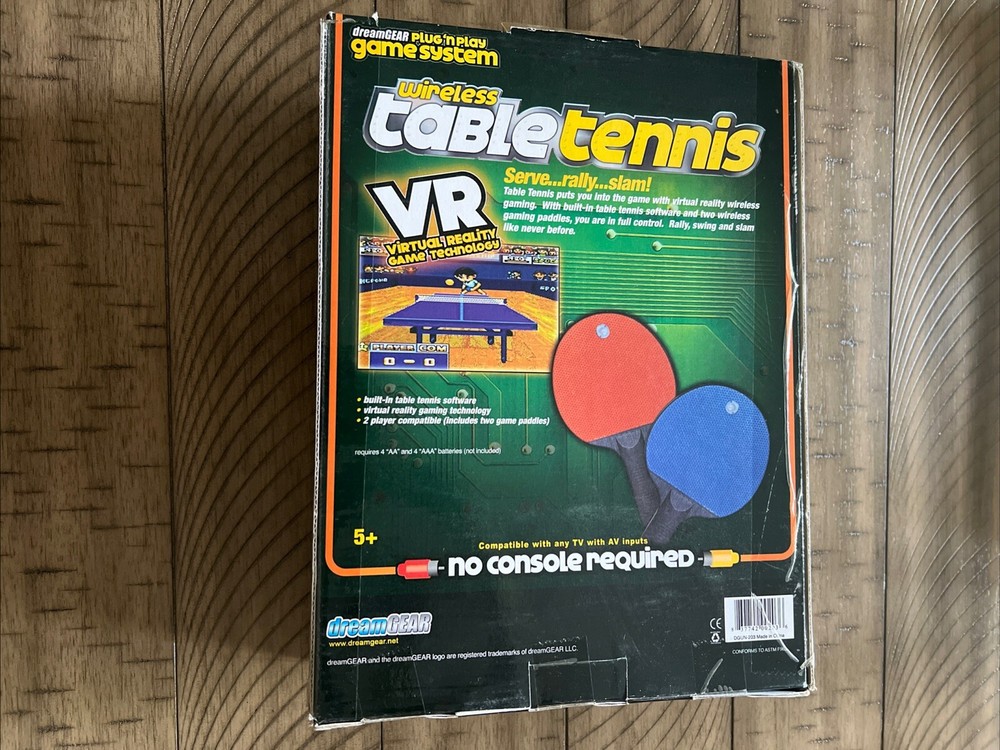 Wireless Table Tennis 1 or 2 Players dreamGEAR PLUG N PLAY SYSTEM COMPATIBLE WITH ANY TV WITH AV INPUTS NO CONSOLE REQUIRED built in table tennis software Virtual reality gaming technology 2 player compatibility including two game paddles Recommends ages 5 and up Box: J-14