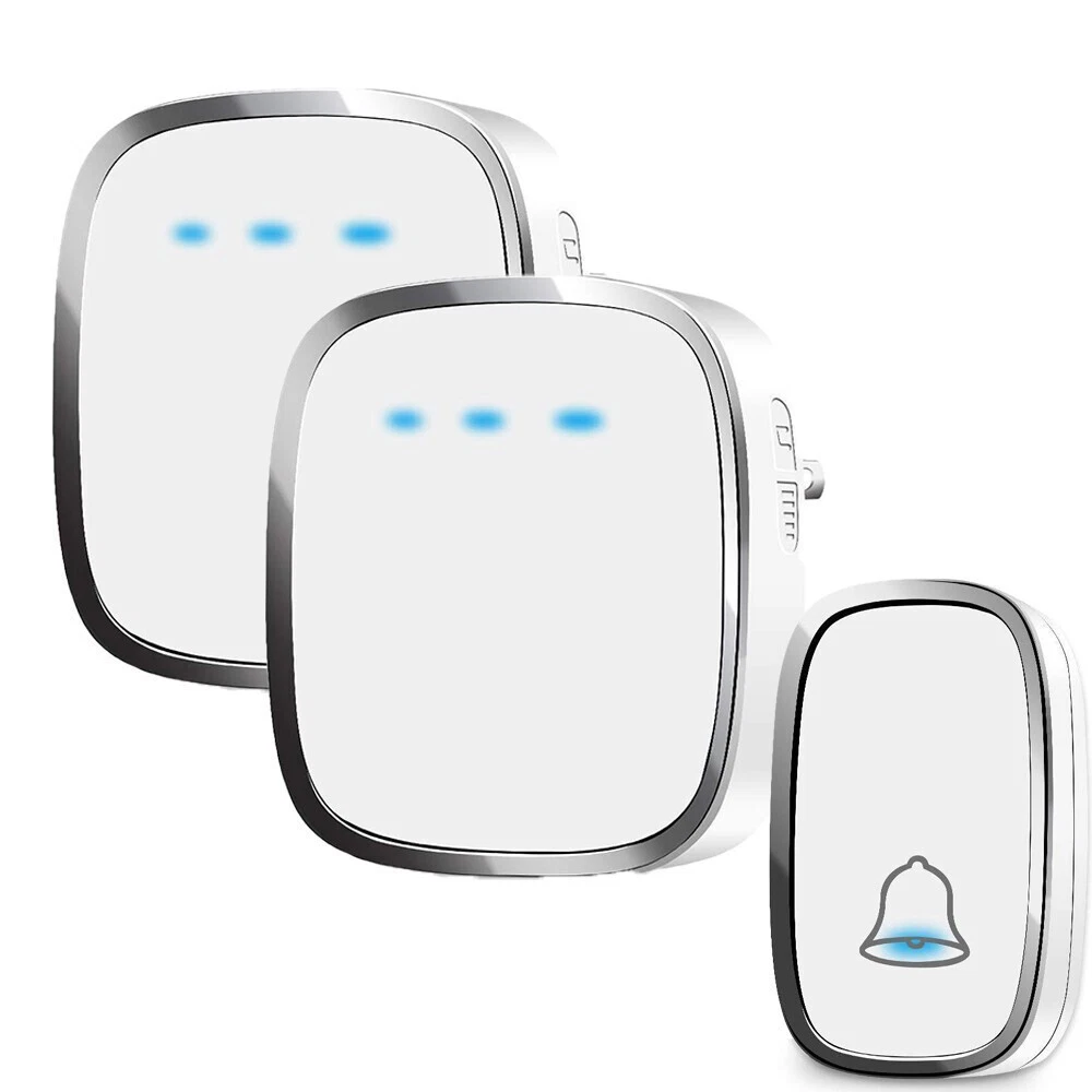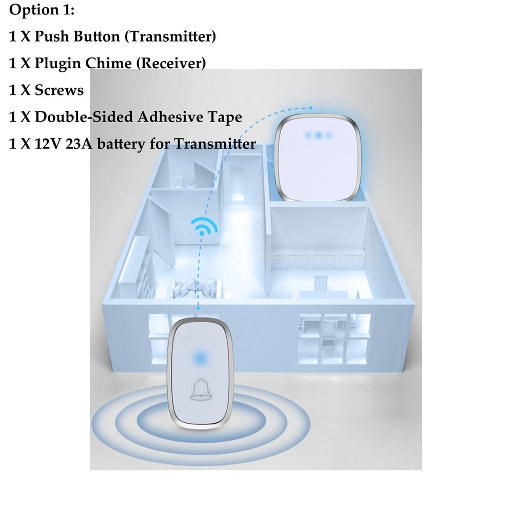 #A 1/2x Receivers+1x Transmitter Features: 【Personalize】:All receivers will ring no matter which push button is pressed, but each door has a different tone, so you know where your guests are. If you want the push button and receiver to work one-to-one, please try the steps in "How to clear the frequency and re-pair". 【Longer Range】:Up to 1000 Feet (300m) in the open air from the transmitter (150m if there are walls). Either you are occupied in the bedroom or at the kitchen, our wireless doorbell kit can remind you that someone is calling from outside. Never worry about missing visitors. 【60 Melodies & 5 Levels Volume & LED Flash】:The wireless doorbell offers a wide selection of 60 tunes for your choice. 5-level of volume range from 0dB to 110dB, silent mode with just LED flash is available when you don't want to be disturbed. 【IP44 waterproof】:The doorbell push button is rated IP44 and weatherproof for outdoor use,the doorbell chime is suitable for any home, townhouse, apartment, office, school, hospital, hotel or other application. Our wireless doorbell is certified by CE, RoHs, FCC. 【Expandable and Easy Installation】:Expand your existing doorbell system with up to 8 transmitters and unlimited receivers. Simply plug the main doorbell chime into a wall outlet, install the push button with provided double sided tape or screws. Specification: Maximum 1000ft operating range in open area 38 unique ringtones 3 volume levels LED indicators Volume range: 25 to 80dB Dimension: Receiver: 2.56 x 3.74 x 0.94 inch; Transmitter: 2.01 x 2.95 x 0.79 inch; Package Includes: 1-2x Receivers(please choose the qty you need) 1x Transmitter Tapes / Screws / Stickers #B 1/2x Receivers+1x Transmitter Feature: 300m/1000ft Operating Range With this wireless doorbell operating range up to 300m/1000ft, no matter where you are, you will never miss the visitor. You can smartly add up to 20 same plug-in doorbell receivers and doorbell battery-operated transmitters. Blue LED Indicator When pressing the wireless doorbell battery-operated transmitter, the blue indicator light on the wireless doorbell with 1/2 receivers will flash to remind you of the visitor's arrival. At the same time, the indicator light on the transmitter will remind visitors that the doorbell's receiver has sounded. IP44 Dustproof & Waterproof IP44 doorbell transmitter with a special dustproof & waterproof structure could work between -4 °F to 159 °F, can withstand extreme weather conditions. Enjoy the freedom to install it indoors, outdoor door frames, or in your garden. Innovative Memory Function With a smart storage function, this doorbell's wireless cordless plug-in receiver can remember your last tune and volume even if a power outage, no need to set it again every time. 10 Years Press Life After smart testing, the doorbell plug-in wireless transmitter can be pressed 100,000 times. It needs to be pressed 25 times a day for normal household use and 91250 times a year, so it can be used for 10 years. Easy to Install 1. Adhesive Patch Mounting: Use the included double-sided adhesive to stick the doorbell wireless cordless button on the wall. 2. Screw Mounting: There is a screw groove on the back cover of the doorbell battery-operated button, you can use the attached screws to fix it on the wall. Widely Use The plug-in door chime and cordless doorbell button are very popular because of their easy-to-install and set up function. You could install it anywhere inside, house, garden, garage, office, etc. Warm Tips: 1. Please tear off the battery insulation film before use. 2. Do not stick the doorbell wireless transmitter on the metal door frame or metal object. Pacakge Includes: Option 1: 1*Transmitter (includes 1*23A,12V battery) 2*Receiver Option 2 : 1*Transmitter (includes 1*23A, 12V battery) 1*Receiver #C 1/2x Receivers+1x Transmitter Feature: Classic Wireless Doorbell - Stylish modern design, artful with simplicity, elegant and unique. Excellent materials keeps itself from getting higher temperature & interference. Waterproof & Dustproof, remote transmitter button is rated IP44 weatherproof. Works between -4 °F to 140 °F; withstands various harsh weather conditions, acceptable for outdoor use. Long Operating Range - Operating range up to 1,000ft/300m in open area ensures you to hear the bell and answer the door in time. Either you are occupied a few rooms away or on another floor, in the garden or kitchen, you will always be easily informed when someone is calling from outside, nsures you will never miss a visitor. 36 Melodies & Adjustable Volume - The wireless doorbell offers a wide selection of 36 chimes for your personal taste, you can have a Christmas doorbell during the christmas season, for example, and more. 4-level of volume range from 25dB to 110dB to meet your needs for different occasions. Flashing light with audio alert indicators which is easy for people including the hearing impaired to notice. Easy Installation & Using - Screws and double-sided adhesive tapes included for easy be fixed to the doorframe of the transmitter. Easily plug receiver into an electrical outlet (no batteries required for main receiver). Install just plug it in location you need it to be heard, then you put the button where you want someone to push the button. Remembers your last melody and volume level after a power outage; no need to reset to your previous settings. Multi Use - It is fit for home, apartment, classroom, office, villas and more. You can use our doorbells to train dogs, using it to quiet down classrooms, when you ring the bell, the students will know it’s time to move on to the next group, the kids are loving it also. And it can be a paging device for the elderly, can signal for care when they need it most. Specifications: Plugs into Any Standard Wall Outlet. Flashing Light Indicator. Wireless Range: 1000ft maximum in the open air Internal Sounds: 36 Chimes Volume: 4 level adjustable levels (25db to 85db) Receiver Powe