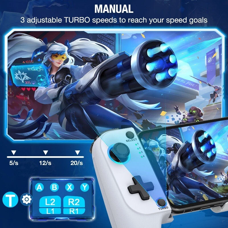 White Black 【PLAY ANY CONTROLLER SUPPORTED APP GAMES】 The wireless phone controller is designed to enjoy unstoppable gaming experience, work for iPhone/Android, support nearly all cloud gaming services including Xbox Game Pass, Playstation Remote Play, Steam Link, GeForce NOW, MFi Apple Arcade & hundreds of popular mobile games like Call of Duty, Roblox, Minecraft, etc. The mobile controller perfects your mobile gaming experience beyond a console by making it happen anywhere, anytime, to anyone! 【WIRELESS IPHONE GAME CONTROLLER WITH RGB & NO DEAD ZONE】 Only hold on 'B+HOME', you can connect controller for iphone with phone via Bluetooth. The phone game controller have Rainbow and 6 single color LED modes, you can switch LED colors or modes to build your own exclusive gaming ambiance! The Hall effect joystick provide ultra precise control, No drift, No deadzone! It helps you gain dominant position of games faster and the performance and game experience has been improved qualitatively! 【ADJUSTABLE TURBO & 8H PLAYING TIME】 The iOS/android controller has adjustable TURBO function (5/12/20 shots/s), free your fingers and make you easier to win in action game. Dual vibration motors enhance the game immersion, provide you realistic and stimulated gaming experience! Built-in rechargeable 600mAh high capacity battery provides over 8 hours game playing, and it can be fully charged within 2-3 hours. Never worry about game interruptions, enjoy your gaming time! 【STRETCHABLE DESIGN & CASE FRIENDLY】 The scalability of iphone controller for gaming allows you to install a 10-17.5cm phone, don't have to remove your phone case every time. Non slip rubber provides a secure fit that won’t come loose while gaming. And the grip with texture provides better comfort and a delicate feel, allowing you to play games for a long time without feeling tired! 【WHAT YOU GET & CUSTOMER SERVICE】 1X Phone Controller for iPhone/Android; 1X USB C Charging Cable; 1X User Manual for Phone Controller for Android. We are dedicated to providing customers with the best products and services. Matching the 'Shanwan Controller APP', collecting a large number of games and gaming platforms, and support for online upgrade of the controller.