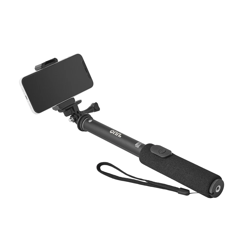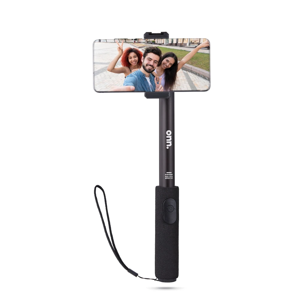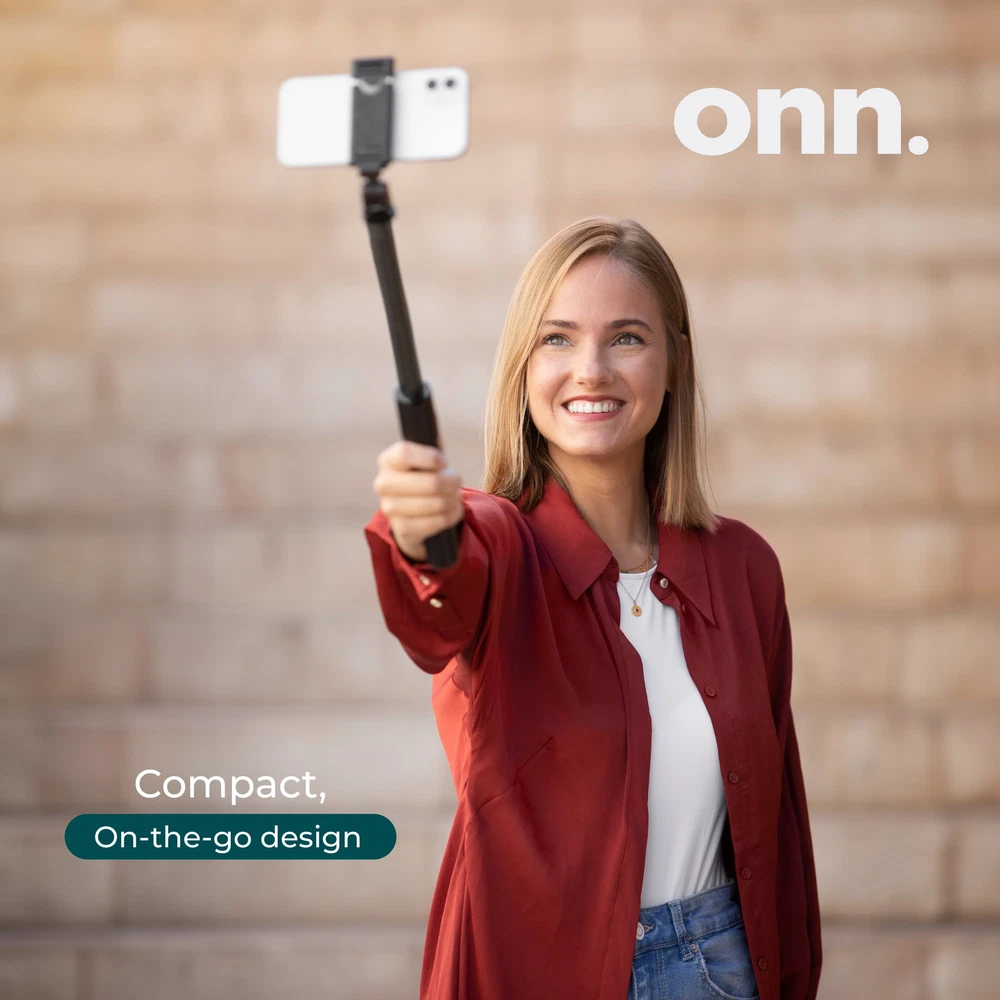 The onn. Wireless Selfie Stick with Smartphone Cradle, Mount and Bluetooth Shutter gives you the opportunity to take the pictures or videos of a lifetime. Take your selfie game to the next level or capture the best group photo of your squad with our onn. Wireless Selfie Stick. The adjustable, retractable arm extends up to 39 inches. Focus onn. We're onn. to something here. We took the hassle out of buying and built a brand that's fresh and simple. With delightful pops of color, finding the right product has never been easier. Say goodbye to stressful decision-making and fear of the aisle. Our mission is simple… to deliver great products and make it easy. Choose onn. and get back to using your brainpower for the important things in life… like pondering the question, "What should I binge watch this weekend?" onn. Wireless Selfie Stick with Smartphone Cradle, Mount and Bluetooth Shutter Remote: Adjustable: 12.9" to 39" Connects to your smartphone wirelessly using Bluetooth wireless technology Adjustable for angled shots For compact cameras, smartphones and action cameras Compact, on-the-go design Smartphone cradle compatible with most smartphones What's in the box? 1 Wireless Selfie Stick, 1 smartphone cradle, 1 mount, 1 remote (battery included) Sleek black design for style points