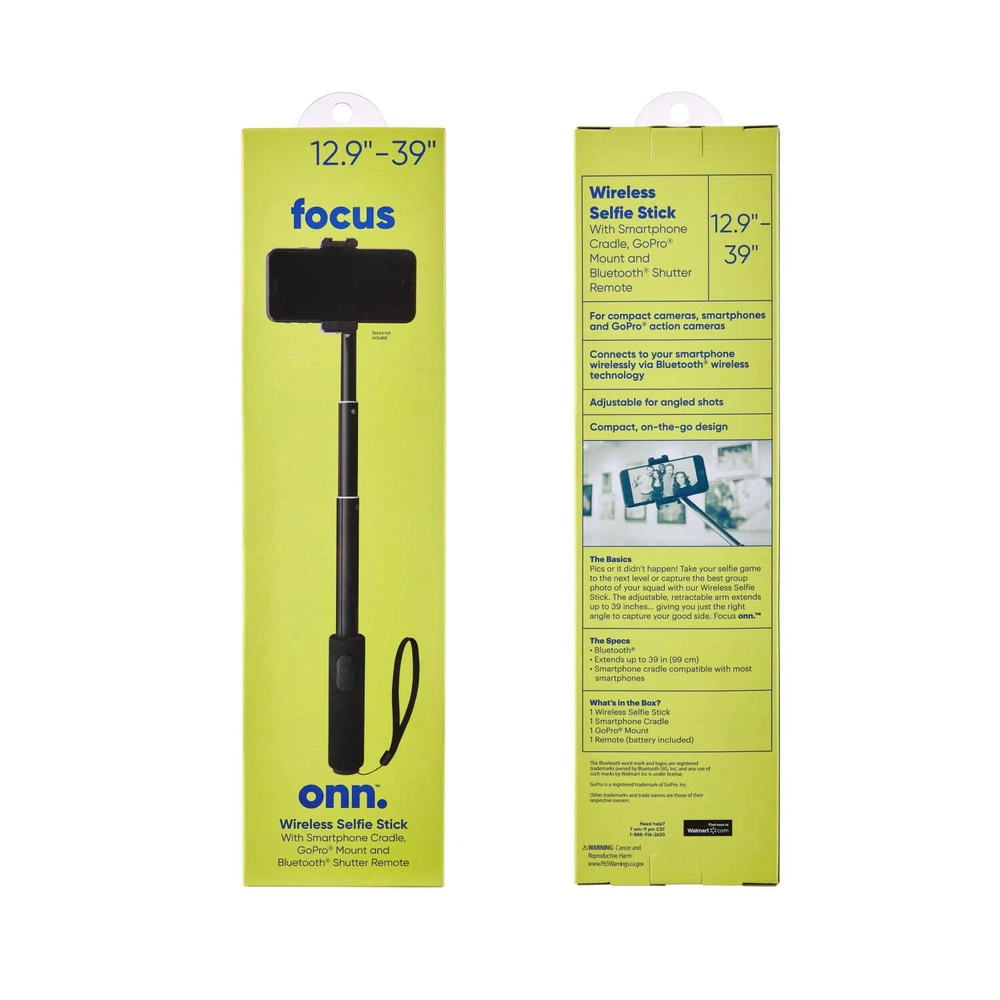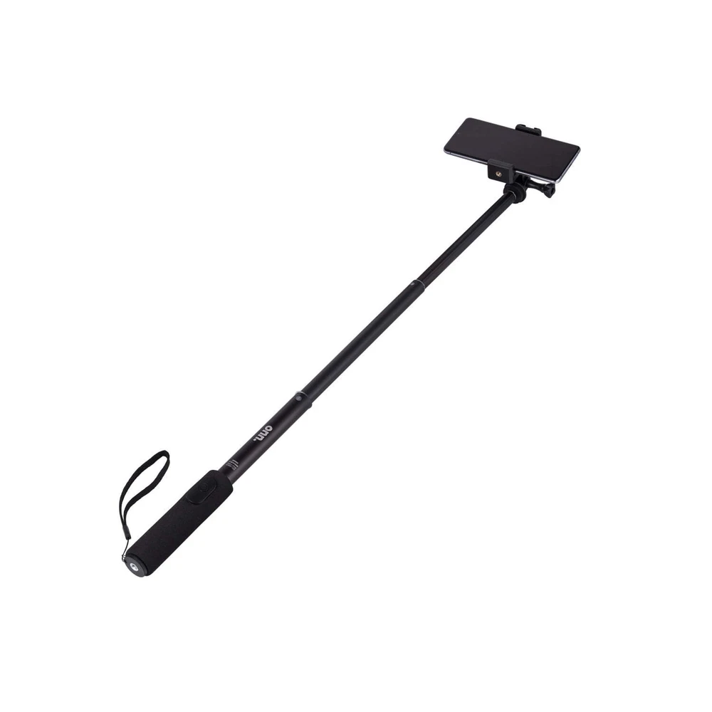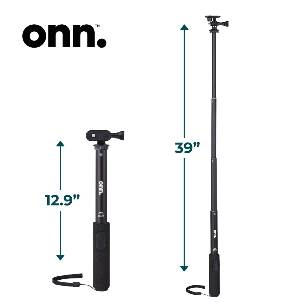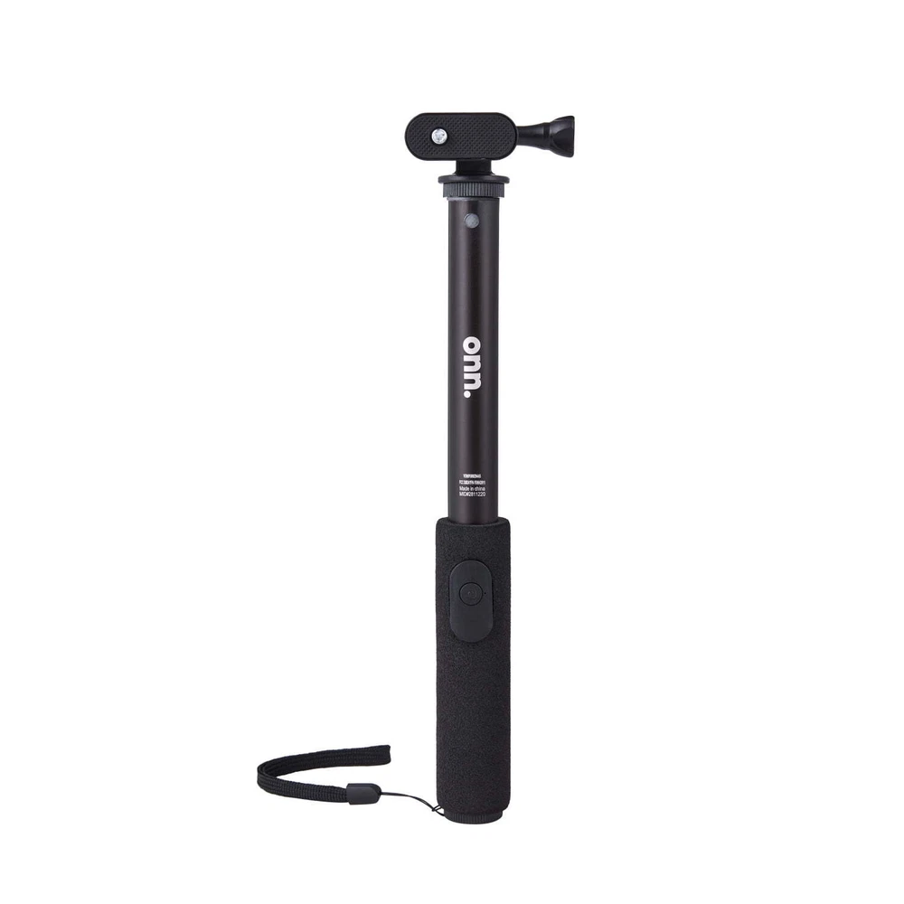 The onn. Wireless Selfie Stick with Smartphone Cradle, Mount and Bluetooth Shutter gives you the opportunity to take the pictures or videos of a lifetime. Take your selfie game to the next level or capture the best group photo of your squad with our onn. Wireless Selfie Stick. The adjustable, retractable arm extends up to 39 inches. Focus onn. We're onn. to something here. We took the hassle out of buying and built a brand that's fresh and simple. With delightful pops of color, finding the right product has never been easier. Say goodbye to stressful decision-making and fear of the aisle. Our mission is simple… to deliver great products and make it easy. Choose onn. and get back to using your brainpower for the important things in life… like pondering the question, "What should I binge watch this weekend?" onn. Wireless Selfie Stick with Smartphone Cradle, Mount and Bluetooth Shutter Remote: Adjustable: 12.9" to 39" Connects to your smartphone wirelessly using Bluetooth wireless technology Adjustable for angled shots For compact cameras, smartphones and action cameras Compact, on-the-go design Smartphone cradle compatible with most smartphones What's in the box? 1 Wireless Selfie Stick, 1 smartphone cradle, 1 mount, 1 remote (battery included) Sleek black design for style points