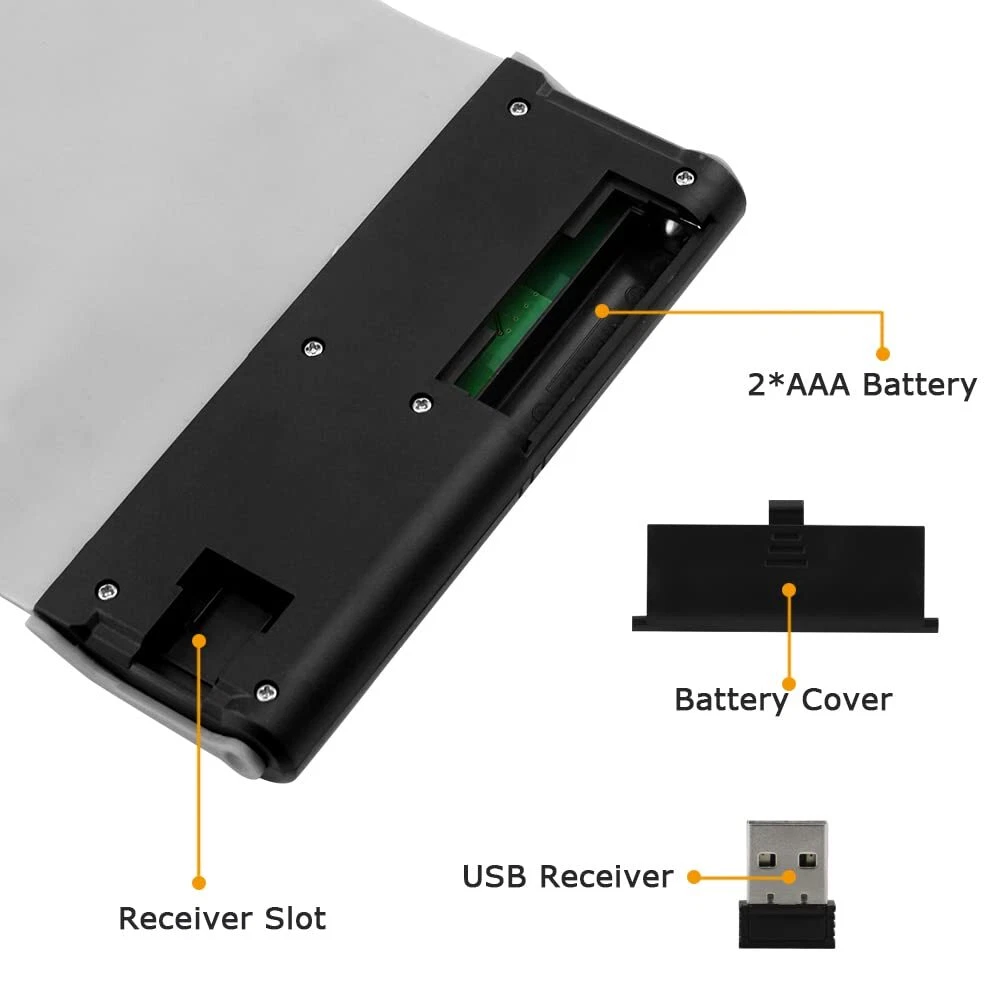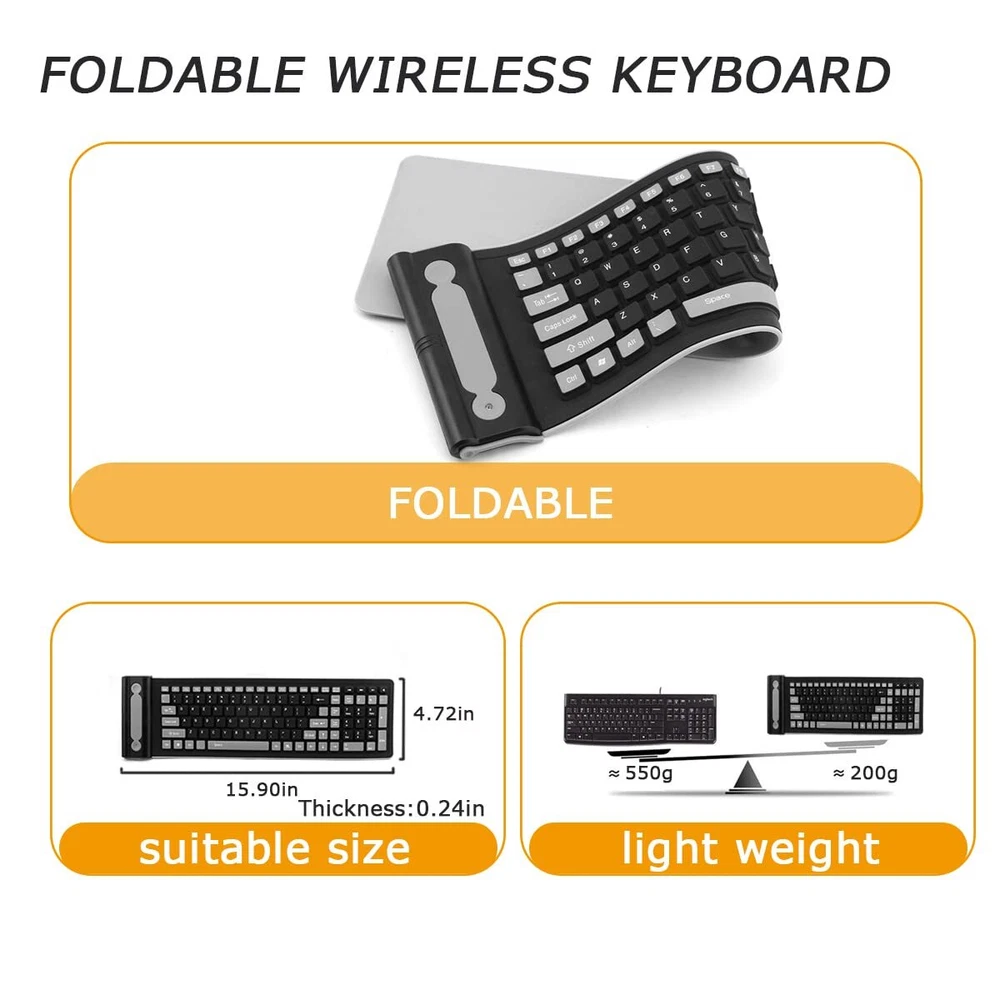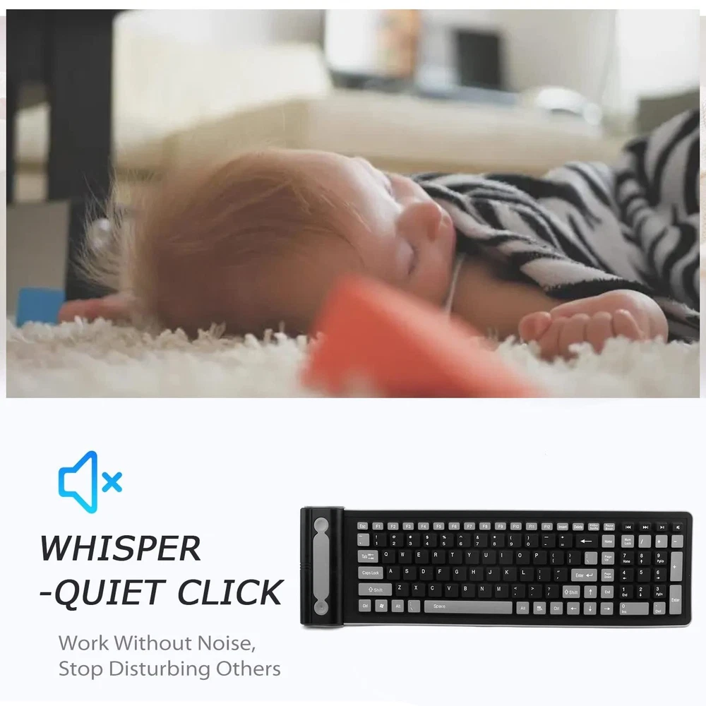 đ˛This cutting-edge keyboard is designed to enhance your typing experience and provide you with unmatched convenience. Whether you're a student, professional, or avid gamer, this wireless keyboard is perfect for all your needs. This wireless foldable silicone soft keyboard is made of high-quality eco-friendly silicone material. The ultra-thin, compact and stylish design allows you to type comfortably. It's so flexible and compact that it rolls easily into your bag and you can easily take it anywhere you want. đăRollable and Easy to Carryă: The wireless silent foldable keyboard is made of ABS and silicone material, which can be curled, easy to carry, and suitable for traveling. đăEasy to Clean & Multi-Use Scenariosă: This wireless silent silicone soft keyboard has excellent performances such as anti-pollution, acid and alkali resistance, dustproof, waterproof, etc. It is suitable for schools, offices, libraries, and other occasions. And thanks to the ultra-quiet button design, it will not disturb others during actual use, creating a quiet environment. đăSpecificationsă: Size: 15.9*4.72*0.24inches Weight: 6.28 oz Keyboard type: 2.4G Button force: 55Âą5g Material: ABS+Silicone Keyboard button: 107 Keys Keyboard interface: standard USB interface Button height: 0.17in Key pitch specification: Standard Features: Standard, built-in anti-jamming capability đăWhat You Getă: 1 X Wireless Silicone Foldable Keyboard 1 X USB Receiver 1 X User Manual đăCustomer Servicesă: If you have any usage problems or dissatisfaction with our products, please feel free to contact us and we will sincerely ask questions. We offer 30 days money-back and a 12-month guarantee. đăWarmly Noteă: The product package does not include batteries, you need to purchase 2 AAA batteries by yourself. â¨ăSilent Soft Silicone Material ăThe soft silicone wireless keyboard adopts wireless transmission with 2.4 gigahertz frequency with strong noise elimination capability and is equipped with a 107-key mute key for a quiet typing experience. This folding keyboard is perfect for school, library, and night work, without disturbing others' rest ⨠ăEasy to CarryăThe rubber keyboard size: 15.9*4.7*0.2in.Weight: 6.28oz. The soft silicone keyboard can be rolled up and stuffed into the bag at will, lightweight and flexible, making it easy to carry. Perfect for travel and for people who use computers for long periods of time for work and study â¨ăMultifunctionă The portable keyboard for laptop will give you a great typing experience because it is Anti-pollution, acidic, etc. Alkali-proof, dust-proof, and waterproof and can be used in any harsh environment. The whisper-quiet keystrokes make it ideal for quiet environments such as offices or libraries. Made from high-quality materials, this wireless keyboard is built to last. â¨ăWide Compatibilityă The flexible keyboard is suitable for desktop computers, notebooks, tablets, and smartphones, and supports systems: Windows/98 /ME /2000 /Vista /Win 7 /Android /IOS systems â¨ăDurability & ServicesăEfficient power-saving feature allows 2 AAA batteries to last up to 3 months under normal daily usage conditions (battery needs to be purchased by yourself). The roll-up keyboard has a key lifespan of over 10 million keystrokes. 30 days money-back and 12-month guarantee. if any questions about our product, please don't hesitate to get after-sales service, we will respond within 24 hours