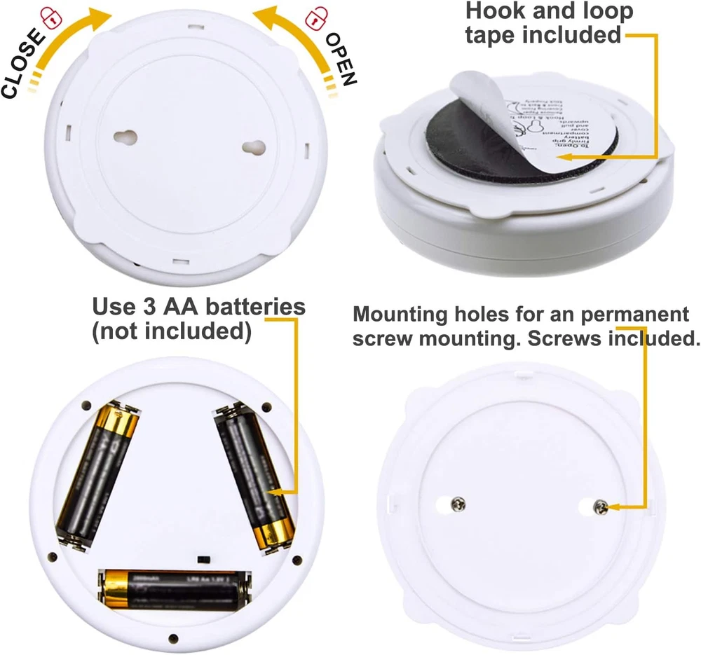 Installation Type: Wall Mount Light fixture form: Ceiling gtin13: 313111969914 Voltage: 4.5 Volts Switch Type: Push Button Light Color: warm white Power Source: Battery Powered Item Dimensions L x W x H: 4.25"L x 4.25"W x 1.65"H Item Weight: 0.22 Pounds Efficiency: 72.73 lumens per watt Model Name: Wireless Spotlight Battery Operated LED Puck Lights Item model number: 8542001114 Type: Does not apply Style: Modern Unit Count: 1.0 Count Specific Uses For Product: Cabinet, Closet, Picture, Dartboard, Plants, Garage, Home Additional Features: Portable, Adjustable Color Temperature, Dimmable, Timer Color: White Bulb Base: GU10 Required Assembly: No Embellishment Feature: Crystal Material Type: Plastic Controller Type: Remote Control, Push Button Warranty Type: manufacturer-and-seller-combination Room Type: Storage Room, Kitchen, Bedroom, Home Office, Dining Room Shade Material: Plastic Brightness: 80 Lumen Country of Origin: China Lighting Method: Up/Down Light Product Dimensions: 4.25 x 4.25 x 1.65 inches; 3.52 ounces Is Discontinued By Manufacturer: No Shade Color: White Brand: Does not apply Fixture Type: Non Removable Number of Light Sources: 1 UPC: 313111969914 Model Number: 8542001114 Batteries: 3 AA batteries required. Material: Plastic Light Source Type: LED Indoor Outdoor Usage: Indoor Finish Types: Painted Mounting Type: Wall Mount,Ceiling Mount,Freestanding Control Method: Remote, Touch Shape: Round Wattage: 1.1 watts Number of Items: 1