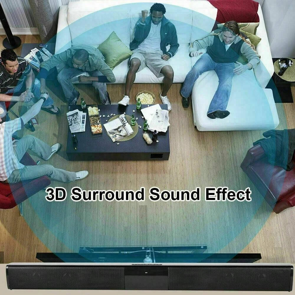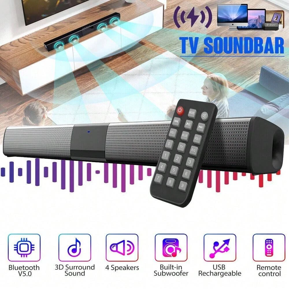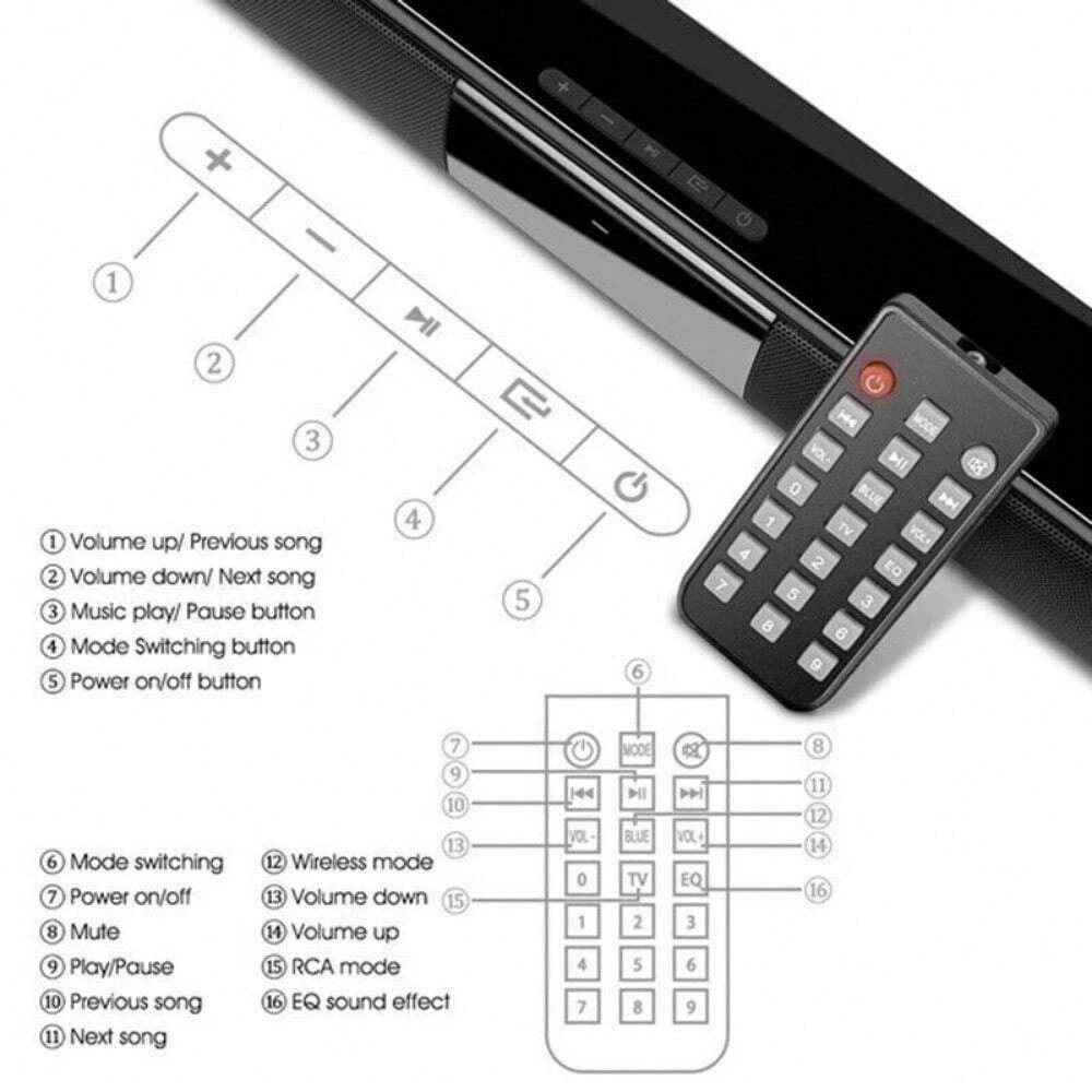 Description: 1 .Upgraded deluxe stereo, 4 speakers, 3D stereo surround sound, the effect is absolutely stunning. 2.This sound bar can be connected to smart de vices via wired/wireless mode, using USB-B interface for charging, 3.5mm audio cable for connecting to TV, suitable for various devices such as TV, PC, laptop and smart phone. The built-in 2000mAh lithium battery gets rid of trouble caused by wires, and you can move it where you want. 3.FM radio,Can enjoy music and the fun of FM radio. 4.With RCA cable, it can be directly connected to TV and computer. 5.Built-in DSP sound processor, the sound is clear and no noise. 6.Equipped with remote control, free choice of mode. 7.Simple connection and easy operation. Specification: Bluetooth version: V4.0 Battery type: 18650 polymer battery Battery capacity: 2000mA Use time: about 3.5 hours Output power: 4 ohm*5W Frequency response: 20Hz-20KHz Transmission frequency range: 2.402G-2.480G Signal to noise ratio: ±80db Transmission distance: 8-10m Charging type: microUSB 5V/1.5A Size: 550*50*50mm/approx.21.65*1.96*1.96 inch Package included: 1x Speaker 1x Remote Control 1xUSB Charging Cable 1xRCA Audio Cable 1x English Manual Please make sure to check which type of audio output port is on your TV before purchasing? 1. Currently, the commonly used audio output ports in the market include RCA, fiber optic, 3.5mm, coaxial, and HDMI 2. The interfaces that can be directly wired for the speaker of our product are: 3.5mm input and RCA input 3. A. If your TV's audio output port is 3.5mm and RCA interface, it can be directly wired for use B. If your TV's audio output port is not 3.5mm and RCA output, you need to purchase a coaxial to RCA converter by yourself (not included) C. If your TV supports Bluetooth function, open the TV Bluetooth settings and connect to wireless Bluetooth for pairing