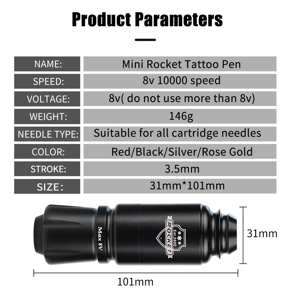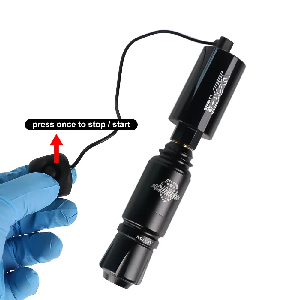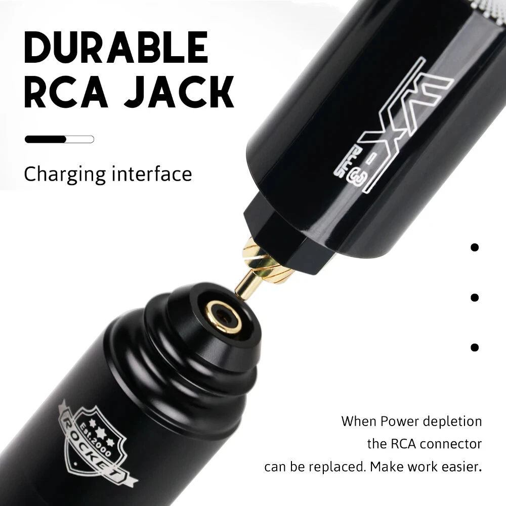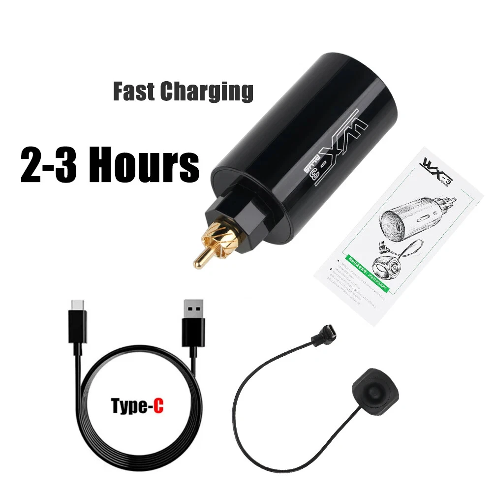 Tattoo Machine Details: 100% brand new and high quality Body: space aluminum Motor: Import Motor Weight: about 146g Stroke: 3.5mm Rpm Range Stitches: 10000rpm/min Colors : Black Tattoo Power Supply: Product Type: Wireless Tattoo Power Supply Power Input Voltage: DC 5V Output Voltage: 4.2-12V Interface Type: DC / RCA Battery Type: Li-ion battery Battery Capacity: 1500mAh Charging Time: 4 hours (charger is different, charging time is different) Working Time: 8 hours for normal use Net Weight: 61.5g Size: 32*84mm