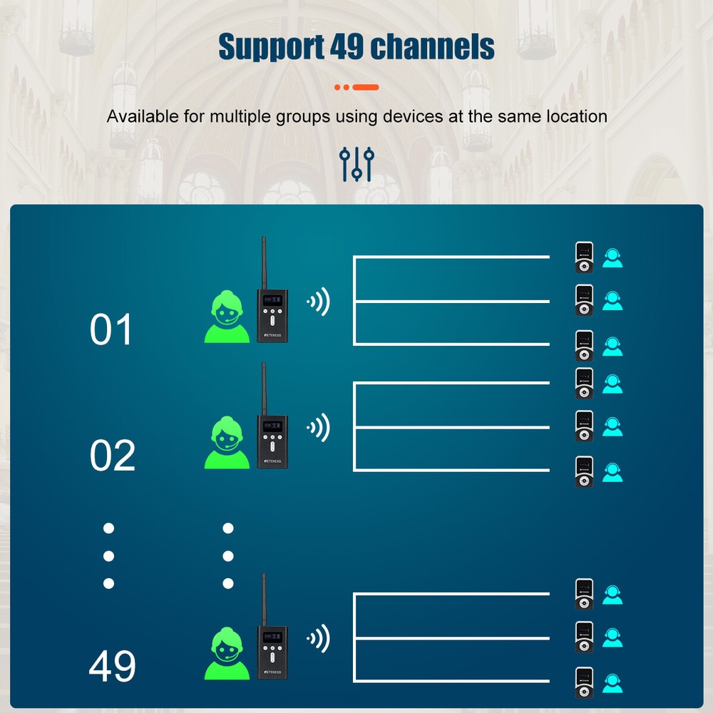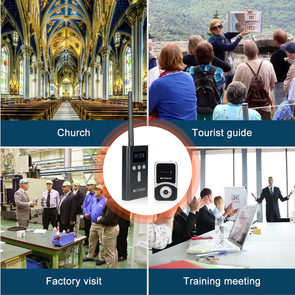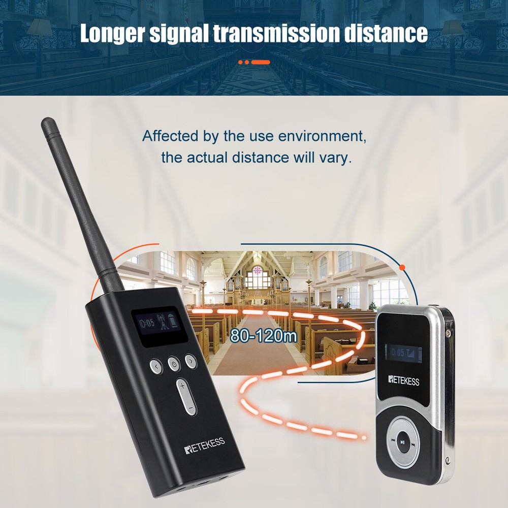 . Model TT116T+TT116R TT125 T130+T131 Product Frequency Range UHF:902-928mhz 2.4 GHz 195-230MHz Transmission distance 200m(Open Area) 150m(Open Area) 60m(Open Area) Standby Time about 10h(Transmitter) about 18h(Transmitter) about 12h(Transmitter) about 13h(Receiver) about 80-100h(Receiver) about 18h(Receiver) Channel number 50 channels 999 channels 99 channels Noise Reduction Technology YES YES NO One-key Pairing YES YES YES One-key Mute YES YES NO Charging Port Type-C Type-C USB Battery Capacity 3.7V 1000mAh 3.7V 3000mAh 3.7V 900mAh(T)/600mAh(R) Microphone Omnidirectional Omnidirectional / Earphone D-shaped;Suitabel for both ears D-shaped;Suitabel for both ears D-shaped;Suitabel for both ears Size 114.8X54.8X20.6mm(T&R) 114.8X54.8X20.6mm(T&R) 99X56X14mm(T)+72X42X12mm(R) Weight 65g(T)+56g(R) 100g(T&R) 58(T)+45g(R) Wireless Tour Guide Audio System 2 Transmitters 30 Receives Charger Case Church Transmitter Features: Portable design, the smallest and lightest PLL synthesized design, with high frequency stability 49 channel: allows 49 groups to operate simultaneously at the same place One transmitter can work with any number of receivers About 120m(393ft) communicating distances The transmitter supports external audio input, such as MP3, Smartphone Bulit-in rechargeable lithium battery, make sure can use all day long LCD display, volume adjustable, battery consumption display, easy to operate Two way of ID setting: Wireless and Manual. If you have to set the ID for many receivers, the wirelss ID setting method is more quickly Support the transmitter to turn off the receiver on the same frequency with one key, the transmitter to mute with one key, and the transmitter to frequency with one key Applications: Tour guide, Wireless meeting, Wireless teaching, Simultaneous interpreting, Corporate hospitality, Factory tour, Church sermon, etc. Transmitter Specification: Frequency range 195-216MHz Channel 49 channels Frequency response 50Hz-18000Hz Operating voltage DC 3.7V Transmitted output power 18dBm Audio frequency input 3.5mm line /Microphone input SNR 80dB(Typical) Image rejection ratio ≥90dB Degree of distortion <0.3% Effective working area 100m Capacity of battery 4200mAh Working hours About 20 hours Size 205 x 60 x 20 mm / 8 x 2. 3 x 0. 7 in Weight 140 g / 0.3lb NOTE: This is a wireless transmitter only, it has to match our receiver to build a wireless tour guide system, please feel free to contact us. Can be used with T131 receiver Receiver Features: Portable design, the smallest and lightest PLL synthesized design, with high frequency stability 49 channel: allows 49 groups to operate simultaneously at the same place Built-in rechargeable lithium battery, make sure can use all day long LCD display, volume adjustable, battery consumption display, easy to operate Applications: Tour guide, Wireless meeting, Wireless teaching, Simultaneous interpreting, Corporate hospitality, Factory tour, Church sermon, etc.. Charger Case Features: Can charge for 2pcs T130 transmitters and 30pcs T131 receivers at the same time Aluminum alloy, durable and fire resistant Portable design, you can put down all the accessories As your team grows, if you have more receivers, this charging case is your good helper Input : AC110-220V, 50/60Hz Output: DC 5V, 7A Size: 500 x 265 x 140mm / 19.7 x 10.4 x 5.5 in Weight: 3200g / 7lbs Receiver Specification: Frequency range 195-216MHz Channel 49 channels Operating voltage DC 3.7V Audio frequency input 3.5mm line Frequency response range 50-18000Hz SNR 80dB(Typical) Image rejection ratio ≥90dB Degree of distortion <0.3% Effective working area 100m (empty) Capacity of battery 900mAh Working hours About 20 hours Size 73x 42 x 12mm / 2.8 x 1.6 x 0.5 in Weight 45g / 0.1lb NOTE: This is a wireless receiver only, it has to match our transmitter (195-216MHz) to build a wireless tour guide system, please feel free to contact us. Package Includes: 2 x Wireless t ransmitter 30 x Wireless receiver 30 x Single earphone 1 x Lavalier microphone 31 x USB charging cable 31 x Lanyard 1 x 32 slot charging base 1 x English manual Long working distance Signal transmission distance up to 100m/328ft, is ideal for keeping social distancing, such as tour guides, translators; factory visits; training meetings and other scenarios. The frequency range is 195-216MHz, helping tour groups overcome background noise and distance from the guide. One key to mute When the tour guide has to answer the phone during the explanation, he can turn on the mute function with one button on the transmitter instead of turning off the transmitter. PLL technology for signal stabilization PLL digital locking frequency synthesis design, more stable frequency, data mute locking technology, no interference noise. Ensures the clear and smooth audio transmission in a tour trip or in a conference. Ultra-long standby rechargeable battery Built-in 4200mAh lithium rechargeable battery in the transmitter can be used for 20 hours. Built-in 900mAh lithium battery in the receiver can be used for 20 hours. Long working time ensures your guests won’t miss any of your message,readily for a whole-day conference or journey. Wireless ID Setting Manual ID Setting We have 2 ways to set ID: Wireless ID setting and manual ID setting. Wireless ID setting works better for the occasion that if have to set the ID for many receivers, like a big conference; Manual ID setting works better for the occasion that if have to set the ID for few receivers, like a small class, a small group of tourists; Support 49 channels In the same tourist attraction, there will be multiple sets of equipment for explanations at the same time, and 49 optional channels will keep your team free from interference from other equipment. AUX and MIC dual-channel audio input The tour guide can play background music through the AUX function when explaining. Allow visitors to immerse themselves in the attractions. The clear and high-quality sound offers enjoyable listening expe
