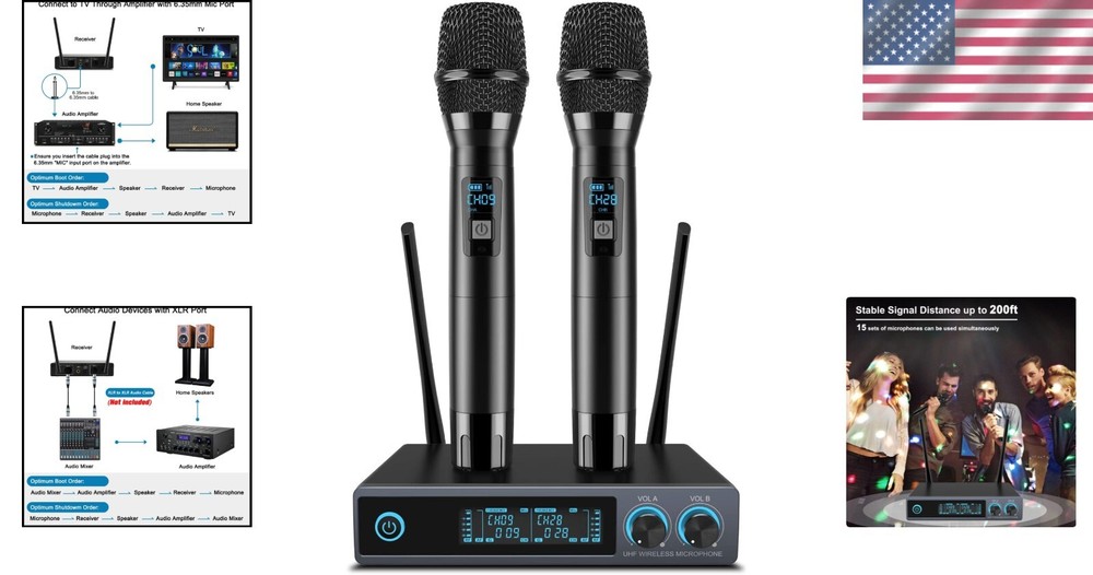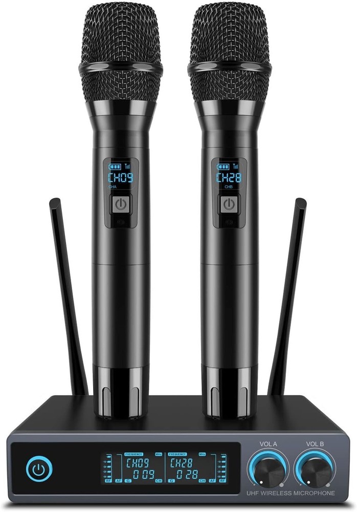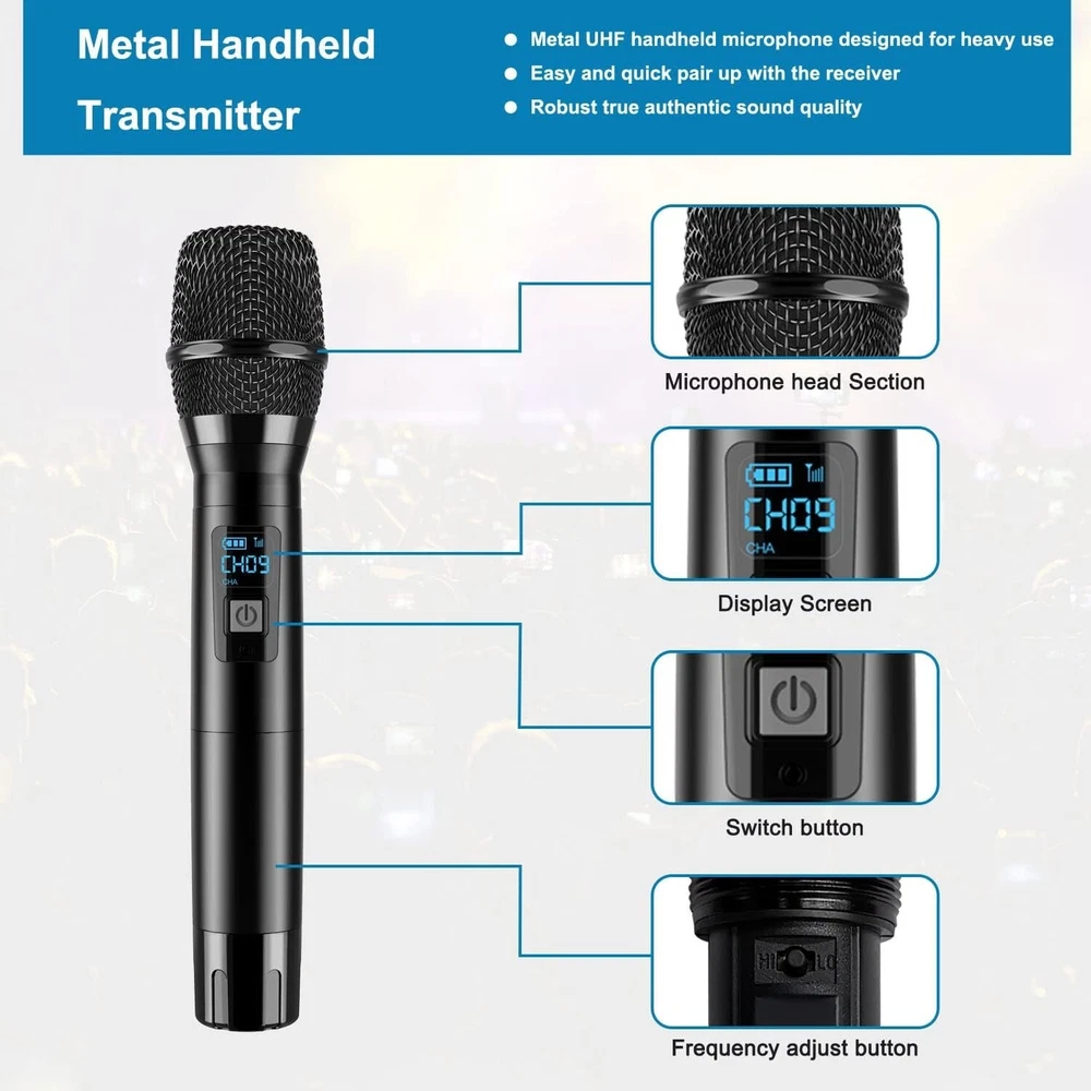 This wireless mic system is a game-changer! The UHF connection is super stable, even at a distance, and the sound quality is crystal clear—perfect for karaoke nights or presentations. The metal build feels premium, and the adjustable frequencies mean no interference. Super easy to set up, and the battery life lasts through long sessions. Highly recommend for anyone needing reliable, great-sounding mics!