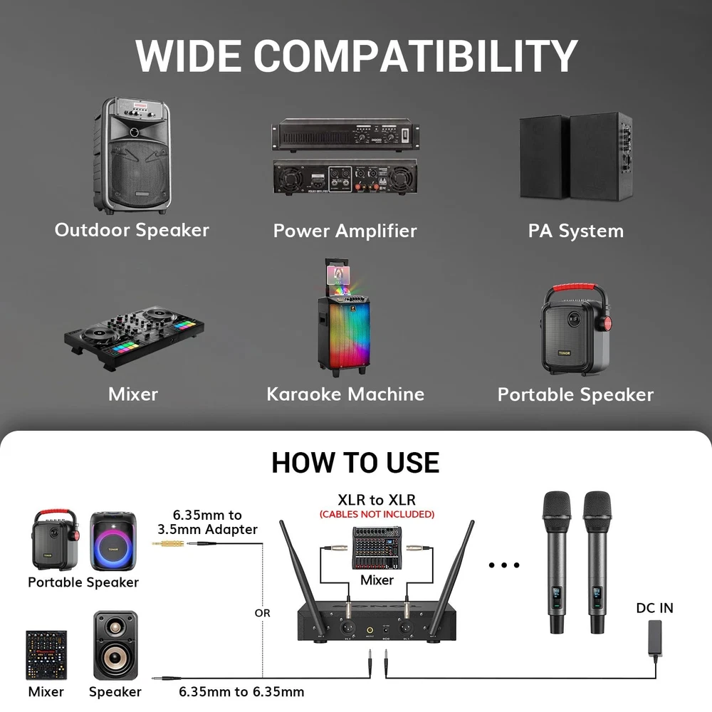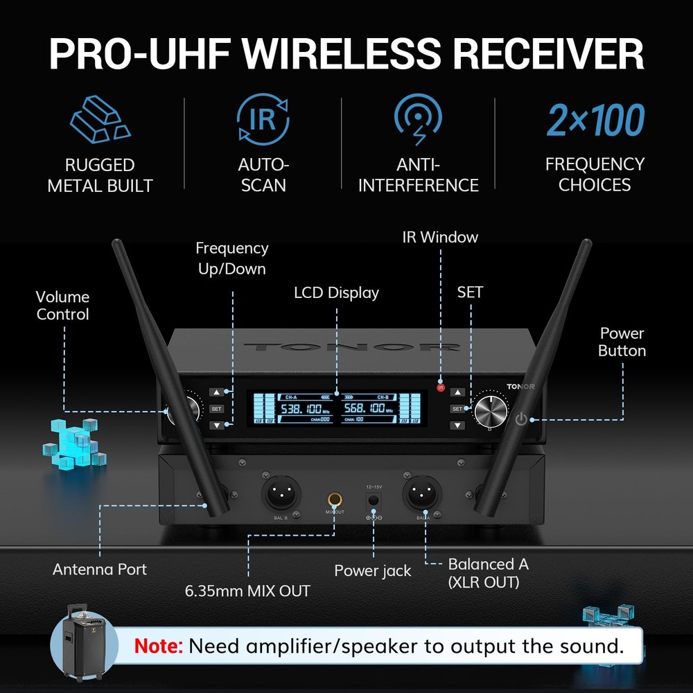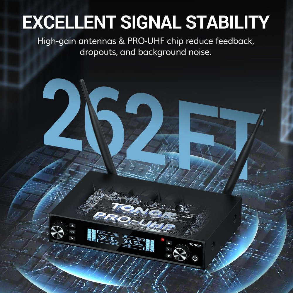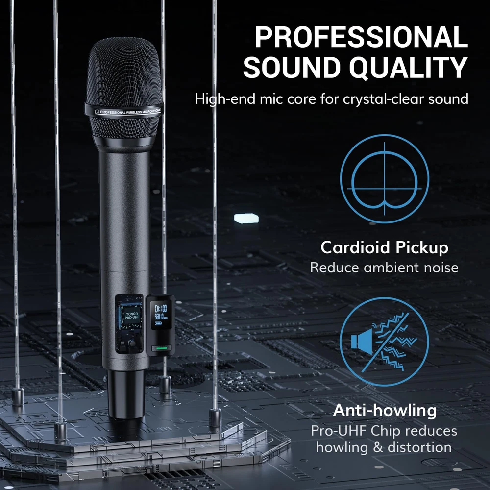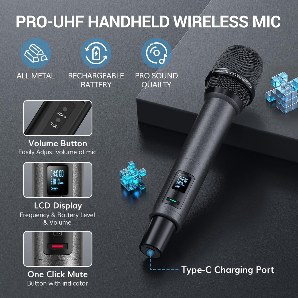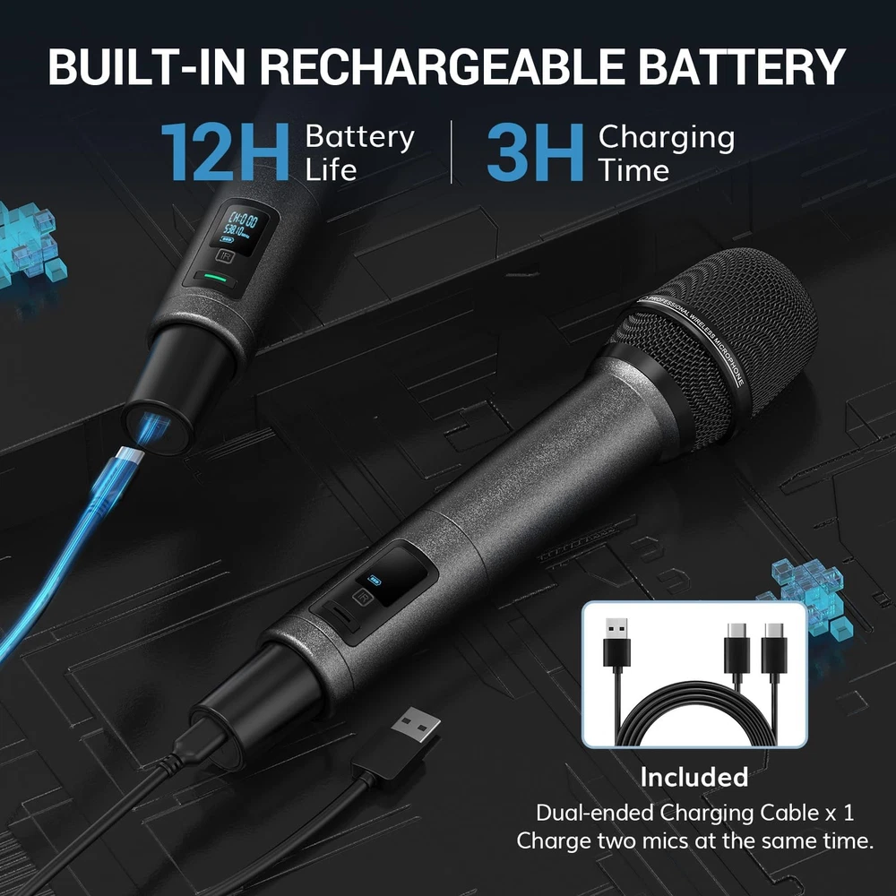 Wireless Microphone System, Auto Scan & Pair UHF Rechargeable Karaoke Mic, 2x100 Professional Dynamic Cordless Mic for Singing Church Wedding DJ with Adjustable Volume, Quick Mute 262ft TW550 Auto-Scan and IR Pairing: Automatically seeks out the most stable and interference-free frequencies; IR pairing process is fast and easy; each mic includes 100 UHF frequencies (538.1 to 597.8MHz) Excellent Signal Stability: The latest PRO-UHF connection chip and anti-interference antennas offer an ultra-long and ultra-stable transmission distance of 262 ft. (80 m); no dropouts, interference, or distortion Superior Sound Quality: Features a high-end cardioid dynamic mic core, ensuring clear and authentic sound quality; supports audio devices with 6.35 mm/3.5 mm/XLR ports; ideal for karaoke, church, weddings, performances, speeches, etc Rechargeable Wireless Microphones: Microphones feature 1100mAh built-in rechargeable batteries, no need for AA batteries; fully charged in 3 hours and last 11-12 hours; includes a dual-ended Type-C cable for simultaneous charging One-Click Mute and LED Indicator: Press the microphone button to mute instantly; the indicator on the button is green when working and red when muted Battery Level Display: The receiver and microphone screens show real-time battery levels, allowing you to recharge promptly and avoid sudden power loss during use Wireless Microphone System, Professional Metal UHF Rechargeable Wireless Mic, Handheld Cordless Dynamic Mic with Receiver for Karaoke, Church, Singing, Wedding, Meeting, Party, DJ, 200ft TW550 Shipping We offer FREE shipping on all orders! We ship within Three business days of payment, usually sooner. We use a selection of shipping services such as UPS, FedEx, USPS etc. We only ship to the lower 48 states, no APO/FPO addresses or PO Boxes allowed. Local pickups and combined shipping options are not provided at this time. Return You can return a product for up to 30 days from the date you purchased it. Any product you return must be in the same condition you received it and in the original packaging. Please keep the receipt. Payment We accept payment by any of the following methods: PayPal Please pay as soon as possible after winning an auction, as that will allow us to post your item to you sooner! Feedback Customer satisfaction is very important to us. If you have any problem with your order, please contact us and we will do our best to make you satisfied. Contact Us If you have any queries, please contact us via ebay. We usually respond within 24 hours on weekdays. Please visit our eBay store to check out other items for sale! Thank you for shopping at our store.