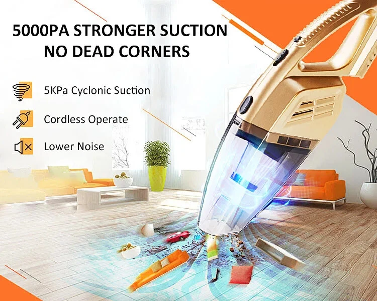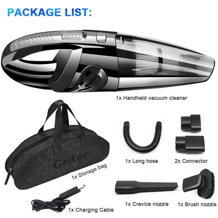 Most Buyer Like: Description: Name: Wireless Handheld Vacuum Cleaner Charging Volt: 7.4V (work with car charger and cellphone charger) Rate Power: 120W Power Supply: Lithium Battery Size: 32*6cm Color: Black Battery Capacity: 2200mah Working Time: About 25-30 Minutes Charging Time: 3-4 Hours Dry/Wet: Yes Charger: USB charger Cable 1.Charging Status: Rechargeable battery USB shows red for normal charging and green for full charging 2.This wireless car vacuum cleaner is a wet and dry vacuum cleaner. When absorbing water, pay attention to open the front cover to drain water in time. What Package included: 1x Wireless vacuum cleaner 1x Long Nozzle 1x Nozzle brush 1x EVA hose 2x Connectors 1x Portable bag 1x English Manual