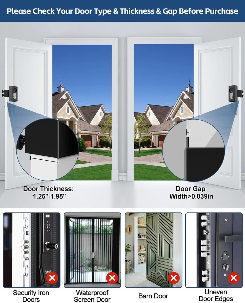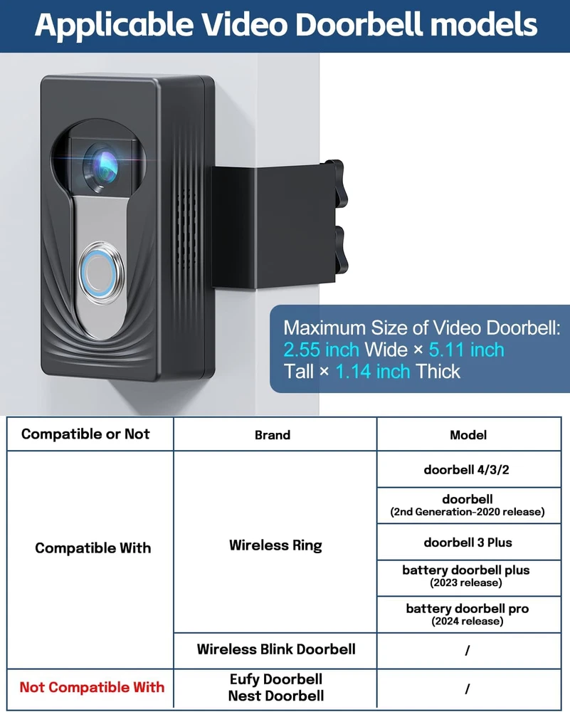 Compatible With Multiple Wireless Doorbells: Trushome doorbell mount is used for different sizes of doorbells by filling the inside with sponges of different thicknesses. compatible with Ring doorbell 4/3/2/1 & Ring video Doorbell(2nd Generation-2020 Release)& Ring video Doorbell 3 Plus &Ring battery doorbell plus(2023 release)& Ring battery Doorbell Pro(2024 Release), Blink doorbell. Note: Only for wireless video doorbells, not for wired ones (doorbell not included). Suitable for 1.25inch-1.95inch thick doors: The anti-theft doorbell mount with no drill is only suitable for the thickness of the door is 1.25inch-1.95inch, and the gap between the door and frame is more than 0.06inch. So you must measure your door before buying. What type of doors are suitable for?: The doorbell mount is only suitable for inward-opened doors. Please carefully note that the outward-opened doors& storm doors& screen doors are not suitable. No Drill Doorbell Mount: The anti-theft door mount is fixed with double screws, more stable than the ordinary single-screw doorbell mount. No drilling design can avoid damaging the integrity of the door panel and the newly designed front face opening does not affect the doorbell's motion detection sensor. Easy Installation & Cooling Design: You can install a doorbell mount in seconds. Place the video doorbell into the door mount, then adjust the setting screws according to the thickness of the door. We have designed many mesh holes around the doorbell mount, which is conducive to heat dissipation of the doorbell and makes the doorbell last longer. Quality After-Sales Services: Trushome has always been committed to providing customers with a better shopping experience. If you are not satisfied with our products, please feel free to contact us, and we will help you solve the problem within 24 hours as soon as possible. Product Description Which Doors are Applicable? Note: Not suitable for storm doors, as the outside storm door will block the camera's view Other Findings Add to Cart Add to Cart Customer Reviews 3.9 out of 5 stars 59 — — 4.3 out of 5 stars 95 4.4 out of 5 stars 815 4.4 out of 5 stars 421 Price — — — $26.99 $ 26 . 99 $25.99 $ 25 . 99 — Color Selection Black Black Grey Black Black / Silver Green Features Inclined Plate and Angle Mount Adjustable Angle with Mount 2 Pack with charging station With Charging Plug 65 Luminous Light Beads 80W Electric lunch box 1.5 L Function Compatible with ring and blink Compatible with ring Power for Ring Device / Under Cabinet Lighting Food heating Weight 0.8lbs 0.6lbs 10.6oz / 0.97 lbs 2.7 lbs Size / / / / 13.2"x1.8"x0.5" 9"x6"x4.8" Scope of application Inward Door Inward Door / Inward Door Kitchen, Closets, Stairway drivers/office workers