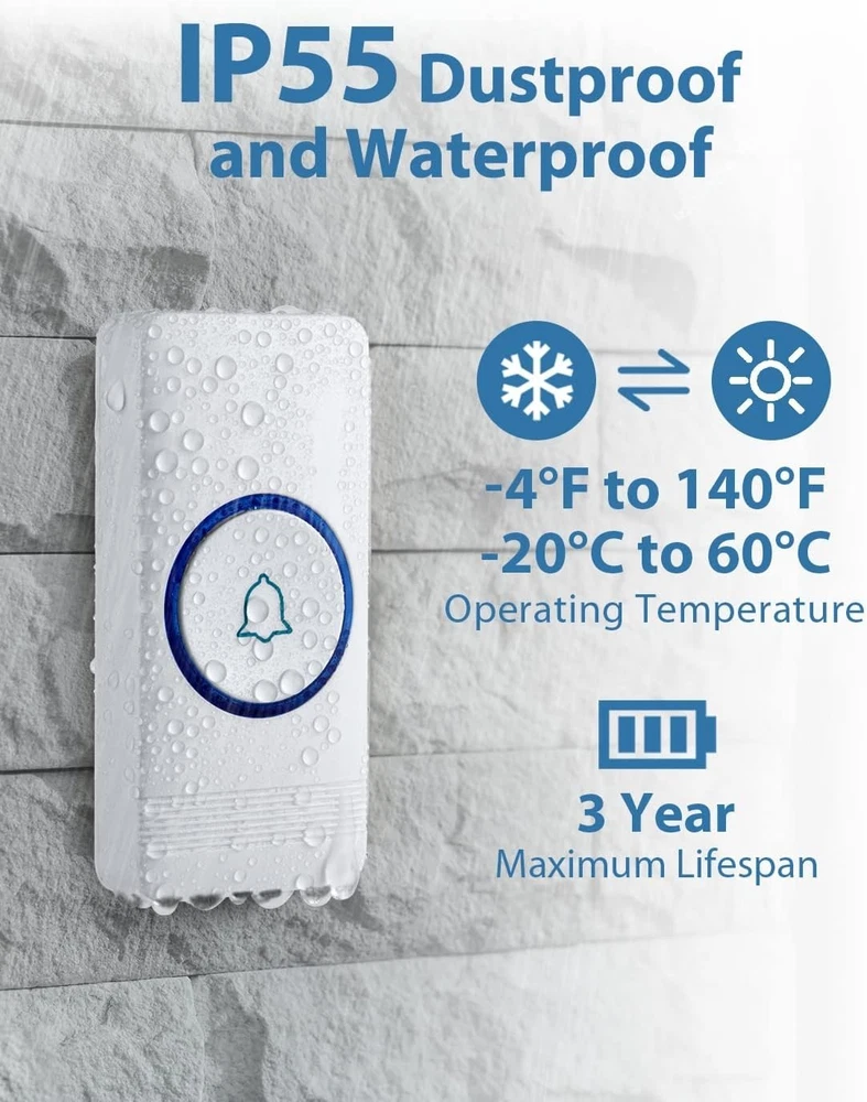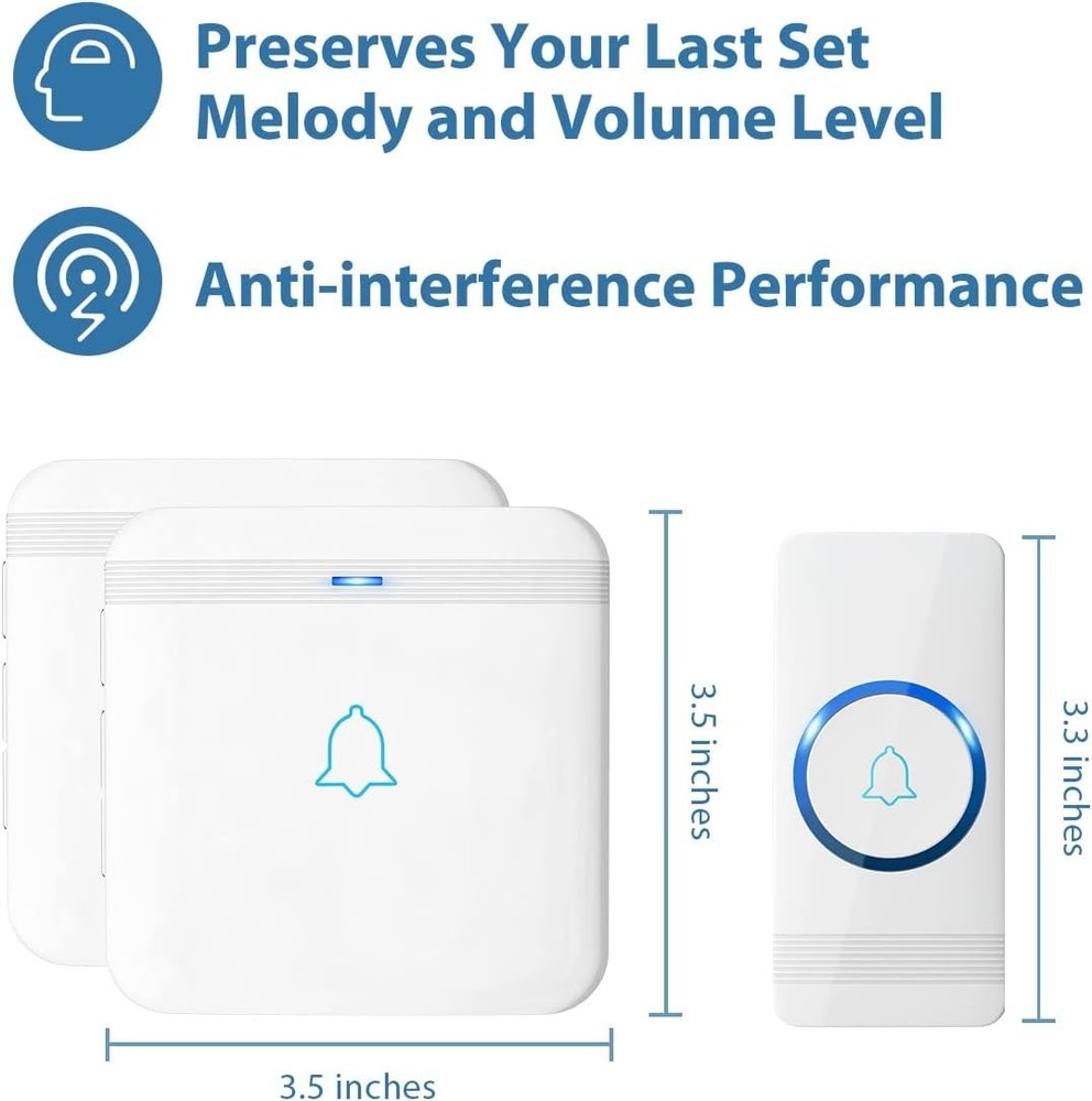 Wireless Doorbell - Waterproof with 1300 Ft Range and 52 Custom Melodies ‹ › ‹ › ‹ › ‹ › ‹ › ‹ › ‹ › ‹ › ‹ › Wireless Doorbell Your home deserves the best, and our Wireless Doorbell is designed to deliver both elegance and functionality with a perfect blend of innovation and style. Key Features: High Performance Transmitter: Ultra-low power consumption with a lithium battery boasting an impressive 3- lifespan. Weather Resistant: dustproof and waterproof design withstands harsh weather, operating flawlessly from -4 °F to 140 °F. 1300 FT / 400 M Wireless Range: Two plug-in receivers ensure you never miss a visitor, offering coverage across your home without interference. 52 Beautiful Melodies: Choose from 52 delightful chimes played through a rich 40 mm stereo speaker, with 5 adjustable volume levels peaking at a powerful 115 dB. Memory Function: Automatically retains your last melody and volume settings after a power outage—convenience at its finest! Easy to Set Up: Installation is effortless with included screws, anchor plugs, a key, and an adhesive patch, plus additional receivers can easily extend your coverage. Why Choose Our Wireless Doorbell? Imagine a doorbell that not only complements the beauty of your home but also provides you with unparalleled convenience. Our Wireless Doorbell combines durability and elegance, ensuring you are always aware of your visitors with beautiful melodies resonating through your home. Say goodbye to missed guests and embrace the effortless charm this doorbell brings. This is more than just a doorbell; it’s a statement piece that enhances your home’s ambiance while ensuring seamless communication. Elevate your entrance—order your Wireless Doorbell today! Shipping Free & Fast Shipping - We offer free shipping to most of the USA with a normal delivery time of 3-7 days. However, due to the current situation, additional delivery time (up to 3 weeks) may be required for some items. Alternative Carriers - We may use alternative carriers (e.g. USPS, FedEx, UPS, etc.) to ensure your package arrives safely and on time. Due to the use of multiple carriers, we are unable to provide a tracking number automatically. Handling Time - Orders are processed and shipped within 1-2 business days of receiving cleared payment. Shipping Restrictions - Shipping to Alaska, Hawaii, Puerto Rico, Guam, and other US territories may incur shipping charges or delivery restrictions. Please contact us before ordering, or your order can be refunded/cancelled. State Restrictions - There may be restrictions based on your state of purchase. For example, certain items may not be shipped to California due to state regulations. Contact for Tracking Updates - If you require tracking updates or have any concerns about the delivery of your order, please feel free to contact us, and we will be happy to assist you. Return 30-Day Hassle-Free Returns - We want you to be completely satisfied with your purchase. If you are not, you can return the item within 30 days of receiving it for a full refund or exchange. Easy Return Process - To start a return, simply contact us and we will provide you with a prepaid return shipping label and detailed instructions. Restocking Fee - There are no restocking fees for returns. However, the buyer is responsible for return shipping costs if the return is not due to a seller's error. Refund Processing Time - Refunds will be processed within 5 business days of receiving the returned item in its condition. Payment We accept all major credit cards, PayPal, and Apple Pay for your convenience. Your payment information is secure and encrypted to ensure a safe and seamless transaction. Please complete your payment within 3 days of purchase to avoid any delays in shipping. Feedback Your feedback is extremely important to us. We strive to provide the best products and customer service possible. If you are satisfied with your purchase, please take a moment to leave us a positive review. If you have any concerns or issues with your order, please contact us before leaving negative feedback. We are committed to resolving any problems and ensuring your satisfaction. Contact Us If you have any questions or concerns, please feel free to out to our customer support team. You can contact us through the eBay messaging system. We are available Monday to Friday, 9:00 am to 5:00 pm EST, and we will do our best to respond to your inquiry within 24 hours. Buy it now and enjoy a pleasant shopping experience! Voltage: 3 V Unit Quantity: 0.618 lb Material: Plastic Features: Waterproof,LED Flash,Memory Function,Adjustable Volume Power Source: Battery Items Included: Battery,Button,Screws,Plug-in Receiver,Transmitter,Anchor Plugs,Adhesive Patch,User Manual Suitable For: Home Type: Door Chime Connectivity: Wireless Number of Batteries: 1 Color: White Finish: Glossy Item Weight: 0.618 lb Style: Modern Button Material: Plastic Button Shape: Round Shape: Rectangle Power: 3 W Unit Type: lb