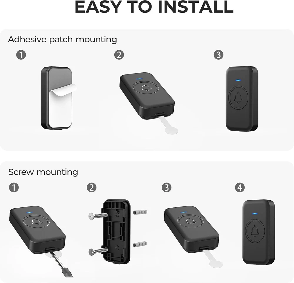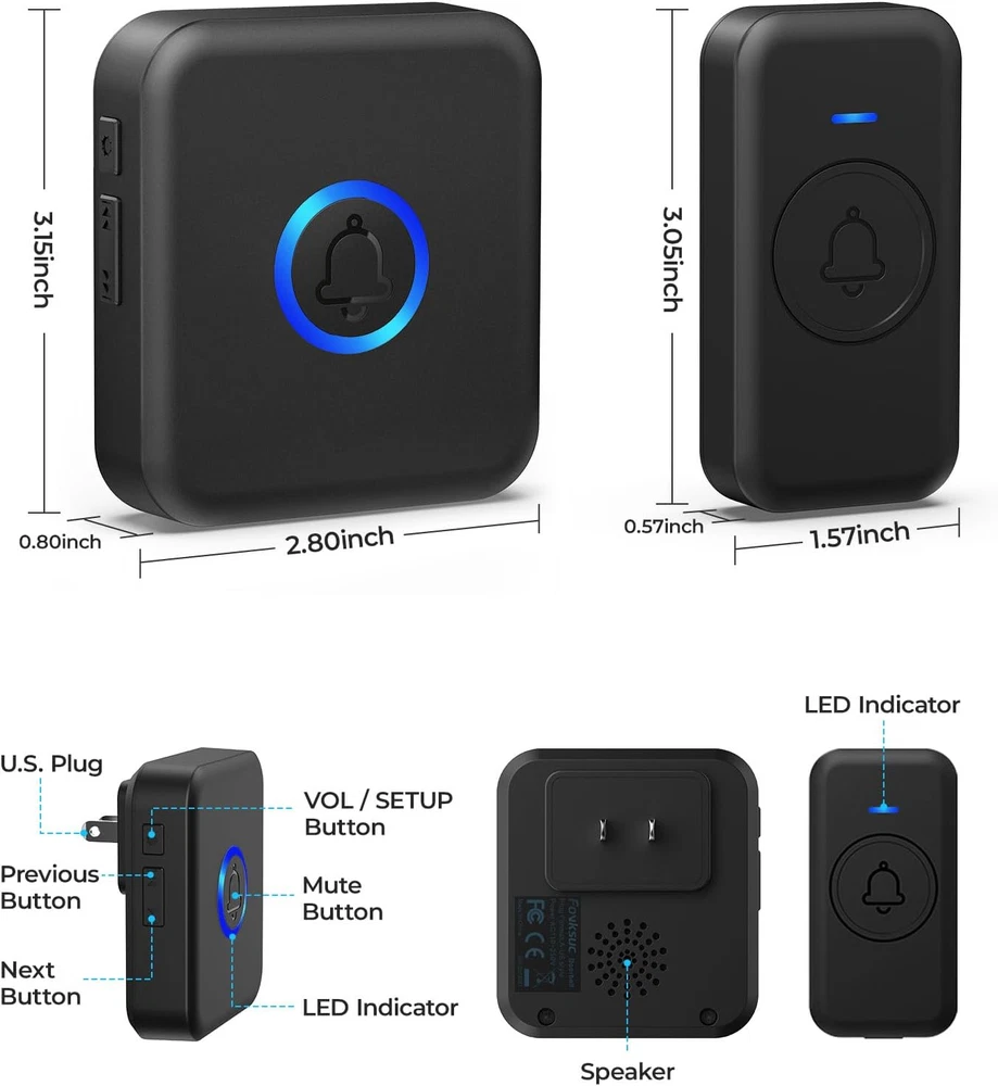 Store New Arrivals Add to Favorite View Feedback Contact Wireless Doorbell, Waterproof Door Bell with 60 Chimes, 5 Volume Levels & 2 Mute Modes, Loud Doorbells Wireless for Home Classroom Office (1 Receiver & 1 Button, Black, American Plug) Description Item model number U2-B-1T+1R Battery Cell Type Lithium Manganese Dioxide Power Source AC & Battery-Powered Performance Description Wireless Doorbells for Home / Classroom Doorbell Switch Style Push button Batteries Included? Yes Average Battery Life 3 years Batteries Required? Yes Product Dimensions 3.15 x 2.8 x 0.8 inches Material ABS Type of Bulb LED Shape Square Installation Method Self-Adhesive & Screw-In Temperature Range -4-140 Degrees Fahrenheit Description Pile 1 CR2032 batteries required. (included) Is Discontinued By Manufacturer No Included Components 1 × Transmitter (battery included), 1 × Plug-in receiver(American plug only), 1 × Adhesive tape, 1 × Screwdriver, 2 × Screw, 2 × Anchor, 1 × User manual Item Weight 3.52 ounces Special Features Adjustable Volume Optional Ringtone and Scrolling play Part Number U2-B Color Black Accessory Connection Type Wireless Batteries 1 CR2 batteries required. (included) Voltage 120 Volts Plug Format A- US style Size 1 Receiver 1 Button 【🎵Your Intelligent Wireless Doorbell】60 selected melodies to switch at will, the first ringtone preview mode, long press the button to listen to the prelude of each song for 2 seconds, easy to find your ‘welcome song’. 5-speed volume adjustment and mute mode, the baby's nap, the night rest will not disturb the family. 【🏡Boundless Guardian Precise Response】With a 1000-foot reception distance and a maximum volume of 110 decibels, the tone can be heard clearly in your apartment, office or classroom. For families, it's your guardian butler; for teachers, it can help keep your classroom quiet and focused. 【⚡3s to Complete the Installation】No wiring required! The receiver is plug and play, with stickers easily on the wall. Power Failure Memory automatically saves preferences, and still remembers your favourite Canon ringtone and comfortable volume after an unexpected power outage, just like having a caring electronic housekeeper. !!!Please note that our products are only suitable for U.S. plugs, if you use in other countries need to provide their own converter!!! 【🔋High-quality Protection】Stable operation from -4 °F to 140 °F, heavy rain, snow and sunshine, replaceable CR2032 coin cell battery with 3 years of long life (5 measurements per day), and IP55 waterproof button can withstand the wind and rain. Dual EU CE/US FCC certifications for safety and security every time. 【🛡️Professional After-sales Guarantee】If the doorbell kit for home have any problems during use, you can contact us directly through Amazon for after-sales service, we have a professional customer service team and experts to provide you with the pre-sales and after-sales service. FOVKSUC is always at your side! Product Description 1 Centre Mute Mode 2 60 Chimes 3 Memory Function 4 110dB Loud Enough Durable Waterproof Button The buttons are waterproof up to IP55, ensuring perfect use even in heavy rain, snow and scorching sun. It can operate between -4°F and 140°F. Long Operating Range 1000ft reception distance, whether it is a duplex or a single flat, even if on a rainstorm day and presses lightly, you can still hear the alert. Coloured LED indicators When the button is pressed, not only does the transmitter's indicator light up, but the LED on the receiver also flashes. 3 Years Battery Life The pushbutton transmitter uses a CR2032 lithium battery, which has an extremely long life of up to 3 years(5 measurements per day). The video showcases the product in use. The video guides you through product setup. The video compares multiple products. The video shows the product being unpacked. doorbell for home Merchant Video FOVKSUC Wireless Doorbell Kits Add to Cart Add to Cart Add to Cart Add to Cart Add to Cart Customer Reviews 4.7 out of 5 stars 1,001 4.7 out of 5 stars 473 4.7 out of 5 stars 473 4.7 out of 5 stars 473 4.7 out of 5 stars 473 Price $9.99 $ 9 . 99 $10.99 $ 10 . 99 $15.99 $ 15 . 99 $10.99 $ 10 . 99 $23.99 $ 23 . 99 Included Components 1 Receiver + 1Transmitter 1 Receiver + 1Transmitter 2 Receivers + 1 Transmitter 1 Receivers + 1 Transmitter 3 Receivers + 2 Transmitters Ringtone 60 60 60 60 60 Wireless Range 1000FT 1000FT 1000FT 1000FT 1000FT Power Source AC plug-in + CR2032 battery AC plug-in + CR2032 battery AC plug-in + CR2032 battery AC plug-in + CR2032 battery AC plug-in + CR2032 battery Automatically browse Function ✔ ✔ ✔ ✔ ✔ Memory Function ✔ ✔ ✔ ✔ ✔ Waterproof IP55 IP55 IP55 IP55 IP55 One-touch mute Function ✔ × × × × How to use Scrolling Play Function? You can save your time by long pressing the long button on the side of the receiver to automatically browse so you don’t have to push each time to change the chime sounds. How to reset? Hold down wireless doorbell receiver vol/setup button and plug it into an outlet, after playing the beep twice and LED indicator on, all settings will return to factory defaults. How to set a new tones for FOVKSUC doorbell? Press this Previous or Next button selecting the Chimes, Pressing and holding the Vol/Setup on the receiver for 5s,the receiver will LED indicator on,which means receiver get into pairing mode ,press the transmitter is ok. Is the transmitter of this doorbell suitable for use outside the door? The push button has a high waterproof rating of IP55, which is higher than ordinary doorbells, to ensure the perfect usage in rainy days. Works between -4°F to 140°F, withstands various harsh weather conditions. Is the wireless doorbell randomly chimes through-out the day without the button being mashed? The door bell uses interference suppression solution to ensure that if the doorbell button is not pressed, the receiver will not ringer by mistake. ABOUT US We offer