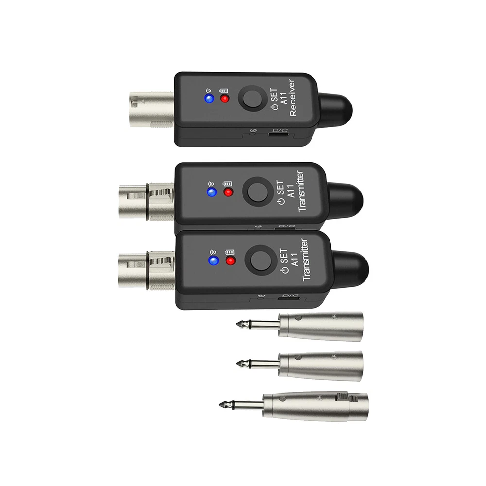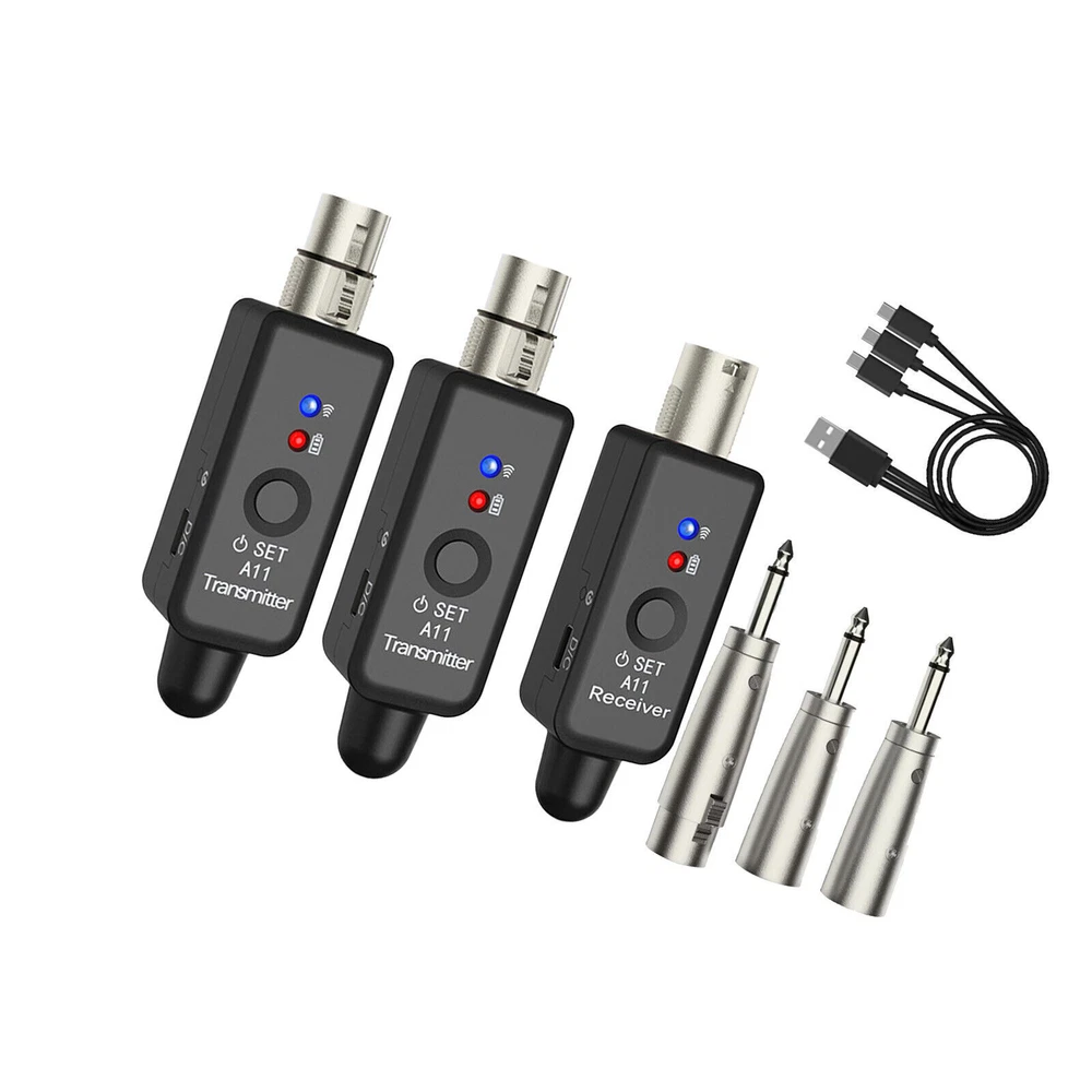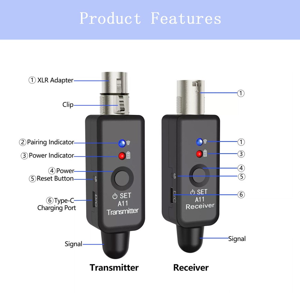 [Professional Wireless Transceiver Systems] The A11 Wireless Microphone System Upgrade features dual transmitters and the latest wireless UHF frequency transmission technology,2.4GHz band is optimal for Microphone wireless, Solid RF connection over a 100 feet range, uncompressed wireless signal transmission, low noise and latency. [Crystal Clear Sound] Enjoy high-resolution 24-bit/48kHz audio with a wide 20Hz to 20kHz frequency response, delivering detailed sound at any volume, supported by up to 108 dB signal-to-noise ratio and a dynamic range of 108 dB for exceptional clarity. [Ultra-Low Latency] Experience virtually no lag with less than 4ms latency, perfect for live performances. [Long-Lasting Battery] Perform without interruption with up to 5 hours of battery life. Both the transmitter and receiver come with rechargeable batteries, ensuring you're always ready to go. [Super Easy to Use] Small and delicate, no complicated settings, plug and play design is convenient to use. You would find that the XLR wireless transmitter and receiver works very well for you and your setup from the moment you begin to use it! [Stable and Flexible] Designed for professional dynamic / harmonic / condenser microphones, the A11 features recording-level sound transmission quality, and a stable and reliable wireless signal. This flexible and portable wireless solution accommodates a wide range of microphones—use your favorite! The A11 system is suitable for recording studios, music and theatre performances, public speaking, videography, outdoor use and more. Please Note: Communication is the best way to solve the problem.Your satisfaction is our top priority. We appreciate your positive feedback! We have always been committed to providing the best service and reliable products to every customer. However, accidents may occur at times, and we understand your concerns and setbacks. Please contact us to resolve the issue before leaving negative feedback. We will reply to you as soon as possible. If there is no response within 24 hours, please check the email in your email. Our goal is to provide first-class customer service, so we usually do our best to solve any problems! (Note: Weekend Information Will Be Replied on the Next Working Day)