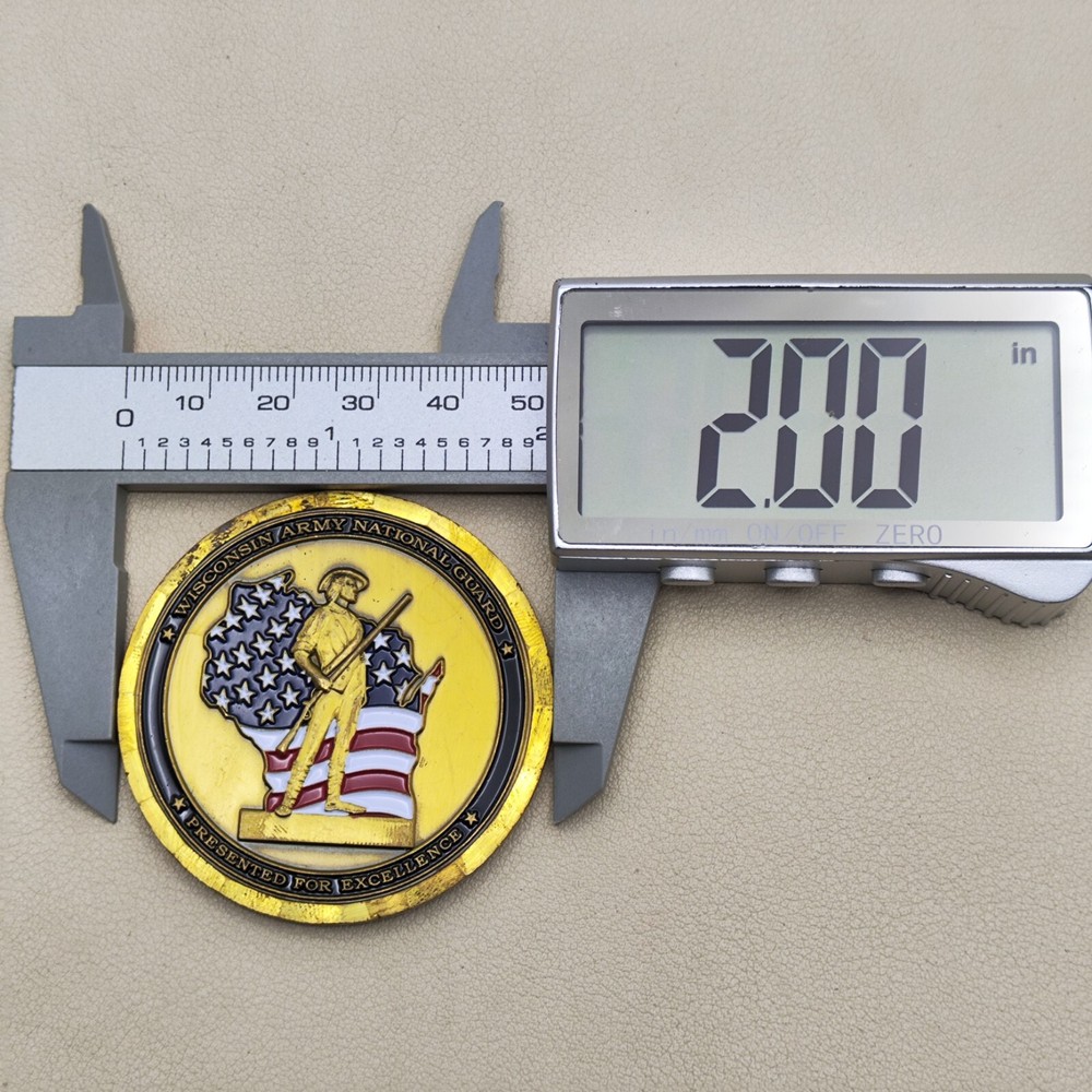 TITLE: Wisconsin Army National Guard Presented for Excellence Challenge Coin SIZE : Measures Approx 2" Used coins are inevitably flawed please see pictures PAYMENT : We support multiple payment methods and ship within 5 days of payment SHIPPING : We offer free shipping, and your purchase will be carefully packaged and sent to you with tracking information through eBay SERVICES : You can contact us at any time if you have any questions, We will get back to you as soon as possible to solve your problem If you are not satisfied with your purchase for any reason, Please contact us before leaving neutral or negative feedback and we will solve the problem properly for you