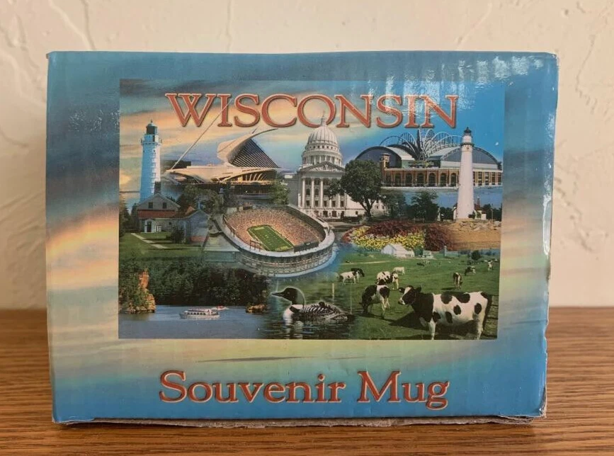 This Souvenir mug features a multi-color design inspired by iconic images from the State of Wisconsin including Lambeau Field, American Field, Lighthouses, Cows and many others. 3 1/4" Wide Rim, 3 3/4" Tall Brand new from our gift shop located in Green Bay, WI. Check out our other listings. We can combine shipping.