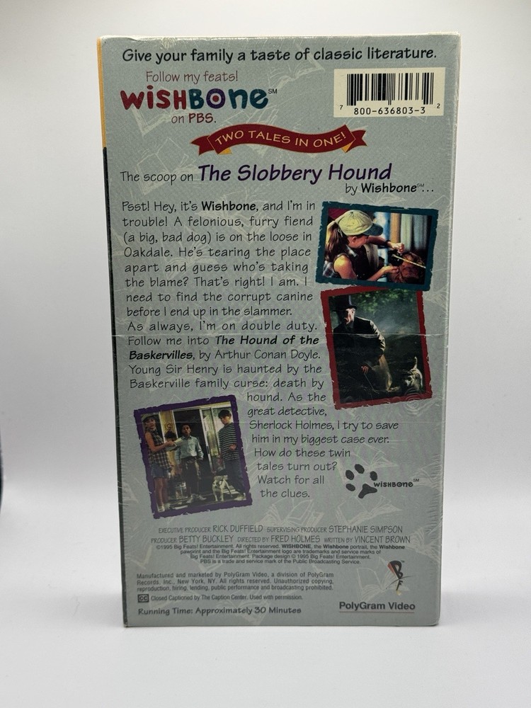 Sub-Genre: Live-Action UPC: 0780063680332 Director: Fred Holmes _desc_: Wishbone is a cute terrier who teaches children about classic literature through his adventures. In 'Wishbone the Slobbery Hound', children are introduced to the classic the 'Hounds of Baskerville'. In this episode, a new stray dog starts hanging out in the neighborhood and begins wreaking havoc, but, Wishbone is the one who is getting the blame for all the mischief. As Wishbone takes on the role of Sherlock Holmes in order to get to the bottom of what's been going on, he gets help from his best friends Samantha, David, and Joe. Together the four friends work together to prove Wishbone's innocence. Rating: NR Genre: Children's & Family Format: Vhs Release Date: 19960227 gtin13: 0780063680332 Movie/TV Title: Wishbone-The Slobbery Hound Signal Standard: NTSC