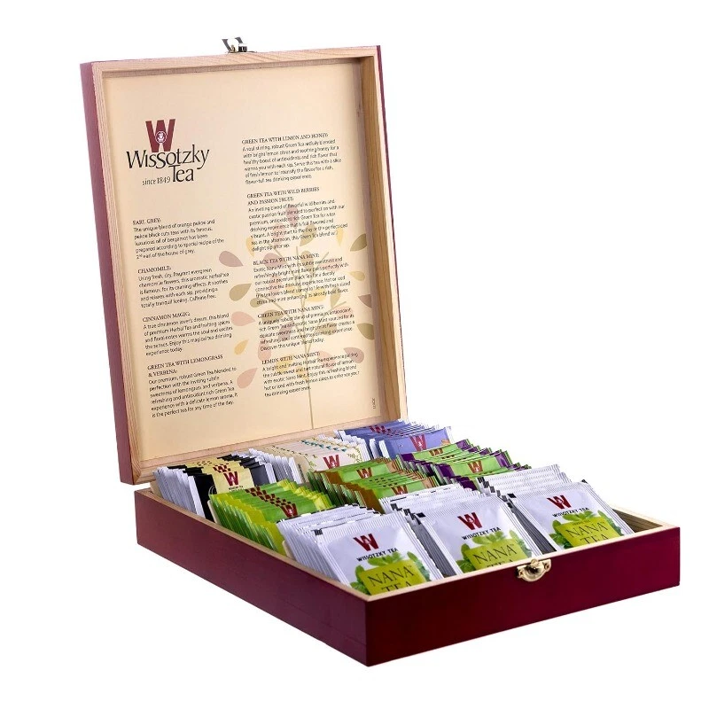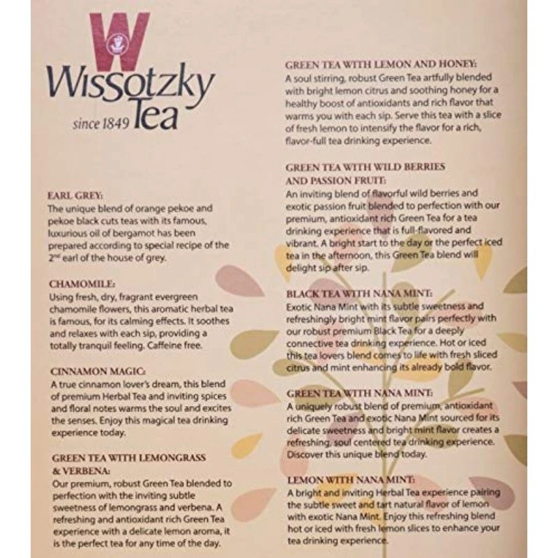 Product Description World renowned since 1849, Wissotzky tea offers a tempting selection of 80 assorted teas. Wissotzsky Blood Orange & Mandarine Tea - A citrus orchard teaming with vitamin C. An exhilarating of tart Blood oranges and sweet Mandarines gives this infusion its unique flavor. Wissotzsky English Breakfast Tea - English Breakfast is a blend of the finest tea leaves growing in the hilly areas of Ceylon, India and Kenya. A classic blend based on the famous English tradition which makes a refreshing stimulating beverage. Wissotzsky Classic Tea This special home blend of superior quality black teas from India, Africa and Ceylon has been produced for nearly 160 years. A strong, full bodied tea blend with a rich flavor and aroma. Wissotzsky Earl Grey Tea - This unique blend of orange pekoe and pekoe black cut teas with its famous, luxurious natural oil of bergamot has been prepared according to the special recipe of the 2nd Earl of the House of Grey. Mediterranean Spearmint Wissotzsky Mediterranean Spearmint NANA Tea - A celebrated Mediterranean tradition with a cool refreshing breeze. The finest blend of selected tea leaves and fresh spearmint gives this aromatic infusion its unique scintillating flavor. Wissotzsky Chamomile Tea - Using fresh, dry, fragrant evergreen chamomile flowers, this aromatic herbal tea is famous, for its calming effects. It soothes and relaxes with each sip providing a totally tranquil feeling. Caffeine Free. Wissotzsky Cherry Tea - This mixture of the finest tea leaves with cherries, Hibiscus, and other fine ingredients gives you an unique dark red drink that combines tea with the natural flavor and aroma of cherries. – Wissotzsky Wildberry Tea - An exquisite blend of wild forest berries, blackberries, blackcurrant and raspberries creates an infusion with a rich flavor and fragrant aroma. Caffeine Free.