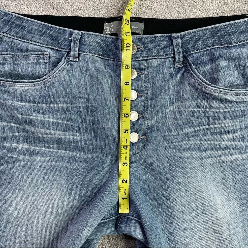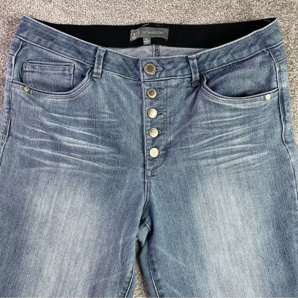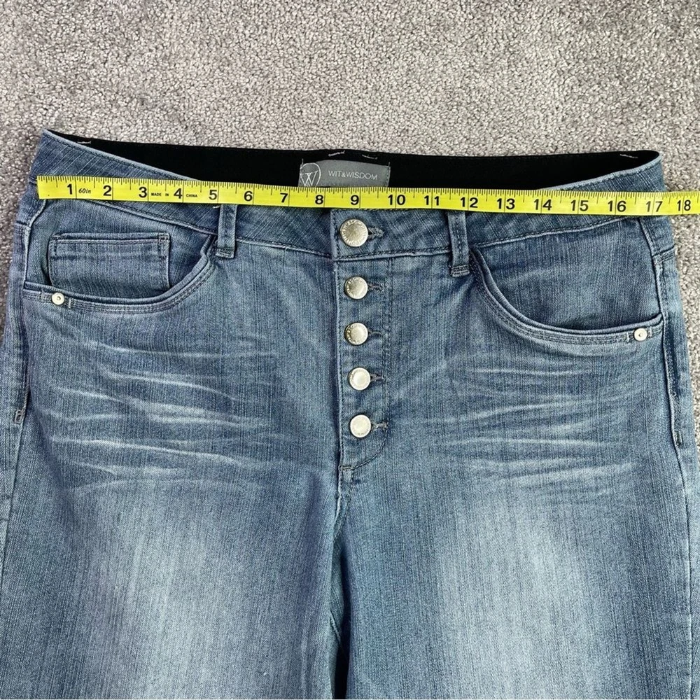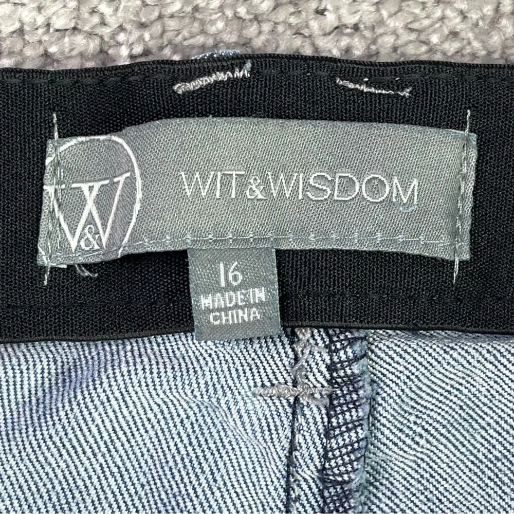 Type: Jeans Material: Cotton Blend Waist Size: 34 in Fabric Wash: Light Department: Women Style: Straight Accents: Logo Brand: Wit & Wisdom Theme: City, College Closure: Button Rise: High (Greater than 10.5 in) Fabric Type: Denim Personalize: No Handmade: No Size: 16 Country/Region of Manufacture: China Color: Blue Seller Notes: “In excellent, pre-owned condition with no flaws to note.” Features: Pockets, Shaping, Slimming, Stretch Inseam: 27.5 in Size Type: Plus Season: Fall, Spring, Summer, Winter Pocket Type: 5-Pocket Design Fit: Regular Pattern: Solid Vintage: No