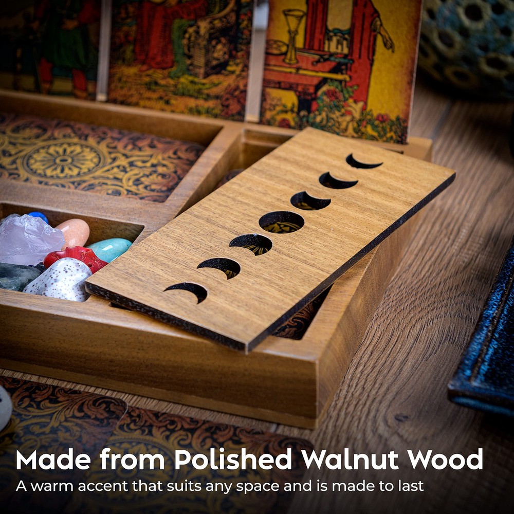 Find Deeper Meaning & Answers –– Prominently display your cards for profound contemplation. Share your skills and make your readings more memorable with this tarot card holder stand. Display daily affirmation cards with this wiccan decor. A Striking Centerpiece –– Looking for the missing piece to complete your altar supplies? This card display stand has multiple compartments to store your tarot decks, precious gems, and other treasures. Store everything you need in one place to enhance the strength of your readings. Harness Mythical Movements –– Invite the powerful symbol of rebirth and transformation into your life. The cover of this box for tarot accessories is carved with the various phases of the moon. This tarot decor box is a potent reminder of change, with an energy that enchants. Grains of Grandeur –– This wiccan altar box easily suits any style you select to adorn your sacred spaces. It has a timeless wooden design and is crafted with the utmost care. The authentic wooden grains make each holder completely one-of-a-kind. Light Up Their Eyes –– Tired of boring gifts that lack character? Give the tarot enthusiast or spiritual person in your life something that aligns with their values. This crystal organizer will become a treasure all its own as they fill it with their most valued possessions.