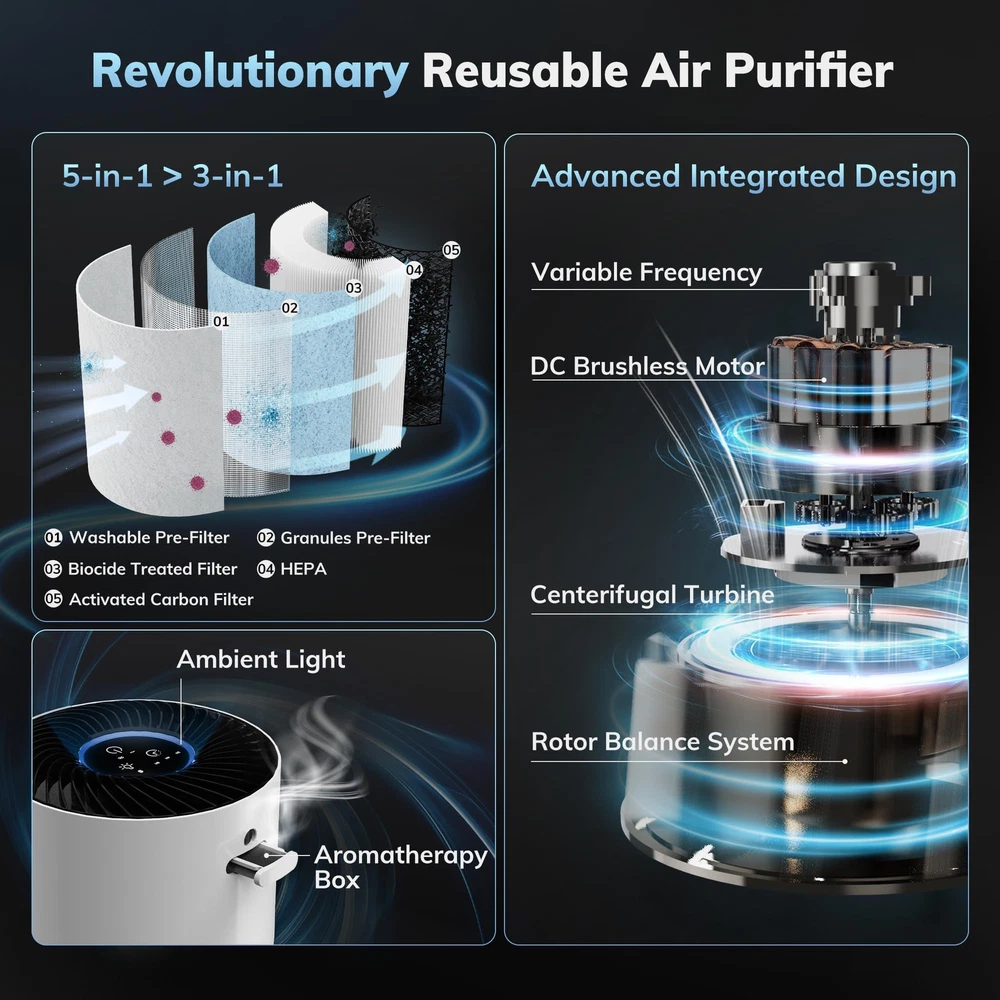 【Prioritize The Filter To Enjoy Better Breathing】Filter is soul of air purifier. Only 5-in-1 filtration is true filtration, just no budget burden is true savings, progressive pre-filtration and self-developed long-lasting HEPA filter make the lifespan up to 12 months, and expanded area is 30% higher than common filter. 's pioneering YearChange filter——a game-changer redefines your imagination for good filter. 【YearChange Filter Break Your Budget-Worry】Clean air should not be luxury. filter equipped progressive pre-filtration and Self-developed long-lasting HEPA filter, regular cleaning to achieve YearChange (similar products change 1-3 months), even the air quality is poor, the life-span still about 6 months, 4X of similar products. Filter only 9.99, independent production is long-term supply, eliminating middleman. (Test standard base on GB/T 18801-2022, which conducts relevant tests on particle purification.) 【Only 5-In-1 Filtration Is The First Choice】Advanced progressive 5-in-1 HEPA filter, five layers of filters each perform their duties, sufficient materials, visible activated carbon particles, no black cotton deception; as the filter size increases, the filtration area increases by 30%, giving you stronger protection, efficient filtration of smoke, pollen, particulate matter and harmful gases. 【White Noise Outdated? Pink Noise Is The Real Quiet】The industry's first air purifier with pink noise is more natural and comfortable than white noise, allowing you to feel the breath of nature; Breaking through critical issues in the industry, more stable and uniform low-frequency sound, without the whistling sound like scratching glass; The first level is only 19dB, combined with low-frequency sound, is more suitable for sleeping. 【DC VFD Brushless Motor Should Be A Must-Have】's DC brushless motor significantly reduces energy consumption and is equipped with permanently lubricated bearings to effectively reduce friction and noise. The motor uses pure copper wire instead of outdated aluminum wire to ensure a longer lifespan. The VFD (Variable Frequency Drive) technology makes the operation more stable and smoother, entry-level also has high-end enjoyment. 【Thousands Of Tests Just For The Most Comfortable Experience】's centrifugal turbine and motor are integrated to save space and more compact. It is equipped with Rotor Balance System, 35-degree air cut angle, 11 blades, and a streamlined air outlet. Every wisp of wind meets the Coanda effect, let you feel the most comfortable wind flow, just like the breath of nature. How to achieve? Thousands of tests make perfect! 【Pick Without Second Thoughts】adheres to the principle of long-termism, passed CARB (zero-ozone), EPA, FCC, ETL certification, and provides a three-year coverage. Upgraded aroma box material will not be melted by essential oils, just for you to use with confidence. 【Entry-Level Also Have Smart Experience】To ensure the and safety of you and your family, 's air purifier is equipped with a Smart Timer Chip, 2200-hour filter clean reminder, a red indicator light will illuminate to remind you to wash the Washable Pre-fliter; 2H-4H-8H-Continuous opeartion for you to choose, give you complete peace of mind in daily use. Equipped with an adjustable ambient light, immerse yourself in the enjoyment of fresh air.