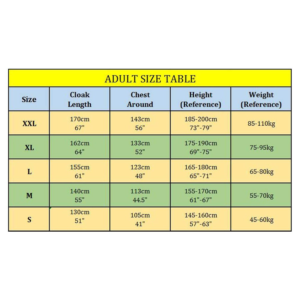 This wizard hooded robe made of 100% polyester,not thin not thick,comfortable on wear. Wizard Tunic Hooded Robe makes a Fun Dress up to Wear to Movie Premiers and Costume Parties Hooded cloak can be used to any cosplay ,like Wizard , Witches , Jedi , Warlocks , Sith , Vampires , Sorcerers etc. Adult Size of hooded robe : S : Length 51", Bust 41", Height 57-63" , Weight :100-130lbs ; M : Length 55" , Bust 44.5" , Height 61-67" , Weight :120-150lbs ; L : Length 61" , Bust 48" , Height 65-71" , Weight :145-180lbs ; XL : Length 64" , Bust 52" , Height 69-75" , Weight : 165-210lbs ; XXL : Length 67" , Bust 56" , Height 73-79" , Weight :180-240lbs. Size of hooded robe: S : Length 37" , Bust 35" , Fits Height : 46"-51" ; M : Length 41" , Bust 38.5" , Fits Height : 51"-58" ; L : Length 44.8" , Bust 40" , Fits Height : 56"-61" ; XL : Length 49" , Bust 42" , Fits Height : 61"-65".