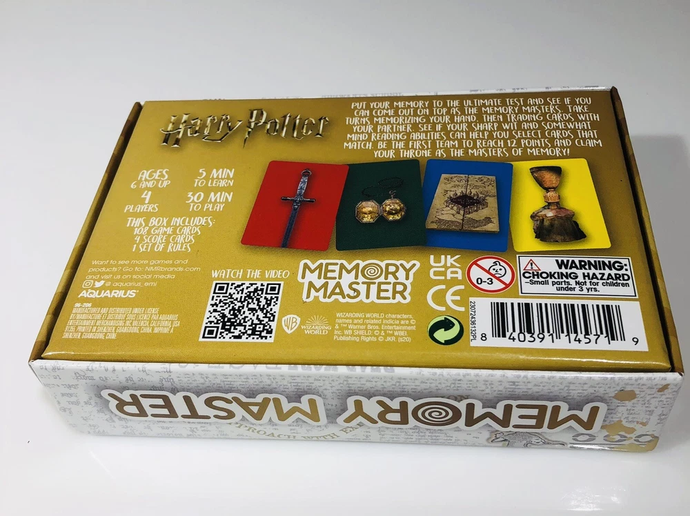 This Wizarding World of Harry Potter Memory Master A card game is perfect for any Harry Potter fan. With a variety of age levels, including 12-16 years, 8-11 years, 4-7 years, and 17 years & up, this game is suitable for everyone. The game is a memory game and is perfect for players who want to test their memory skills. The game includes cards with different themes and characters from the Harry Potter franchise, making it a fun and exciting game for players. The Memory Master A card game is manufactured in China by Aquarius, a trusted brand in the gaming industry. This game is part of the Board & Traditional Games category and is recommended for ages 6 and up. The game is ideal for both boys and girls and can be played with a minimum of 4 players. This game is perfect for anyone who loves Harry Potter and wants to test their memory skills.