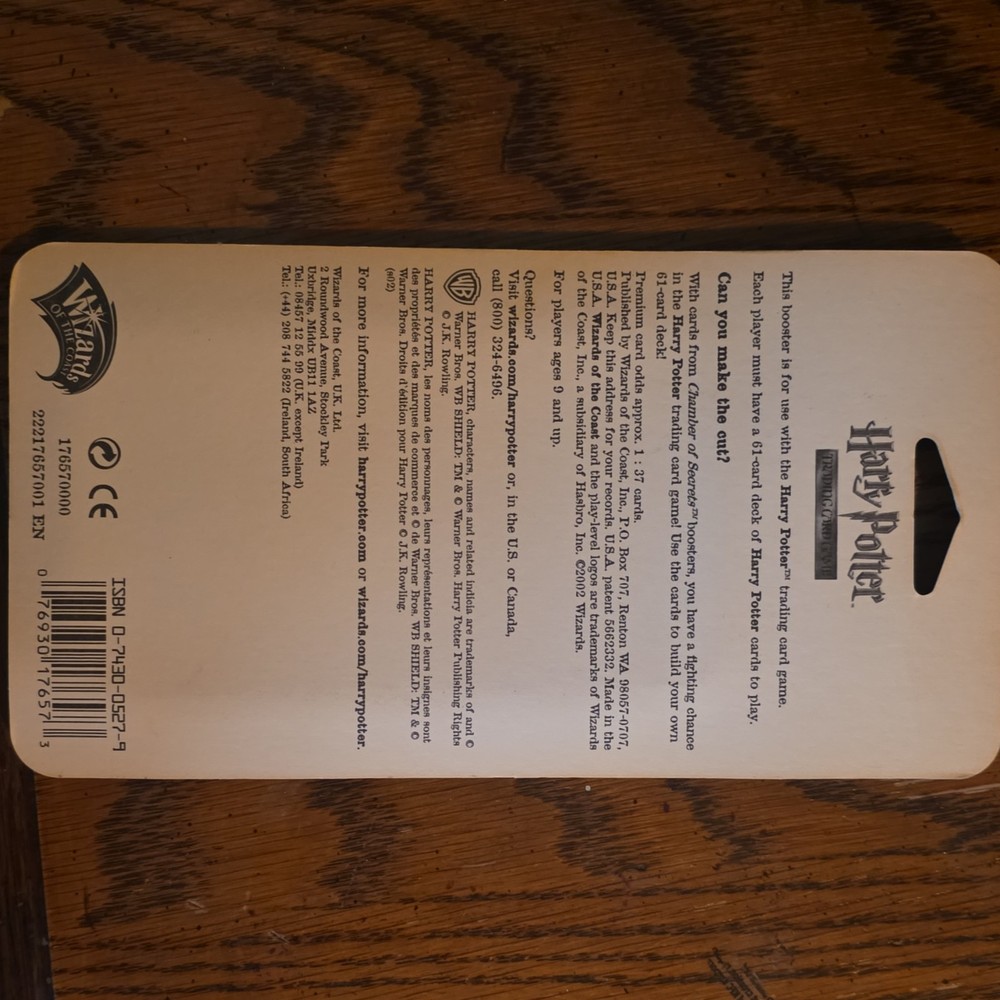 Number of Packs:1Age Level:8+Features:BoosterGenre:Fantasy, TV & MoviesSet:Harry Potter Chamber of SecretsType:Non-Sport Trading CardManufacturer:Wizards of the CoastMaterial:Card StockMPN:2267430000Character:DobbyCard Size:StandardYear Manufactured:2002Language:EnglishNumber of Cards:11Franchise:Harry PotterConfiguration:PackMovie:Harry Potter and the Chamber of Secrets