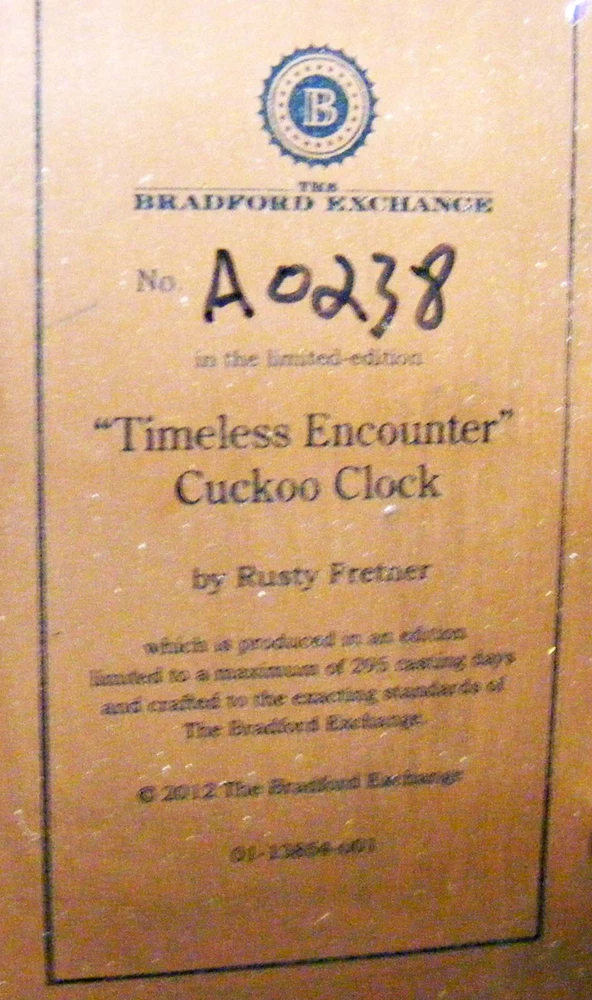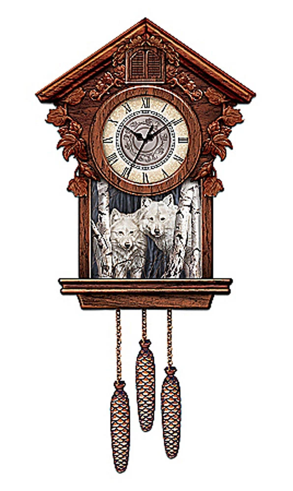 From a recent estate we offer this fabulous coo-coo clock. We inserted a new battery (not included), have let it run about 2 weeks and it has worked perfectly. It's in wonderful condition; the little bird pops out and chirps regularly and it has kept great time. We didn't have a place to hang it so we took photos while it was laying down. Then we found the clock online - the first photo is borrowed to show how it looks when hanging. Following is additional information we found about this clock: "Wildlife artist Rusty Frentner is renowned by collectors for his stunning portraits of majestic wolves. Now you can enjoy his artistry in a brand-new way, in this striking wolf art cuckoo clock graced with a breathtaking portrait of two white wolves! You're sure to be captivated by this acclaimed artist's magnificent artwork, showcased on the front of this beautiful timepiece. This ONE-OF-A-KIND wolf art cuckoo clock is the perfect addition to any decor and is available exclusively from The Bradford Exchange. Handcrafted of wood and embellished with sculpted artist's resin details, this precision timepiece features an accurate quartz movement, traditional hands and Roman numerals. A red oak- colored finish and decorative brass-toned pine cones add to the cuckoo clock's flair. Plus, at the top of each hour, the doors above the clock's face open to reveal a sculptural cuckoo that chirps to announce the hour!" b32