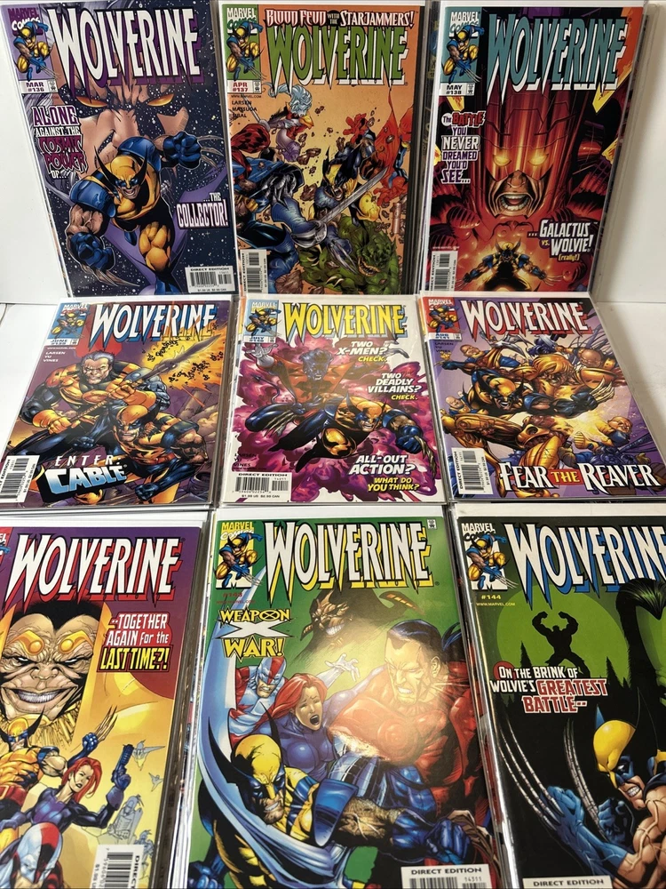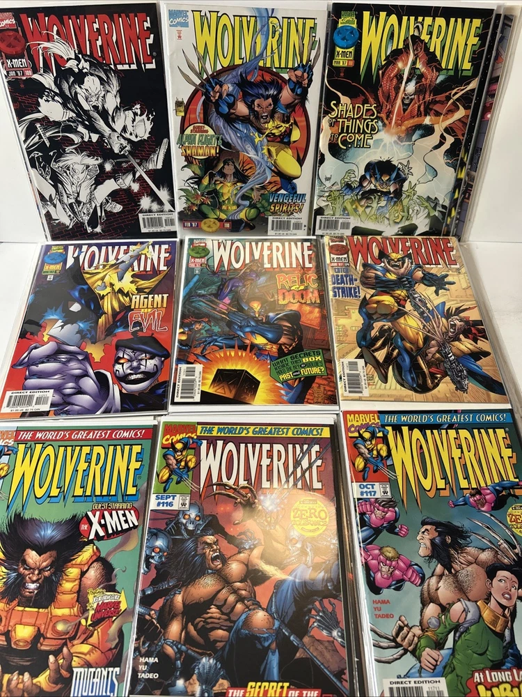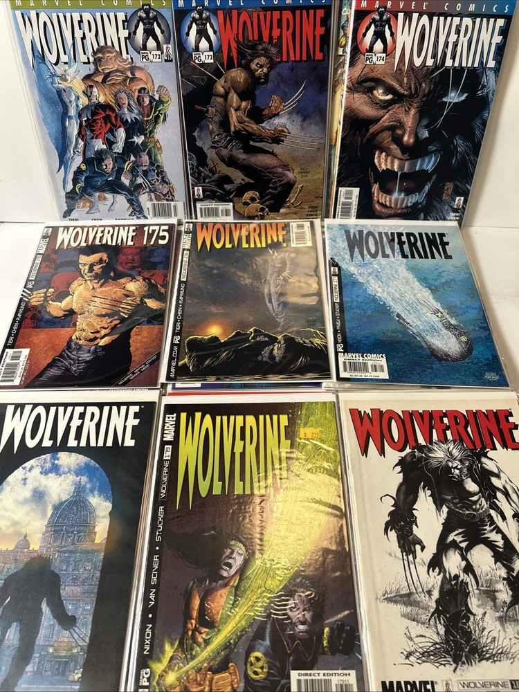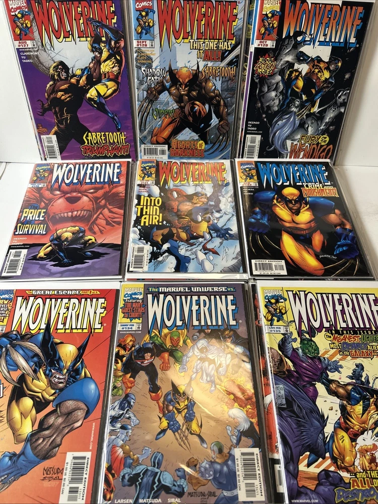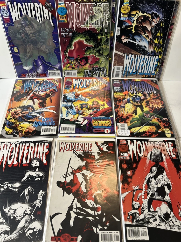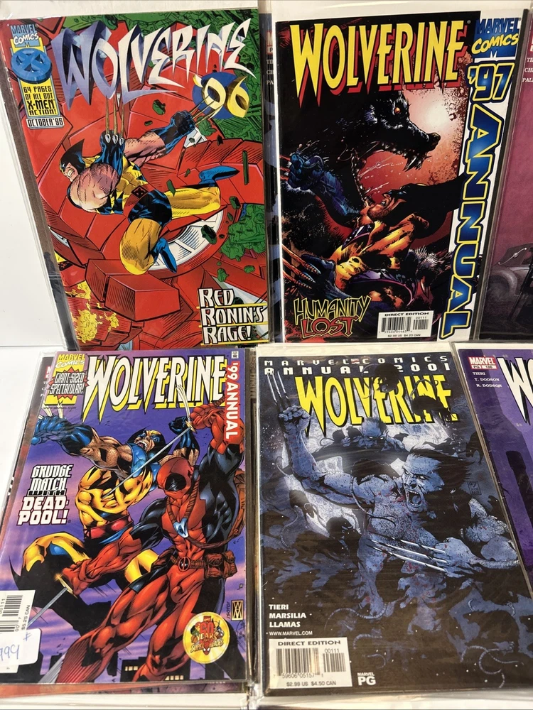 Wolverine Volume 2 Complete Run #1-189 With Most of the Annuals and all of the Keys #1-189 Complete Annual ‘96, ‘97, ‘99, ‘01 Mostly FN/VF-NM 1 (VG+) 83 (FR) The product is a complete run of Wolverine comic books from issue #1 to #189, including annuals and key issues. This set includes works by artists and writers such as John Buscema and Chris Claremont, featuring the character Wolverine from the X-Men series within the Marvel Comics universe. As a key issue set, this collection holds value for comic book enthusiasts and collectors looking to complete their Wolverine series run.