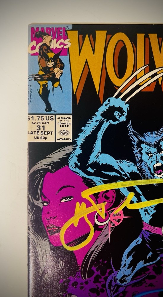This product is a rare and highly sought-after comic book, Wolverine #31 from 1990, signed by Stan Lee, Hugh Jackman, Marc Silvestri, and Larry Hama. The comic features the main character Wolverine from the X-Men universe, with artwork by Marc Silvestri and writing by Larry Hama. This first printing, 1st edition comic is a valuable collector's item for fans of Wolverine and the Marvel (MCU) universe, showcasing the iconic character in action and adventure within the copper age of comics.