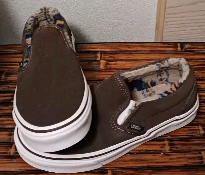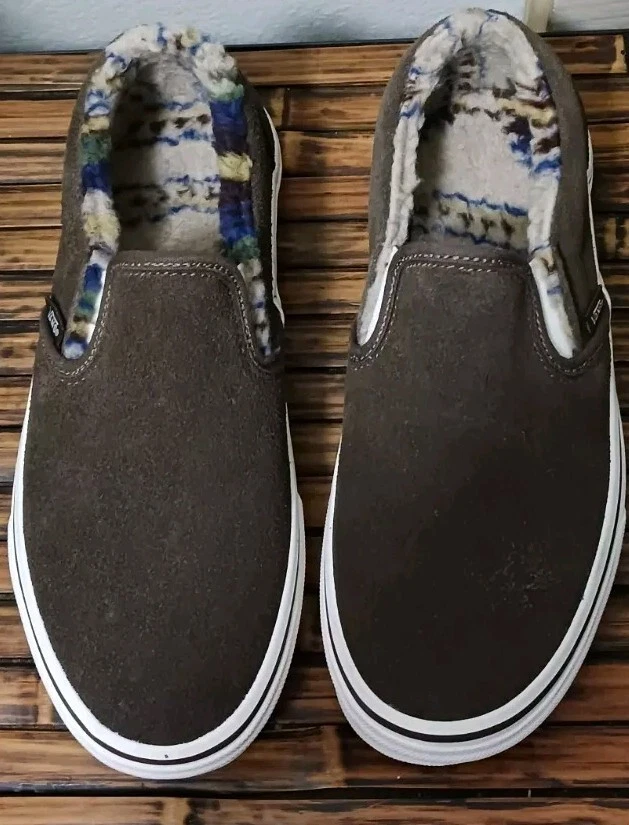 This woman's Vans Classic Slip-On sneaker in size 7 features a chocolate brown suede upper with an Aztec-inspired design. The slip-on style makes it easy to wear, and it is lined with cozy faux fur for added comfort. Perfect for casual, activewear, or workwear occasions, this shoe is suitable for activities like walking, school, and skateboarding. With a retro and colorful theme, this Vans model offers a classic and stylish option for women looking for both fashion and functionality in their footwear.